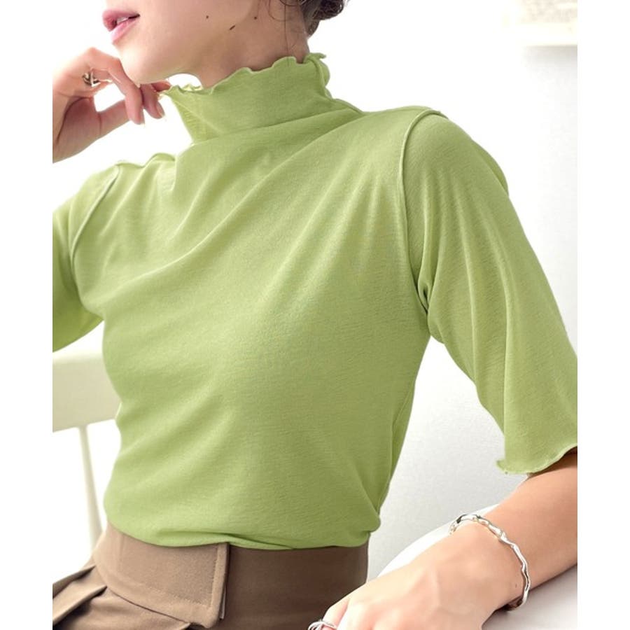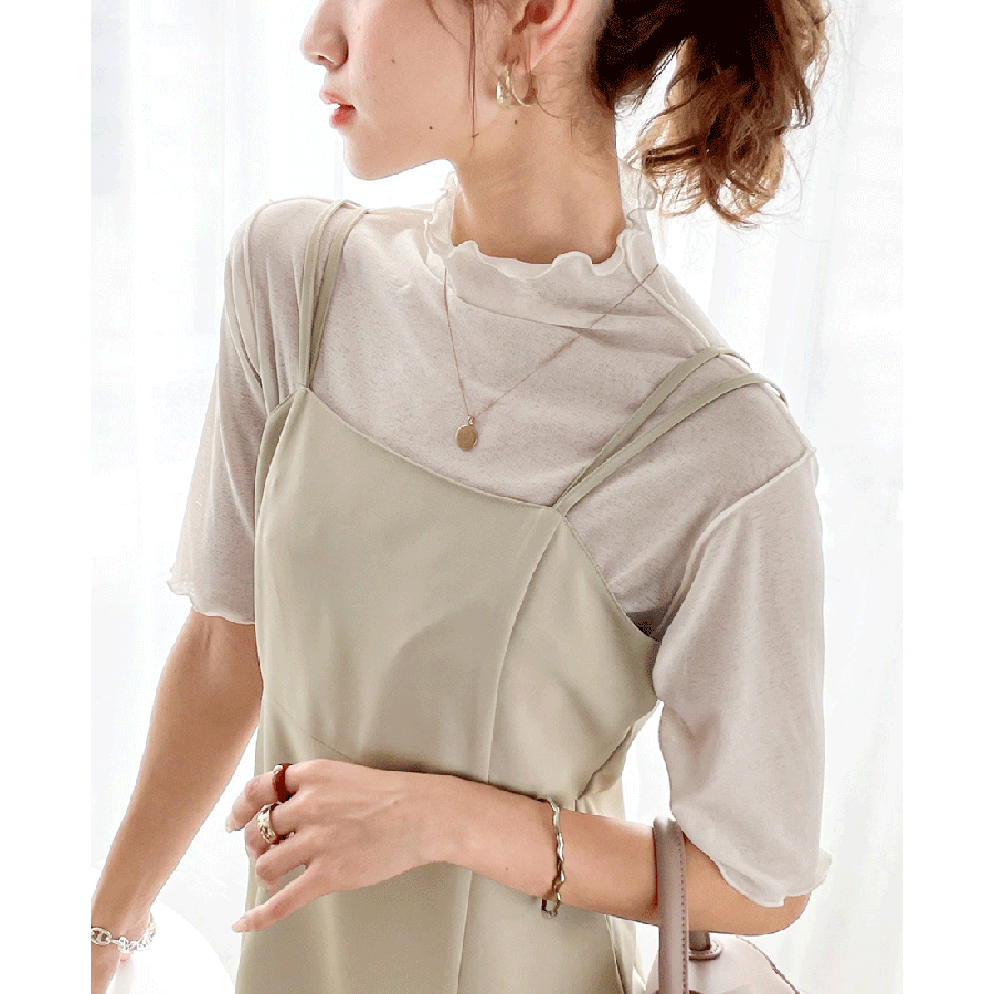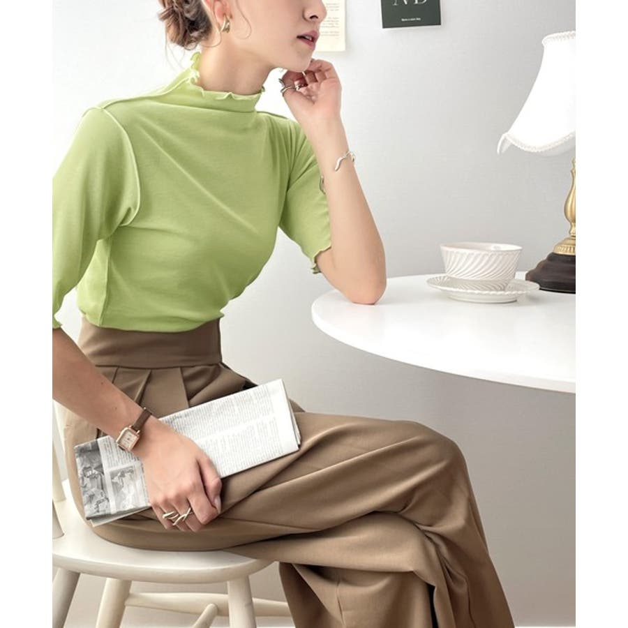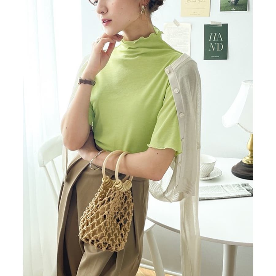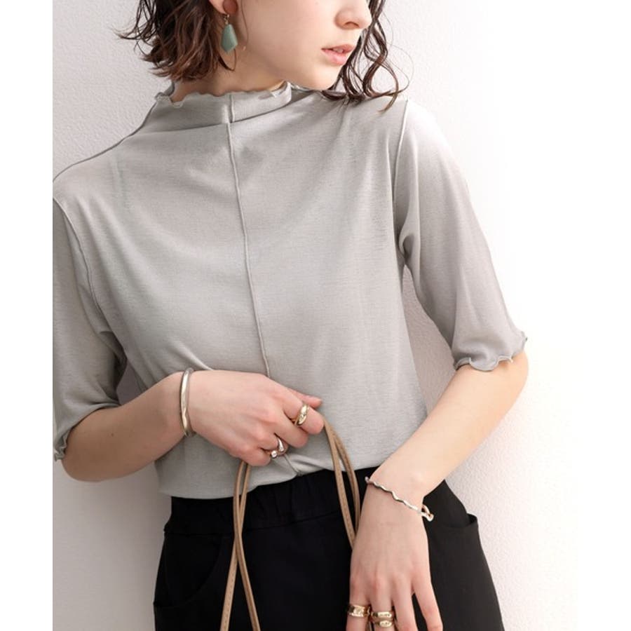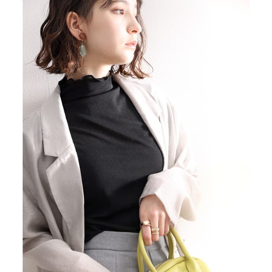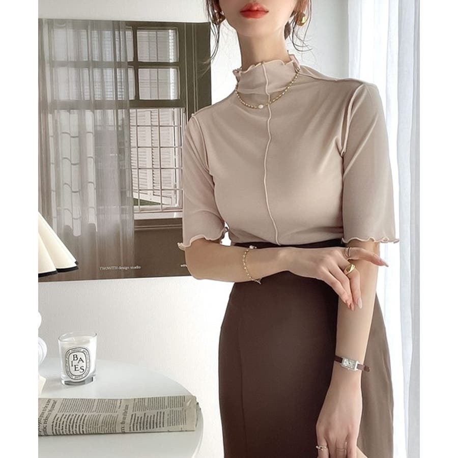 透け感のあるシンプルなハイネックトップス。
