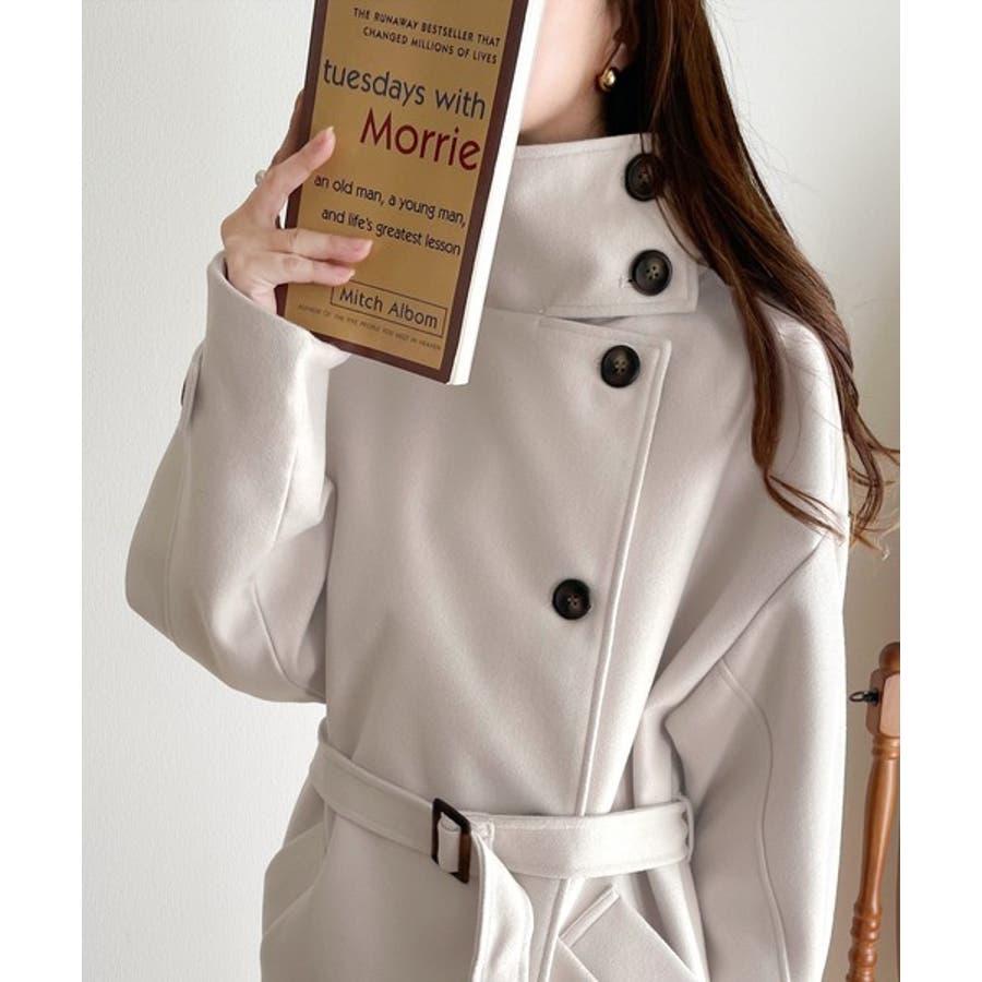 印象的なスタンドカラーのニットモッサロングコート。
