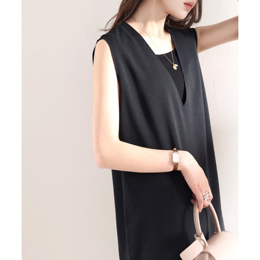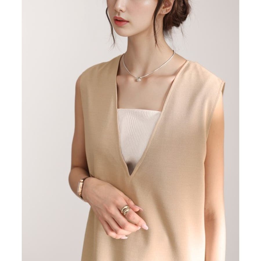 すっきりとしたVネックラインが女性らしさをプラス。