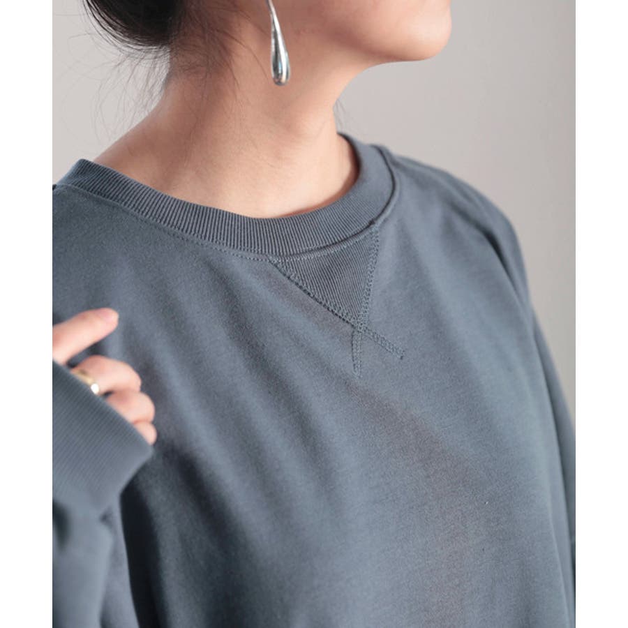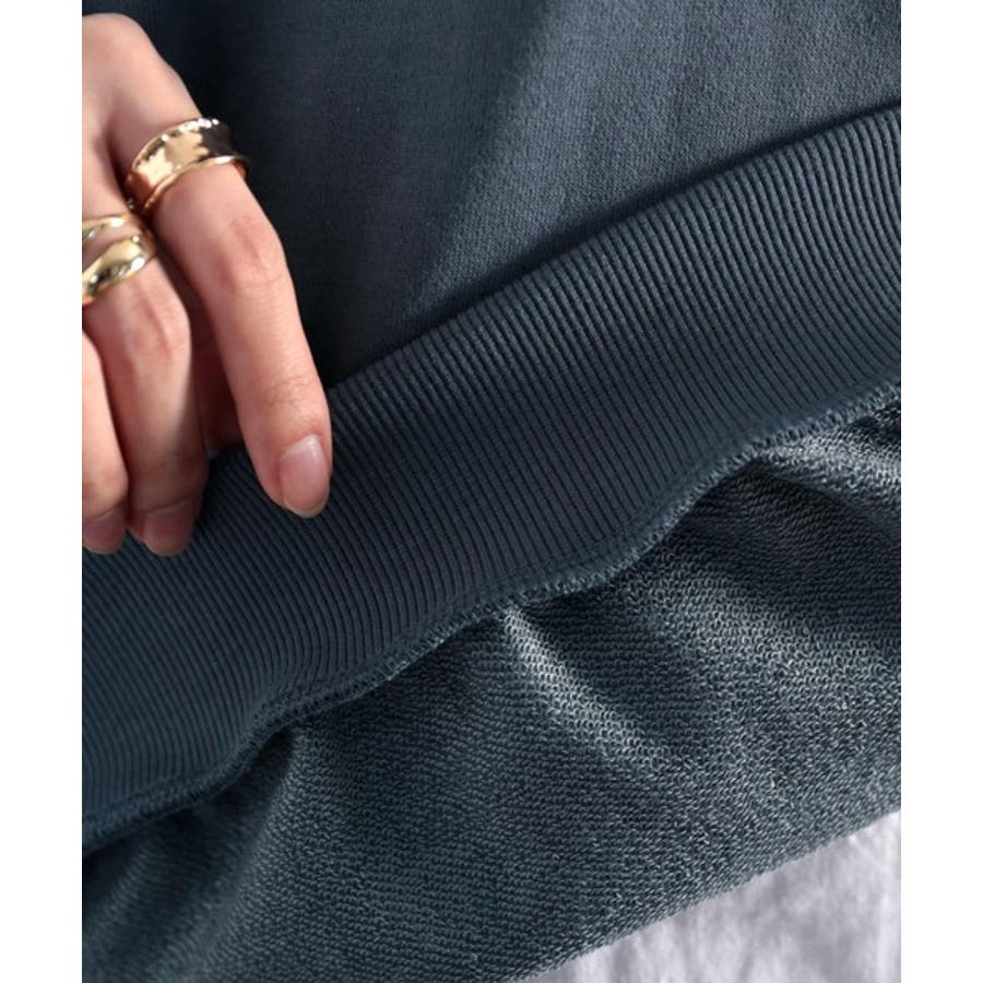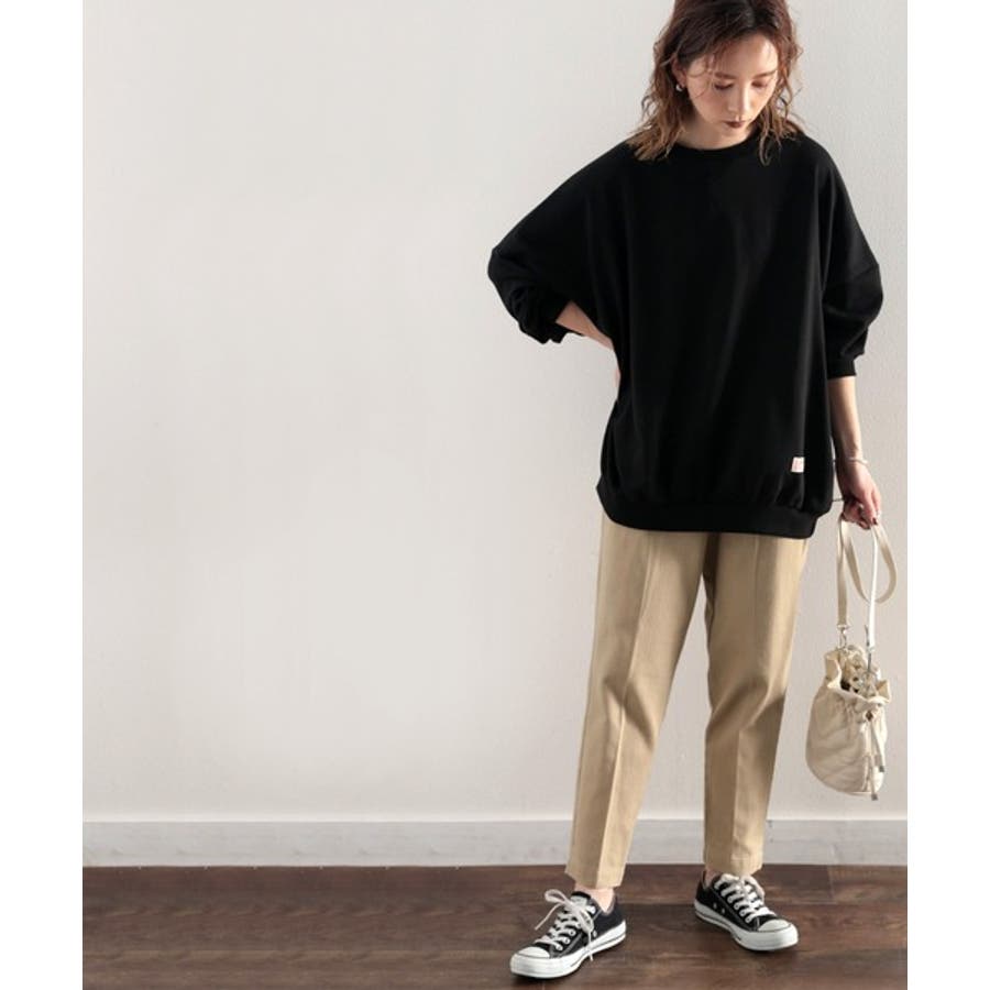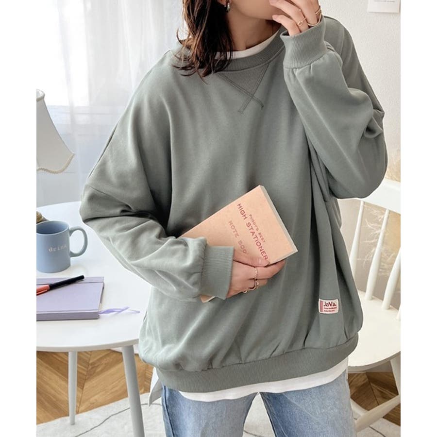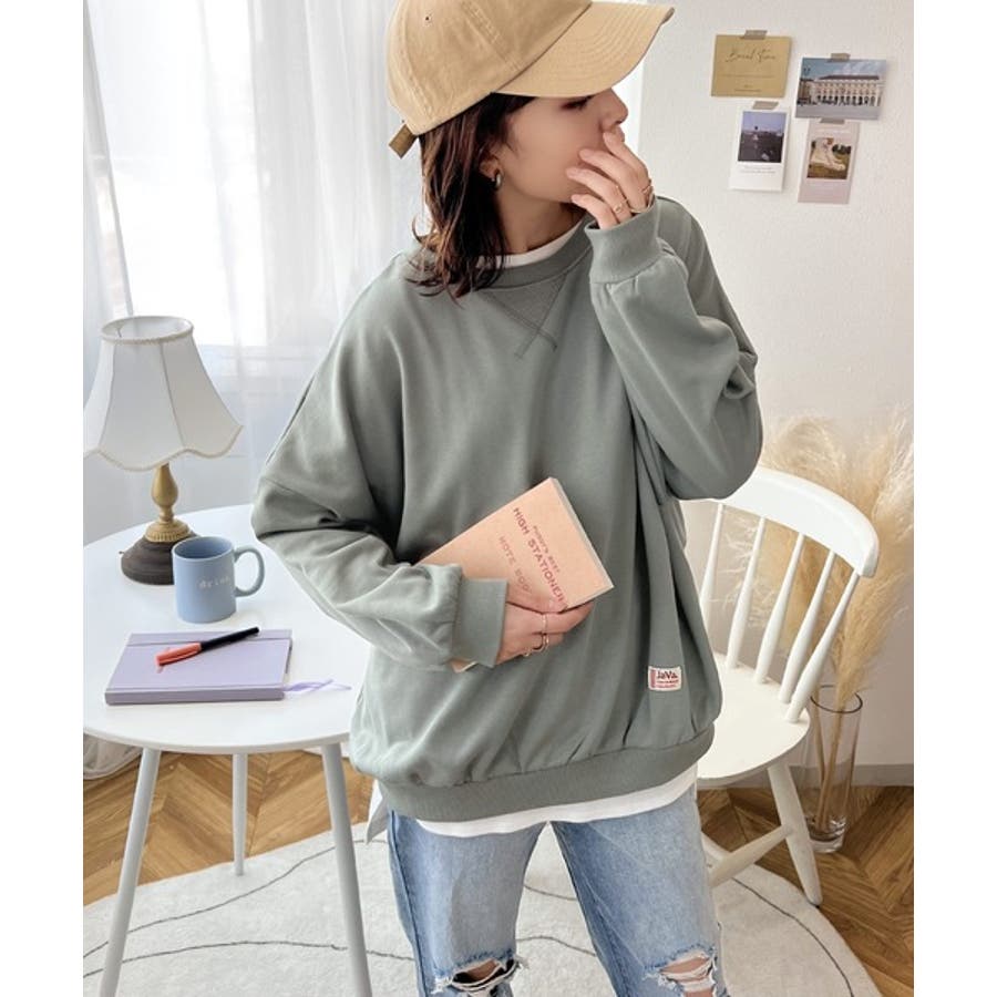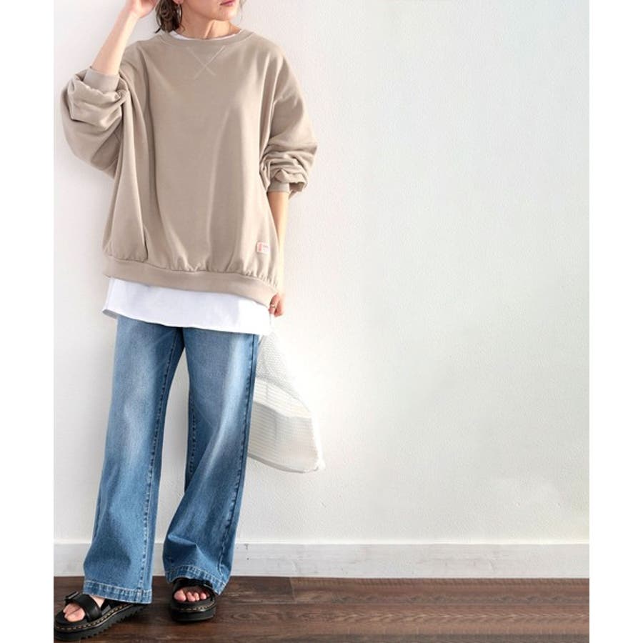 無地のシンプルなガゼット付きのトレーナーでどんなボトムスとも合わせやすい。