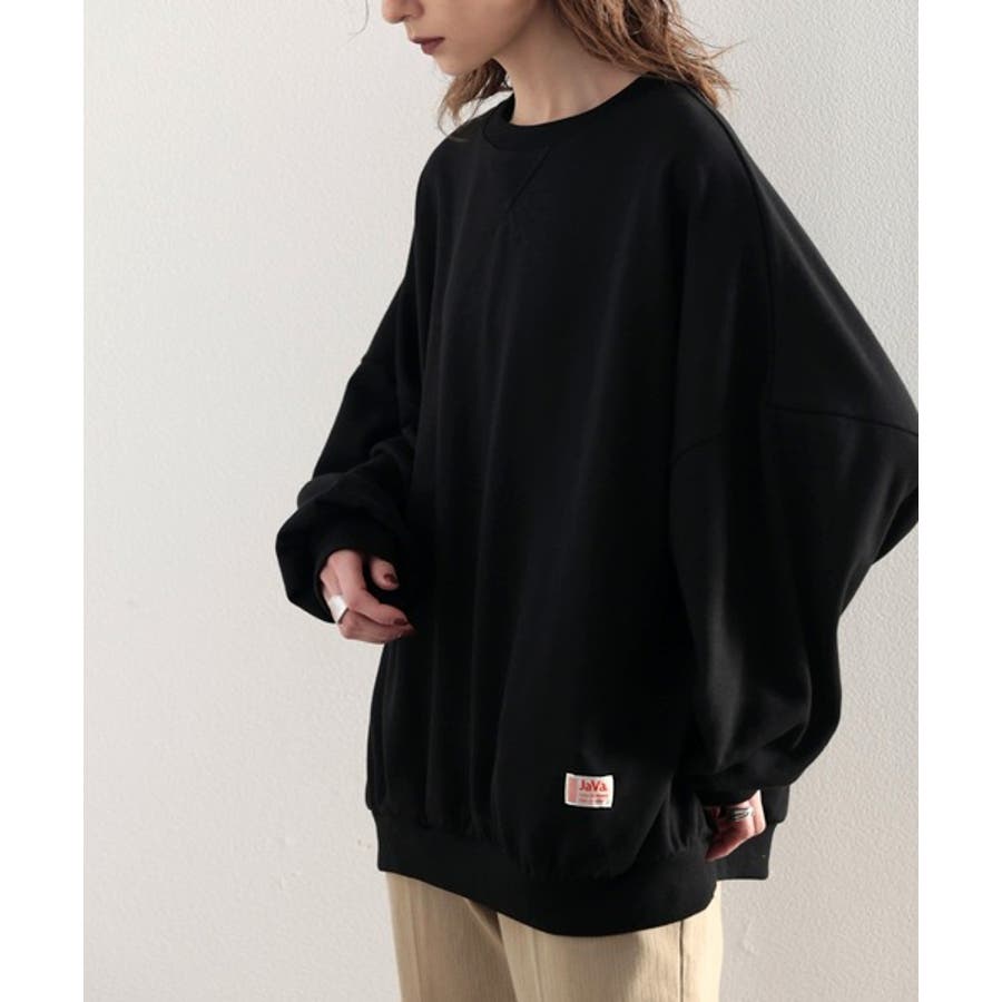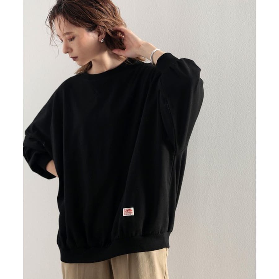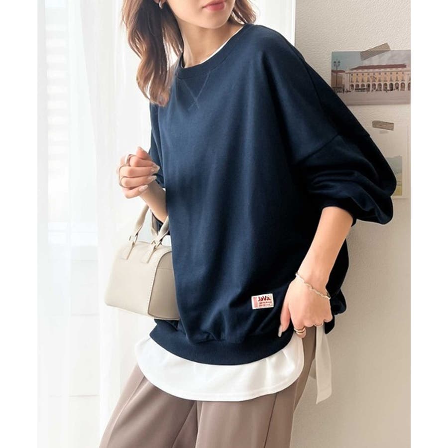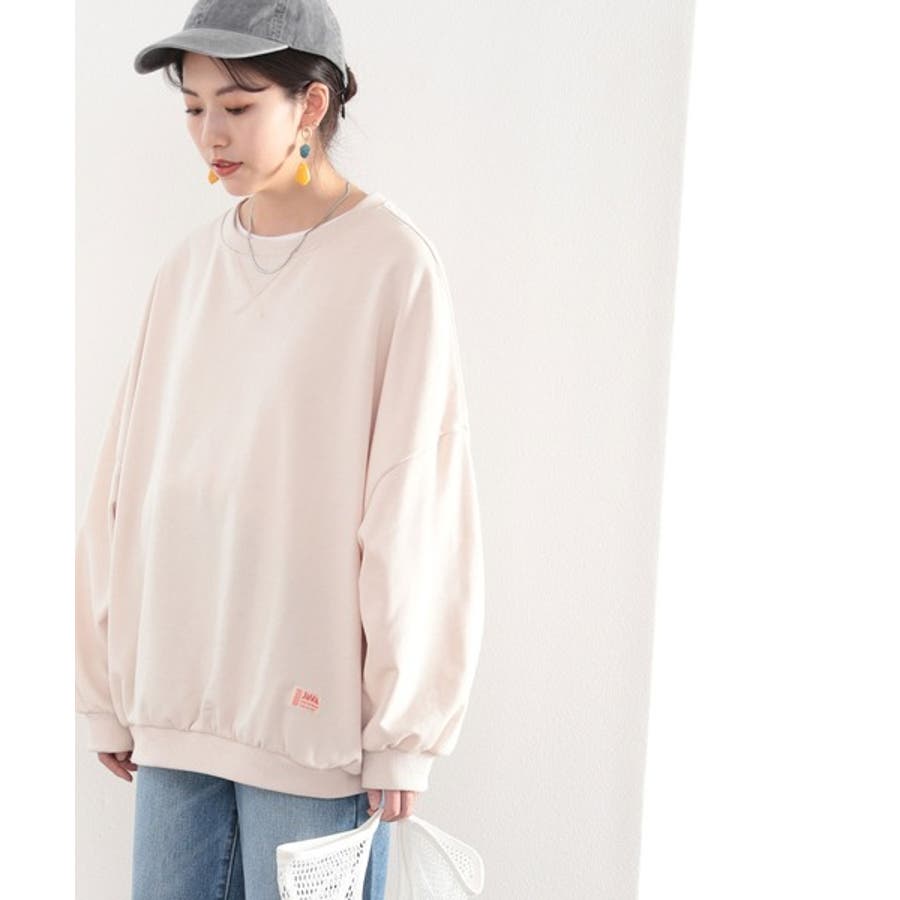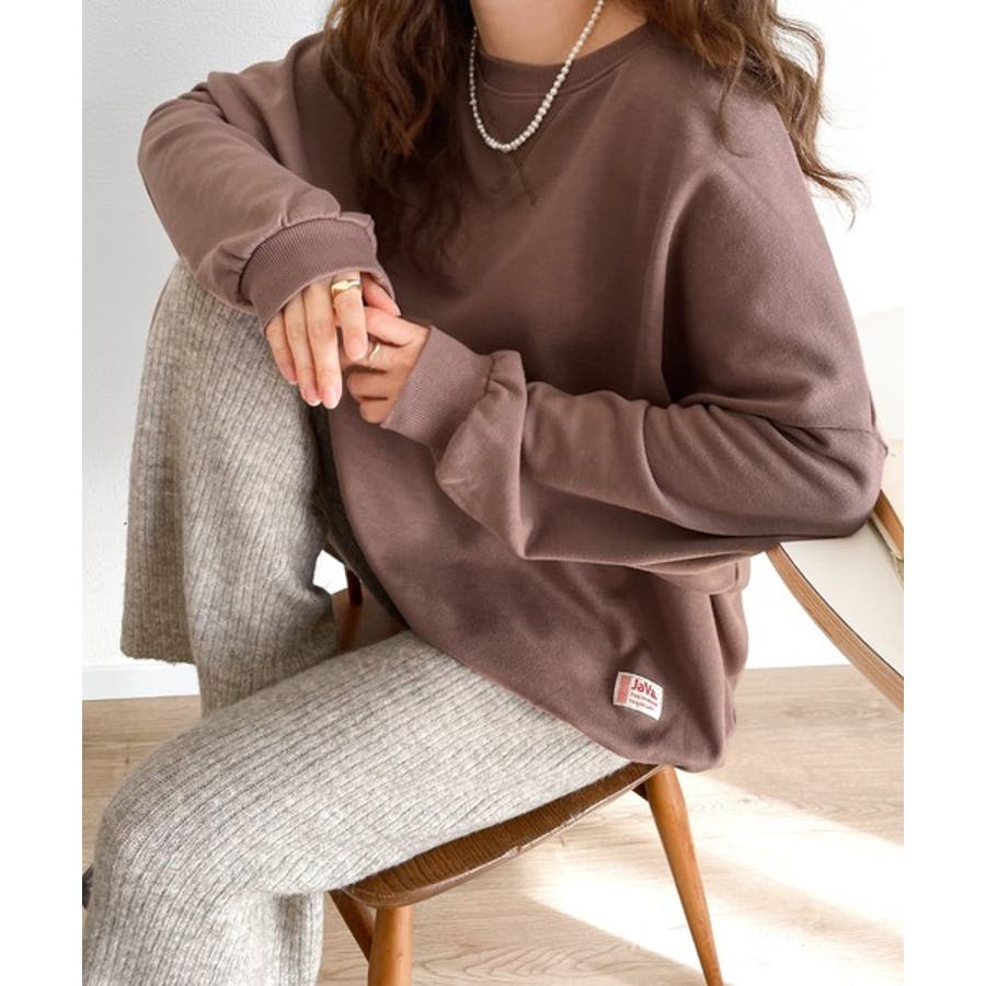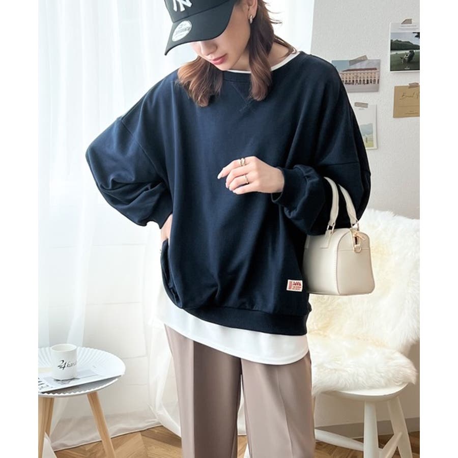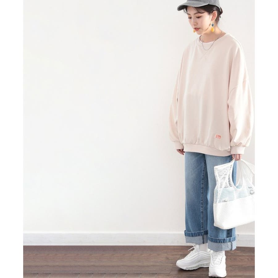 無地のシンプルなガゼット付きのトレーナーでどんなボトムスとも合わせやすい。