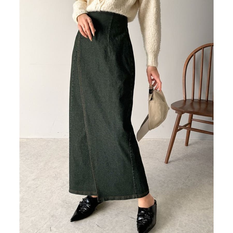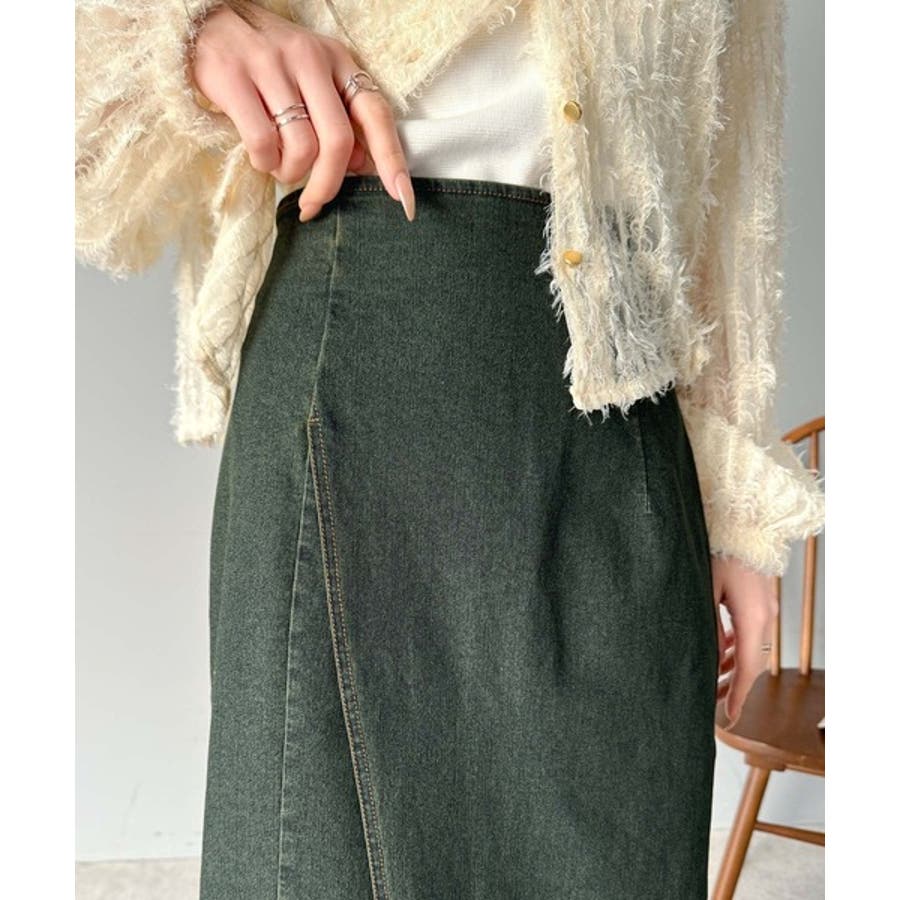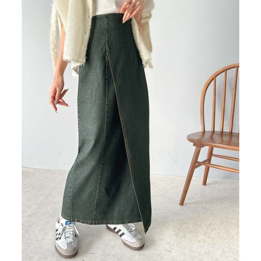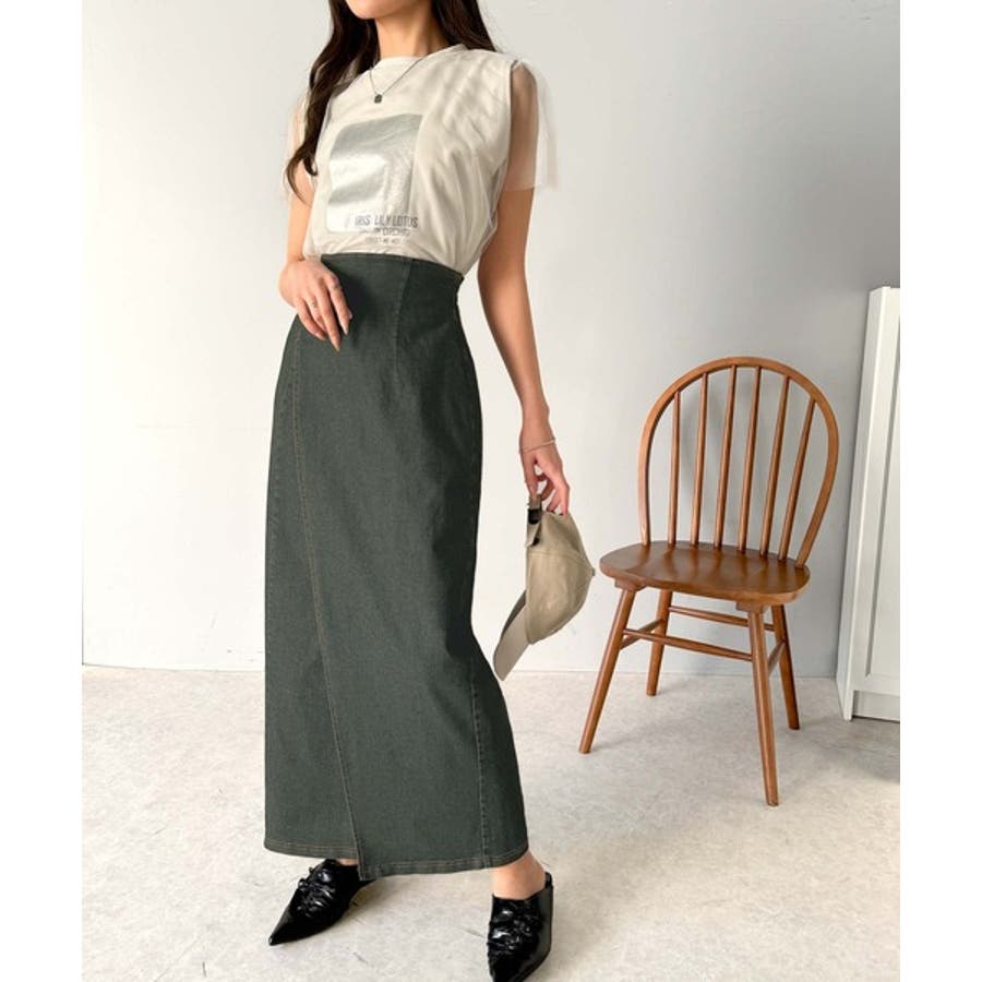 シンプルなタイトシルエットですが、フロントはラップ風のデザインが新しいデニムスカート。