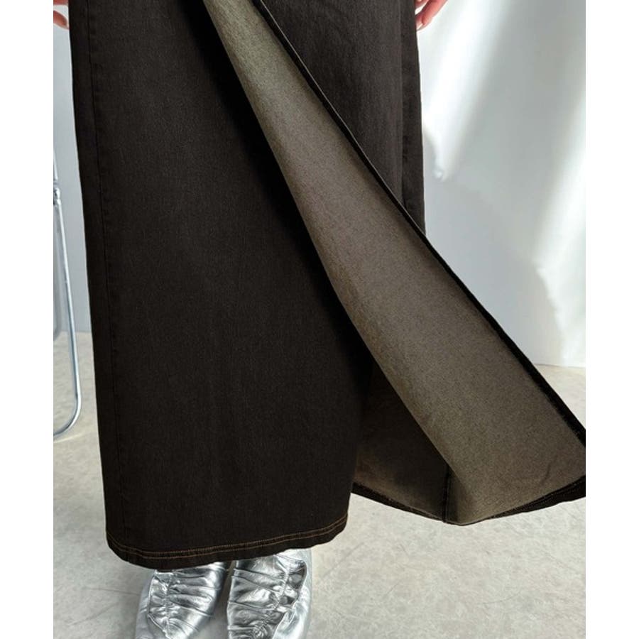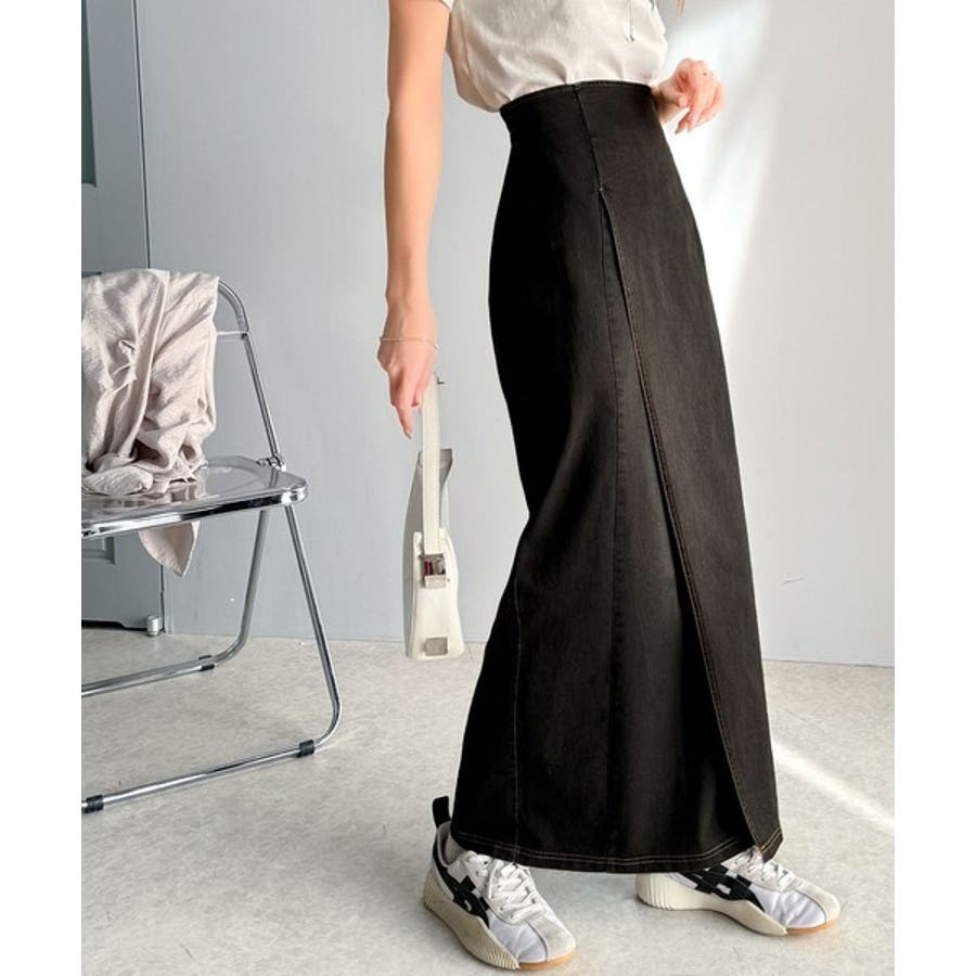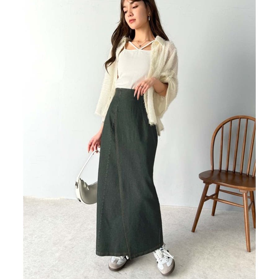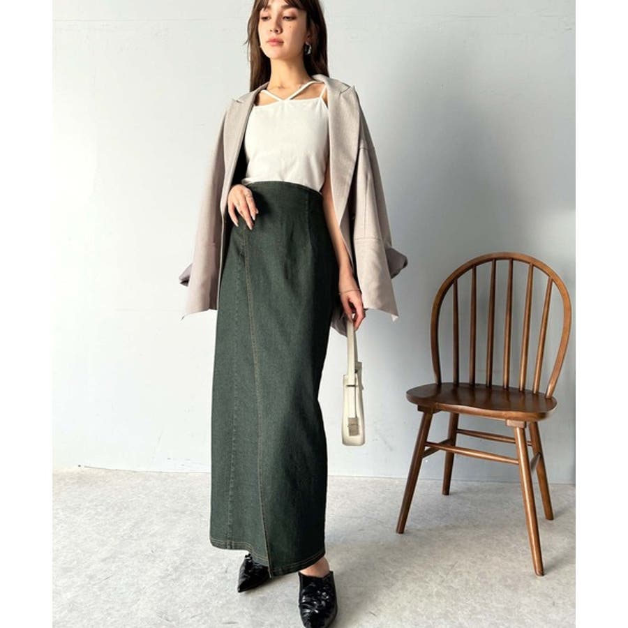 シンプルなタイトシルエットですが、フロントはラップ風のデザインが新しいデニムスカート。