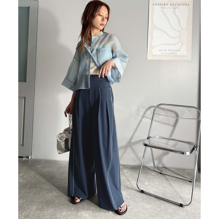両サイドの切り替え部分に配色パイピングを施したワイドパンツ。