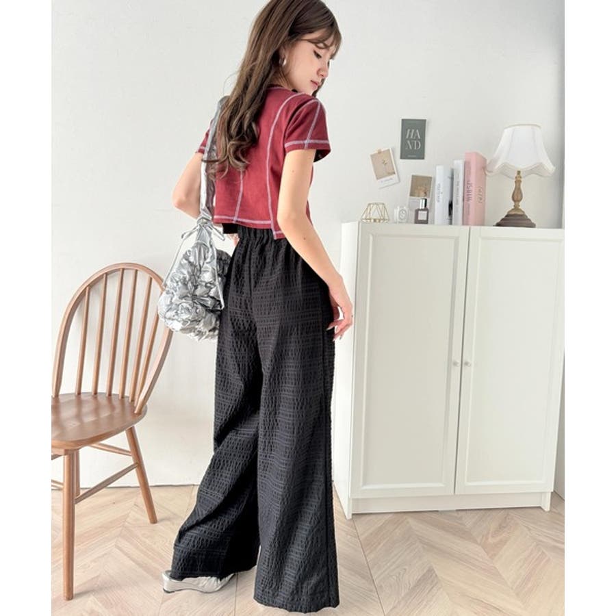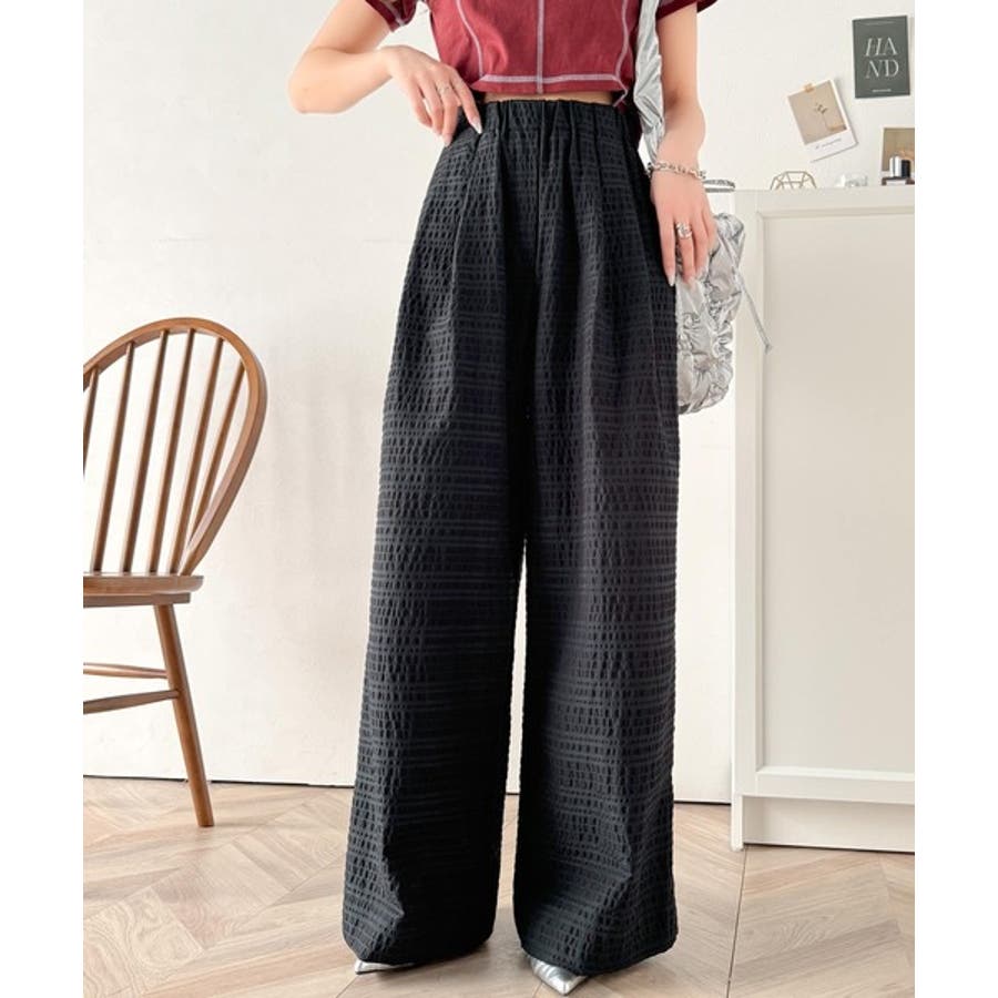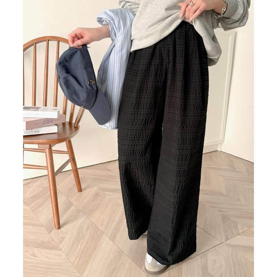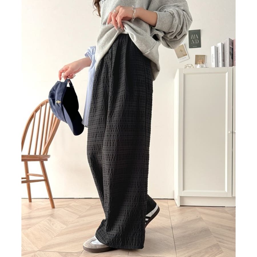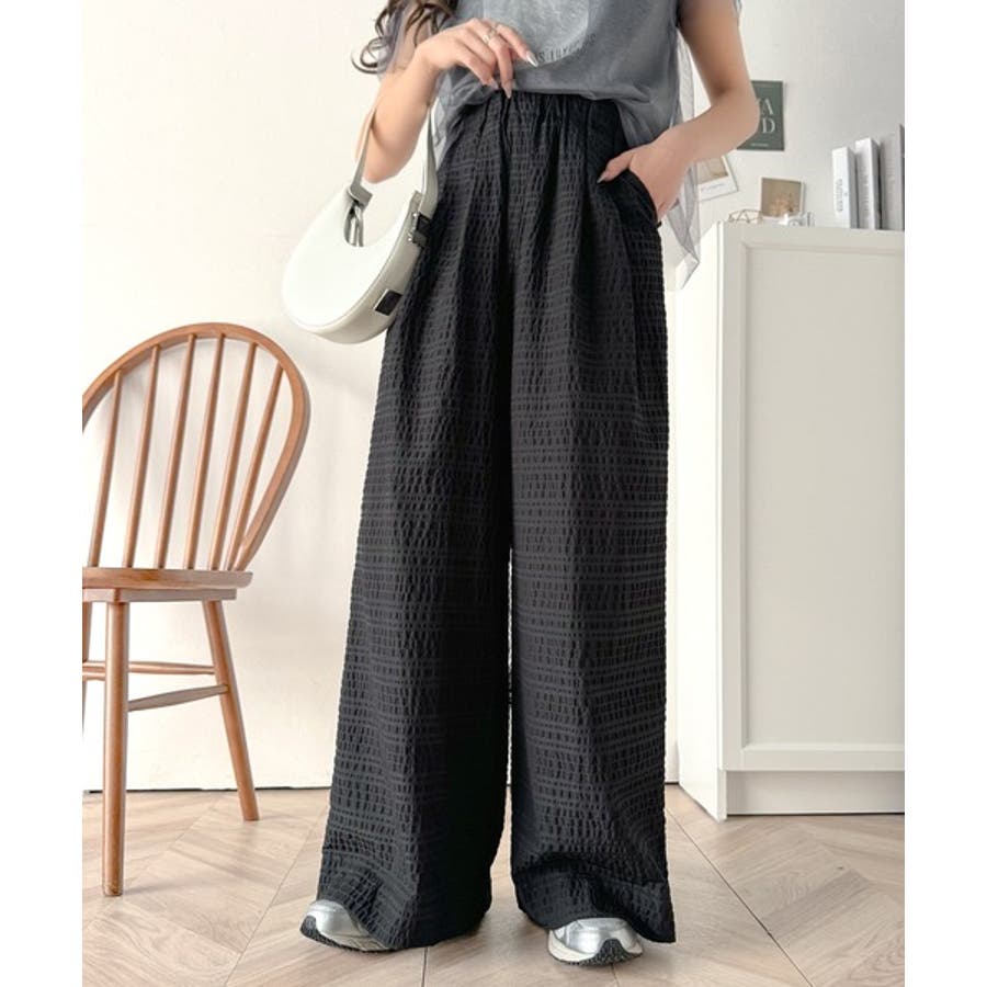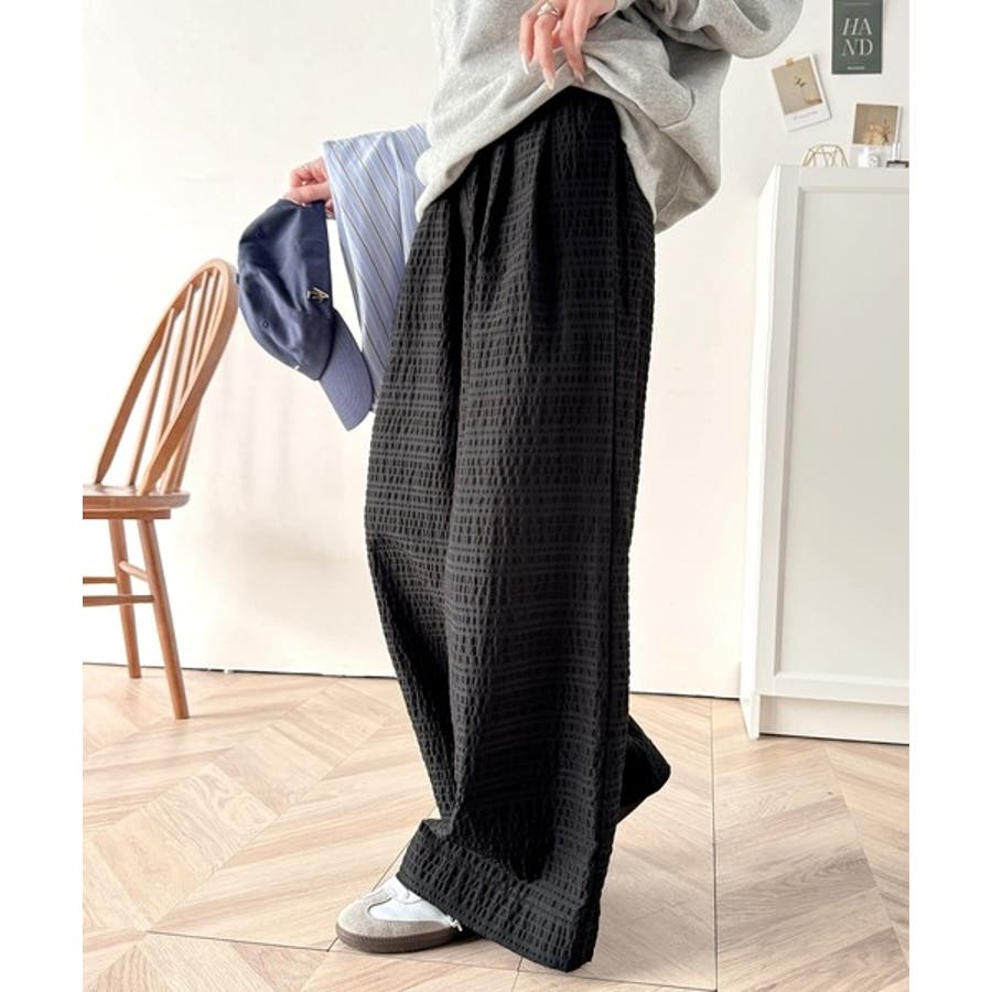 スタイリッシュデザイン&大人リラックシー。美脚魅せサッカー素材ワイドストレートイ…