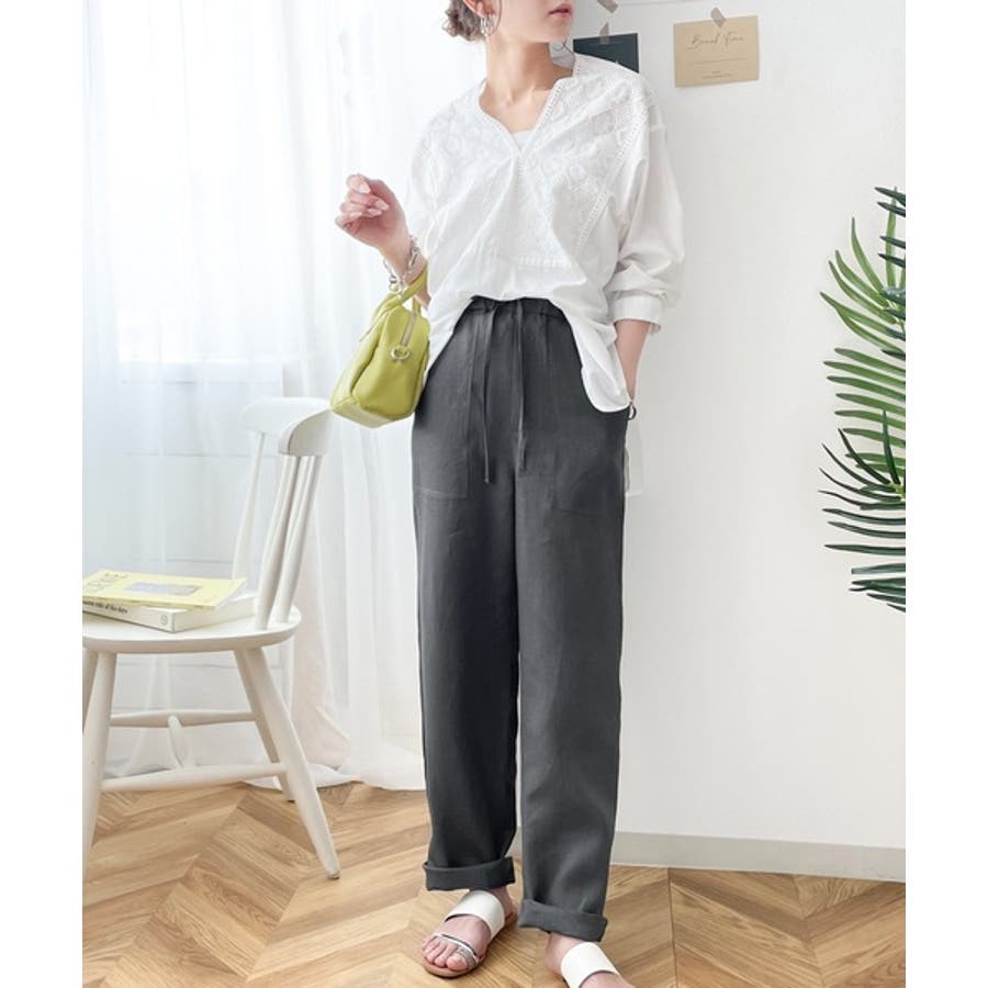 大人の上品さを醸す腰元ゆったり、ドロスト仕様の紐がアクセントに。