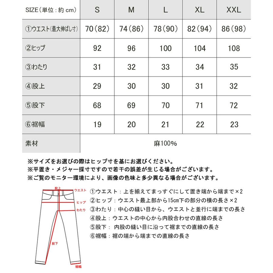 [XXLサイズ]ウエスト(最大伸ばし寸):86(98)cm/ヒップ:108cm/わたり:35cm/股上:32cm/股下:72cm/裾幅:23cm