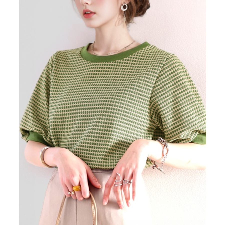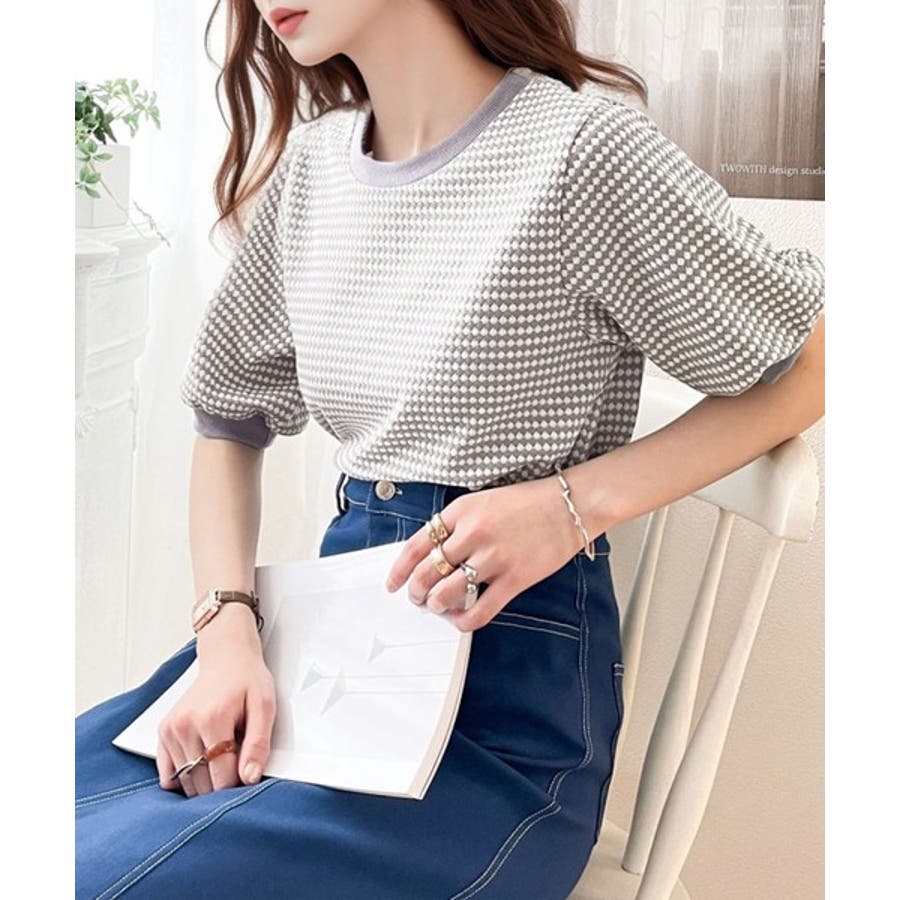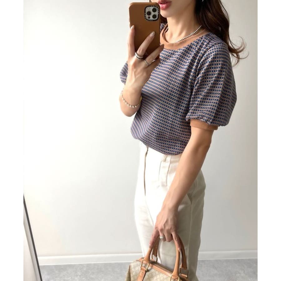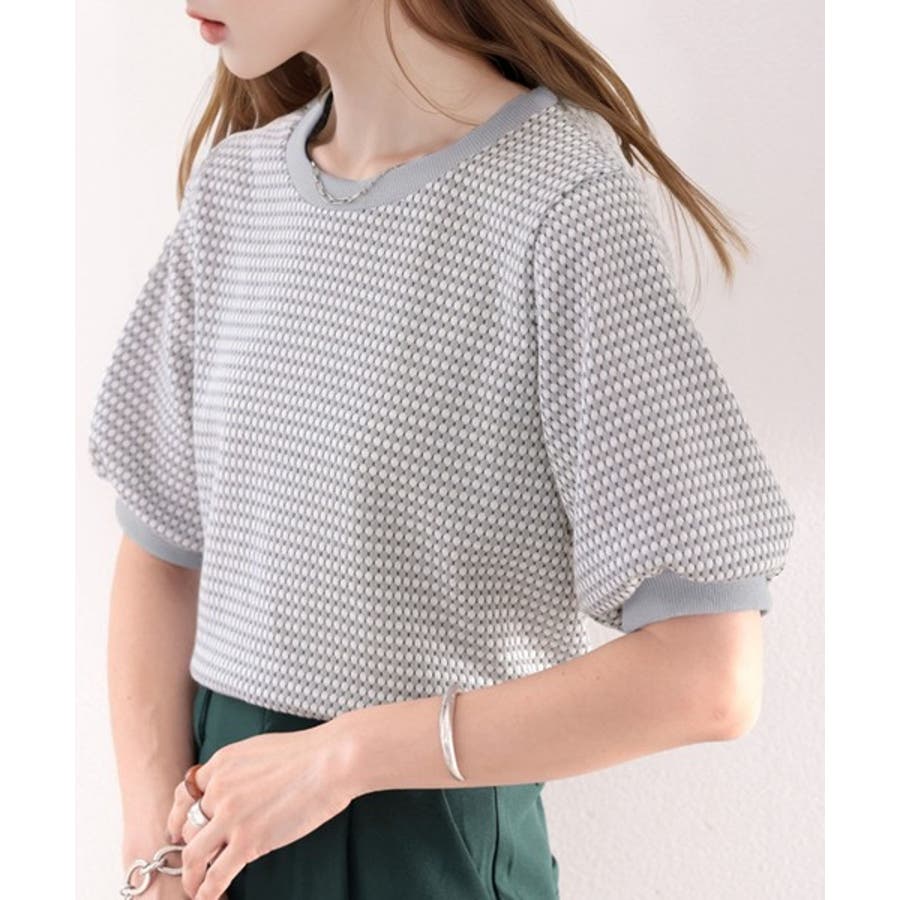 配色違いのリブがパフスリーブのお袖を可愛く華奢見えします。