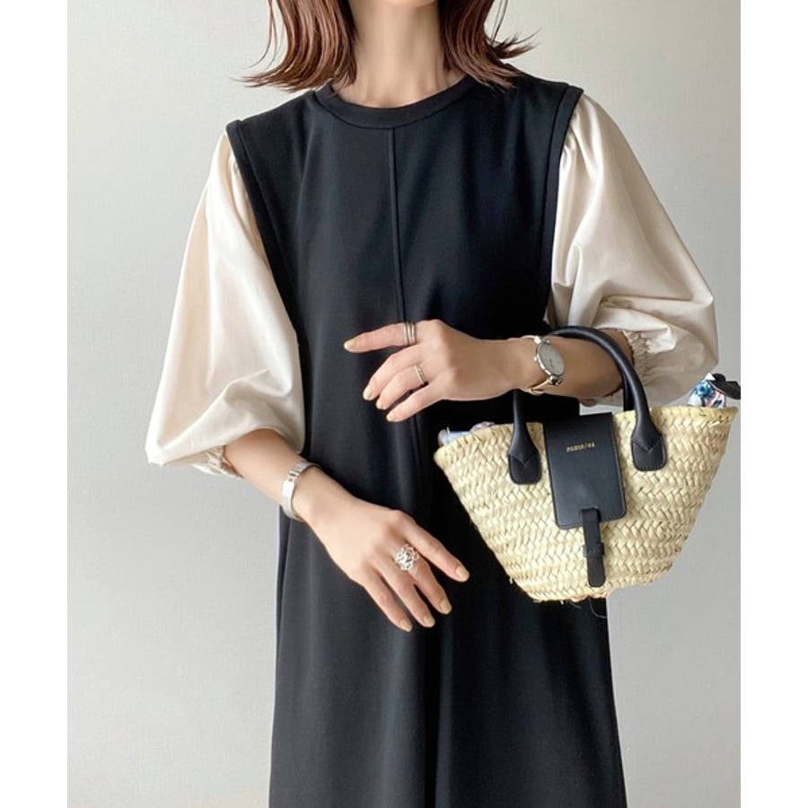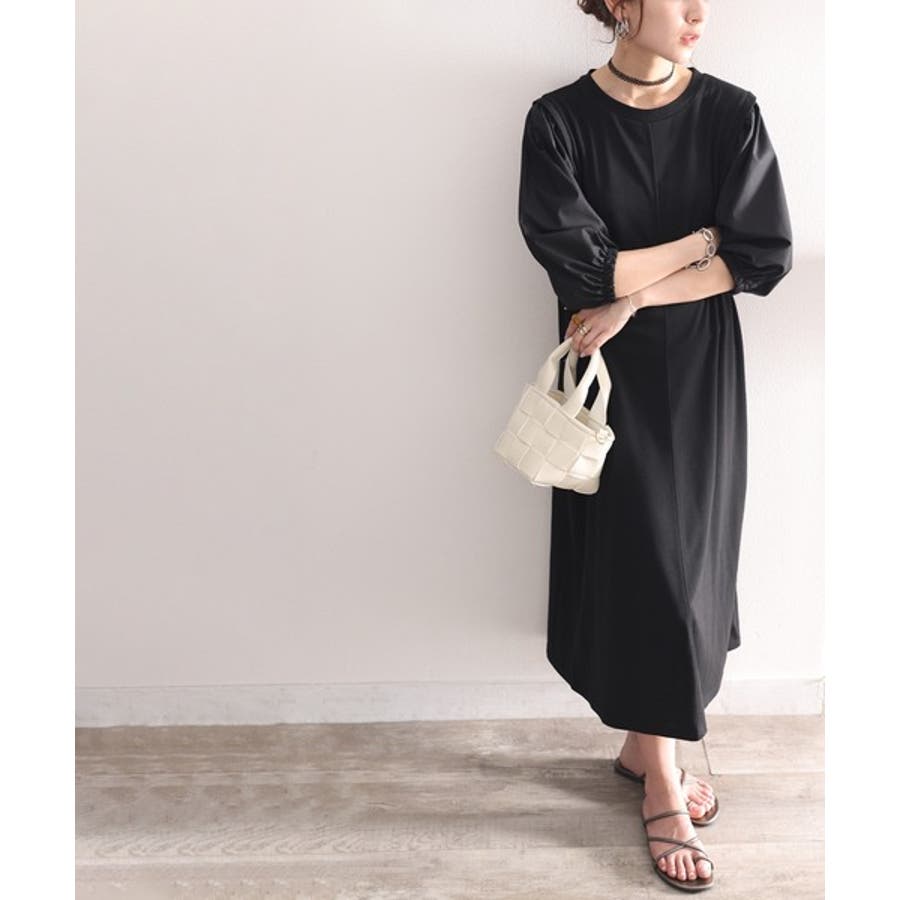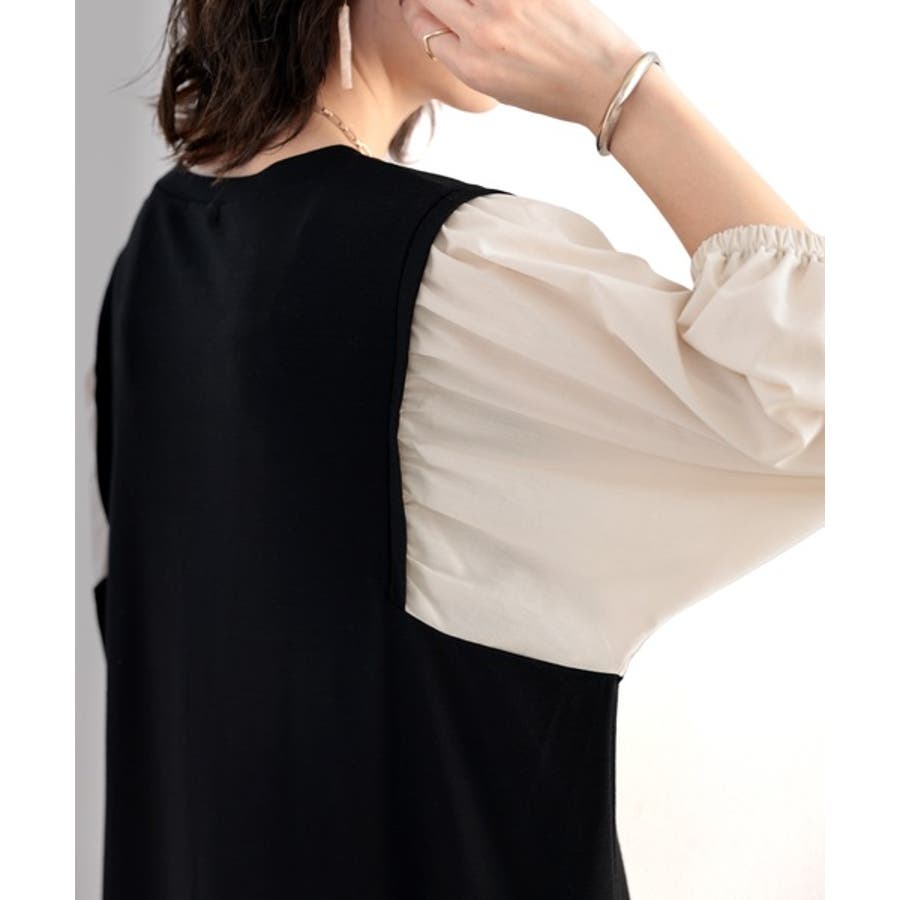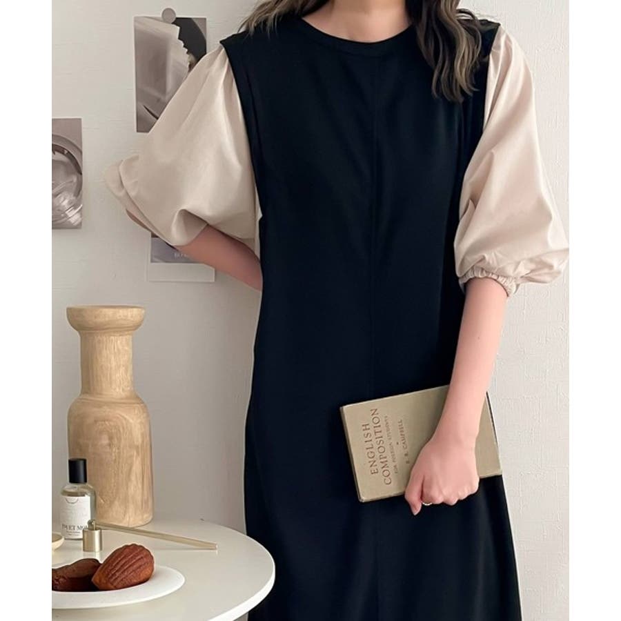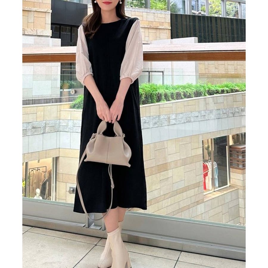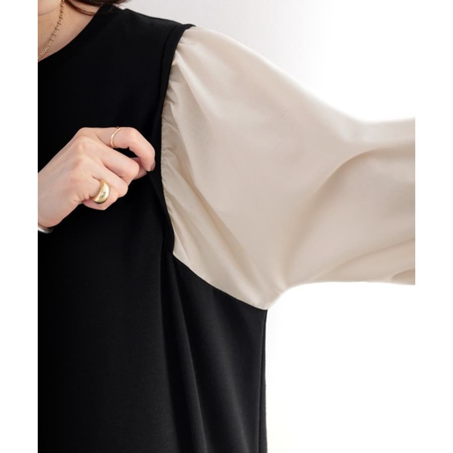 旬顔ぽわん袖の異素材使いワンピース。