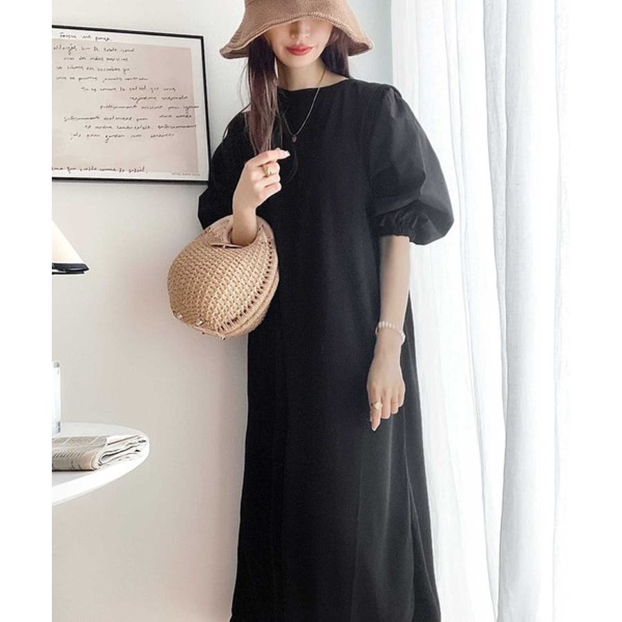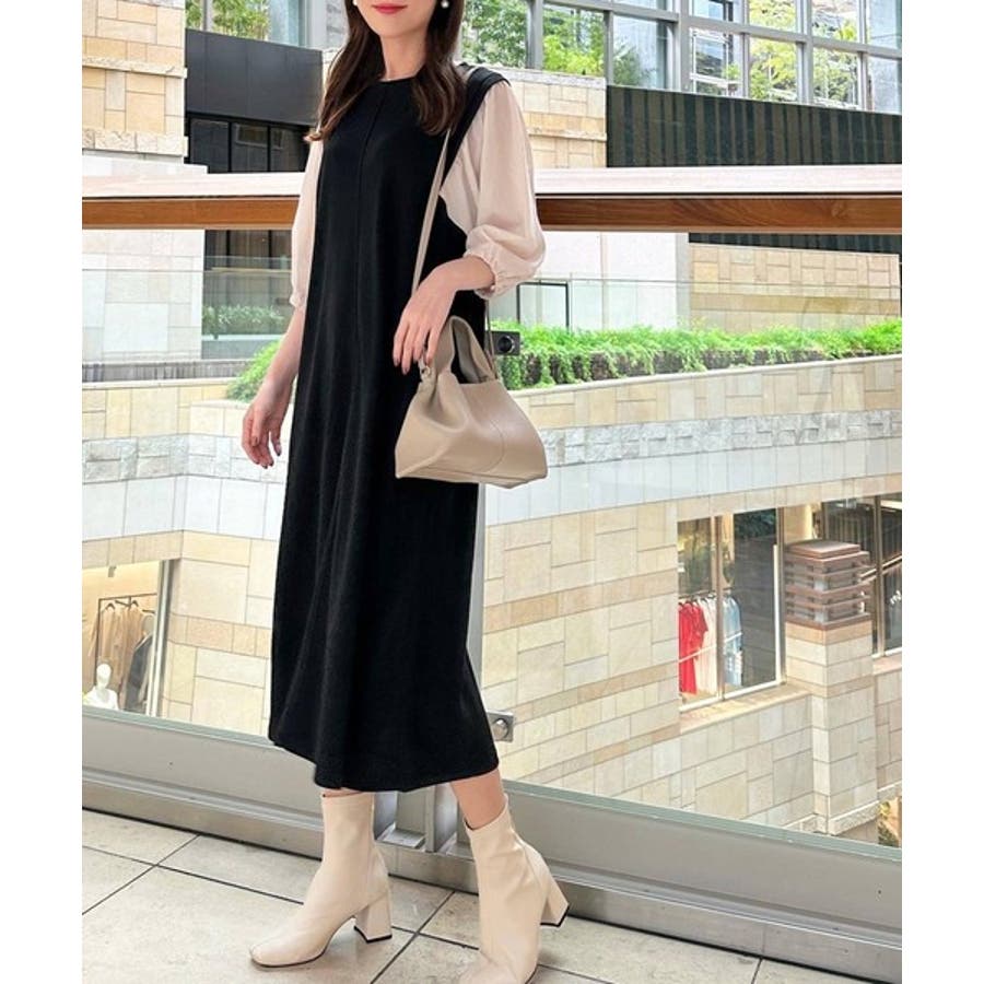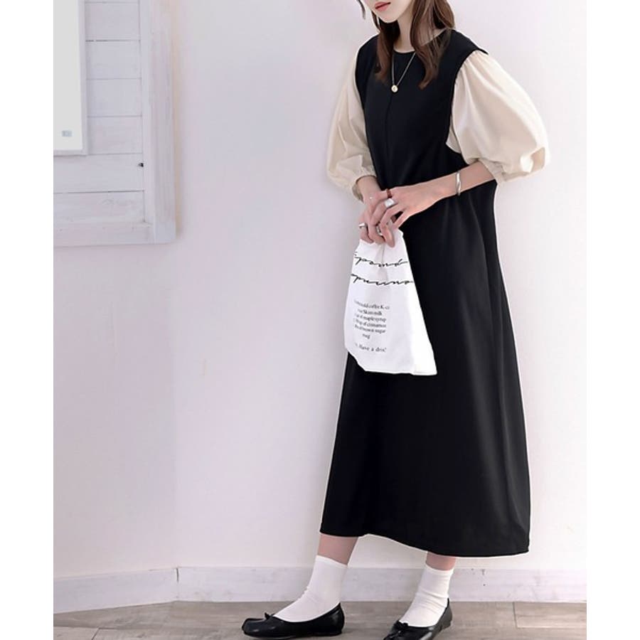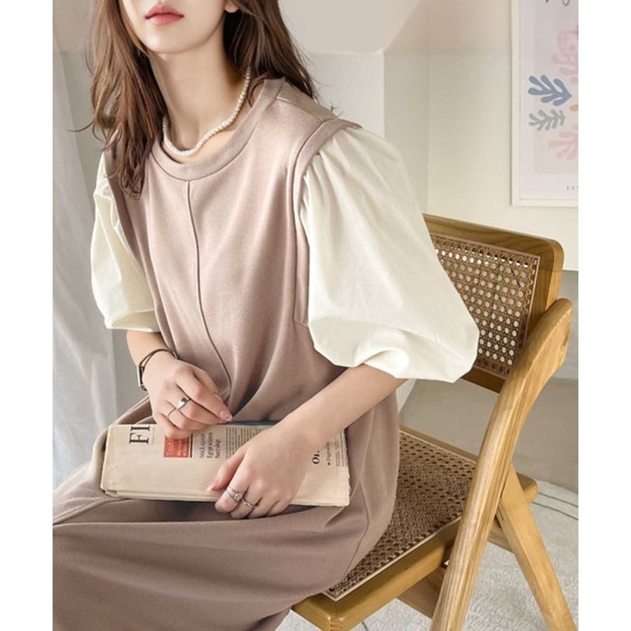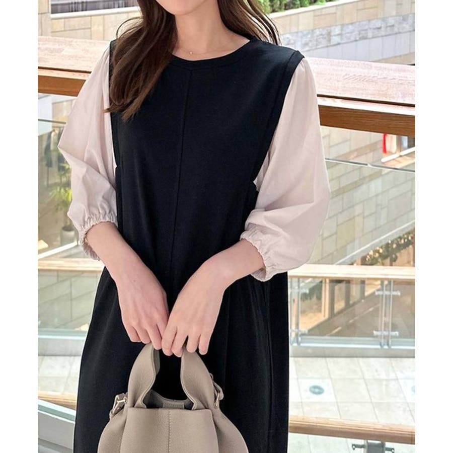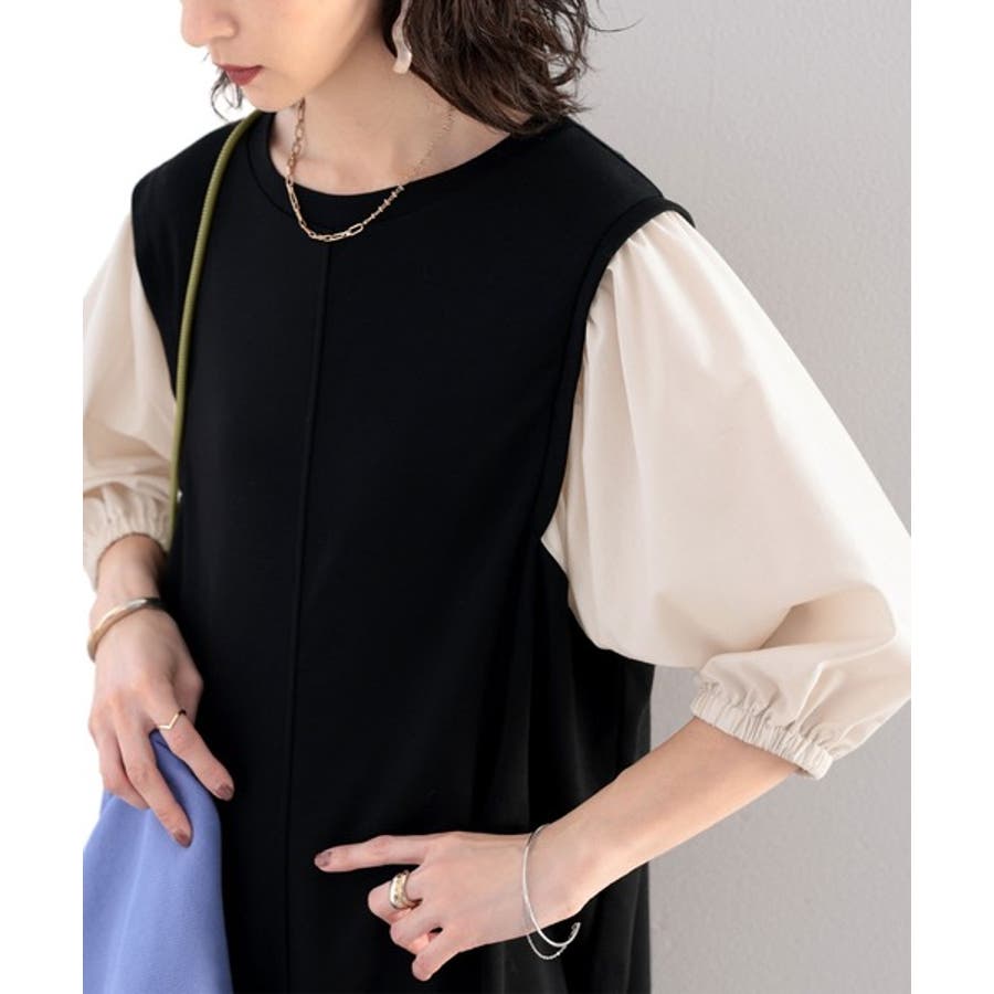 旬顔ぽわん袖の異素材使いワンピース。