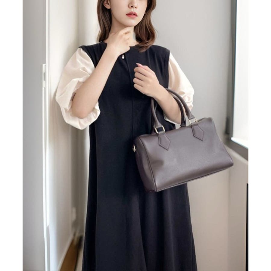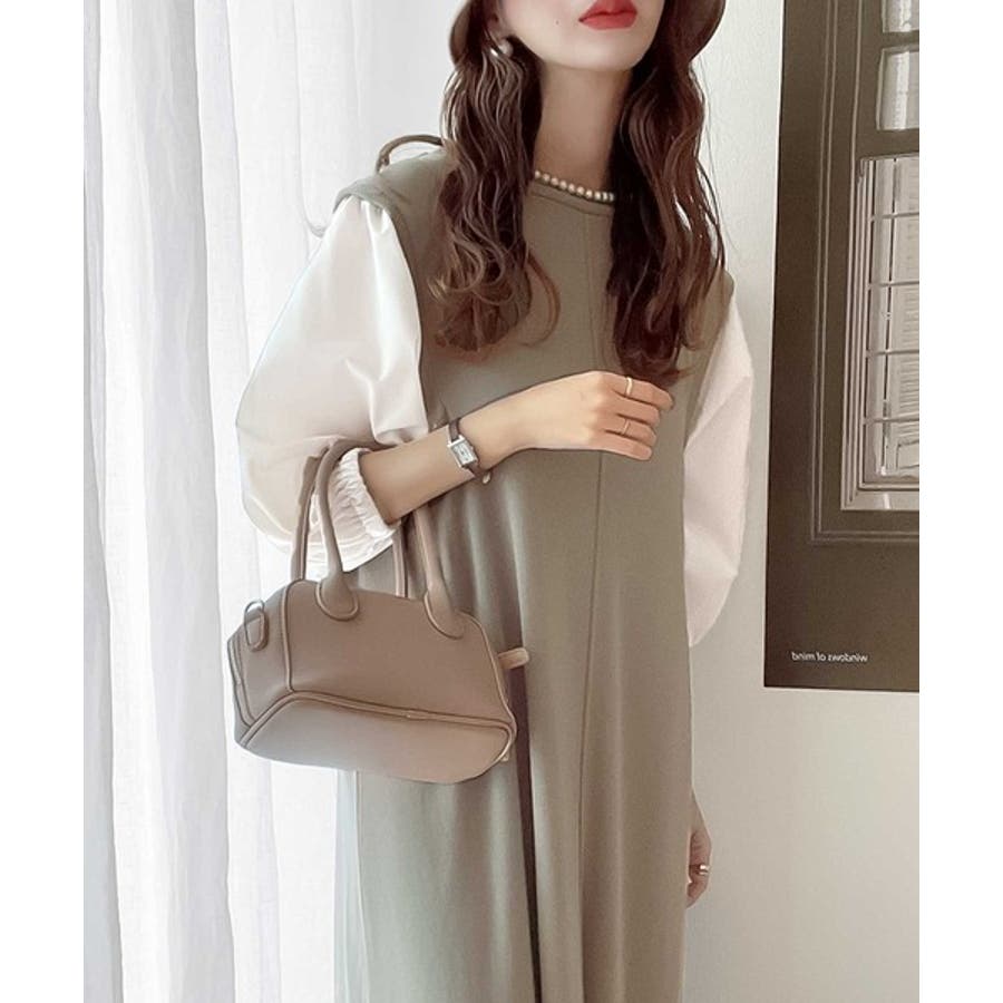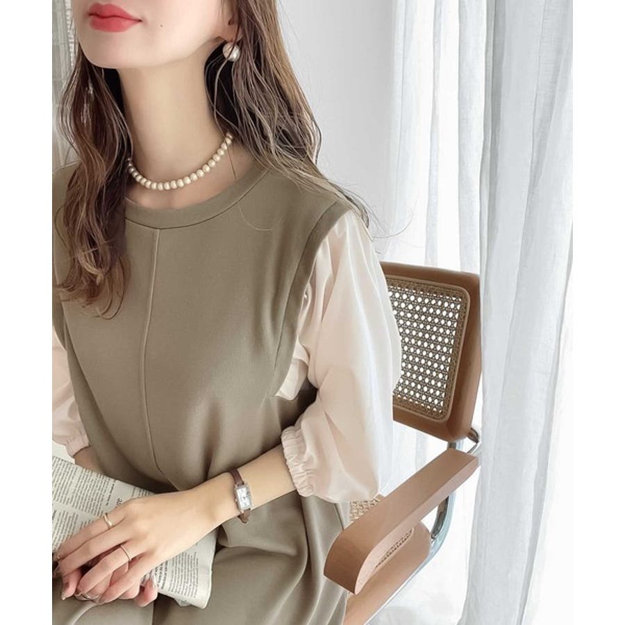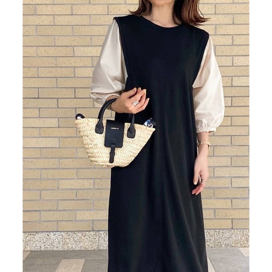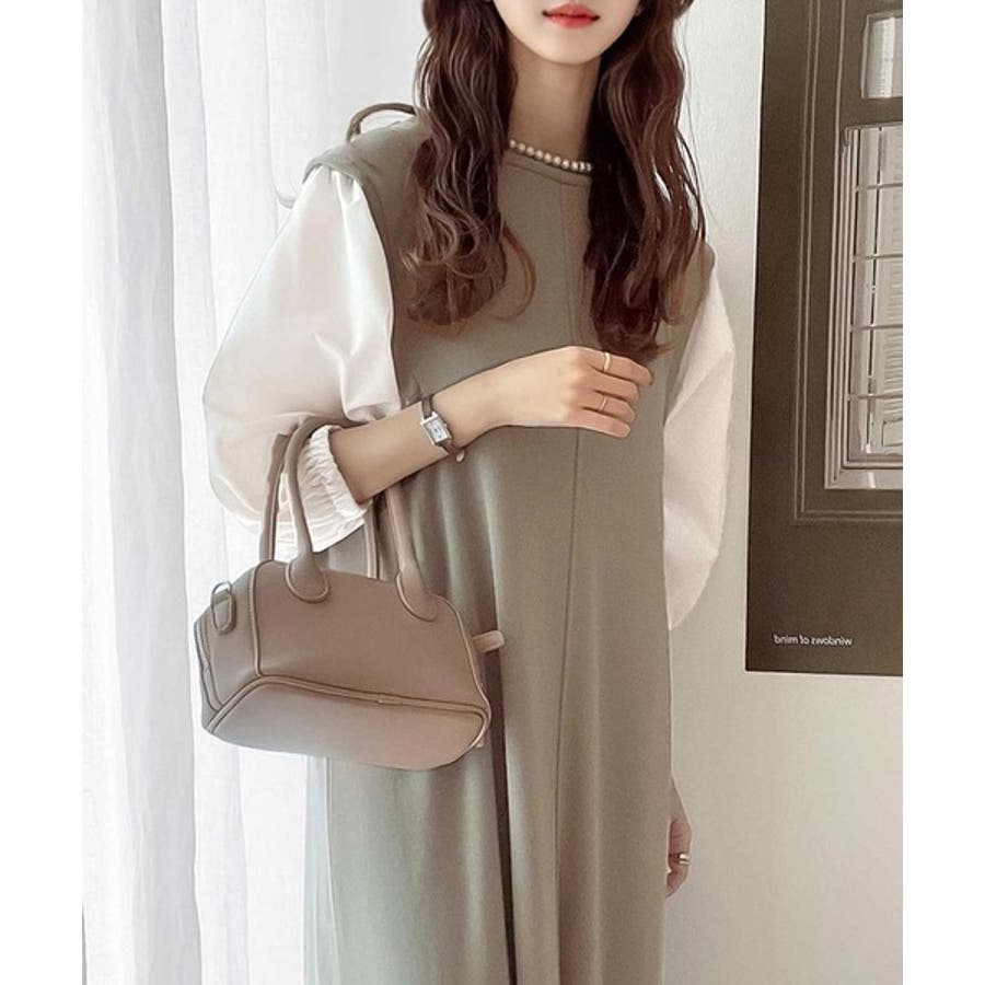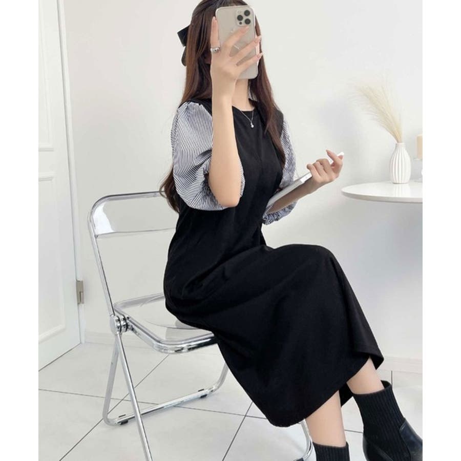 旬顔ぽわん袖の異素材使いワンピース。