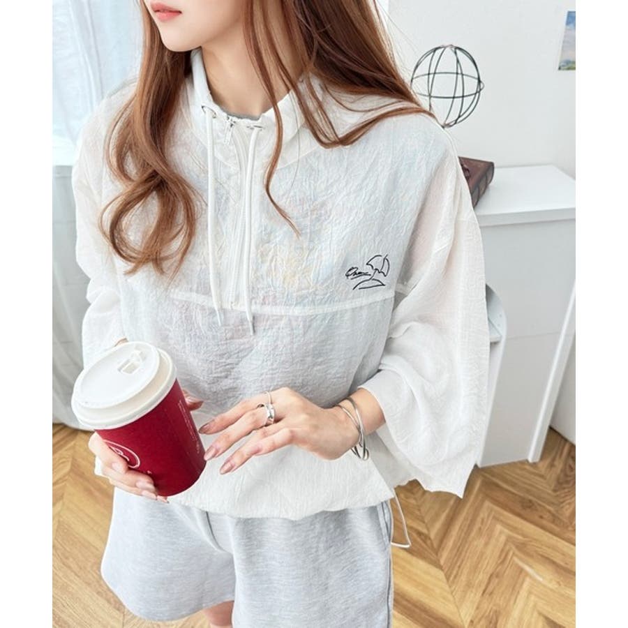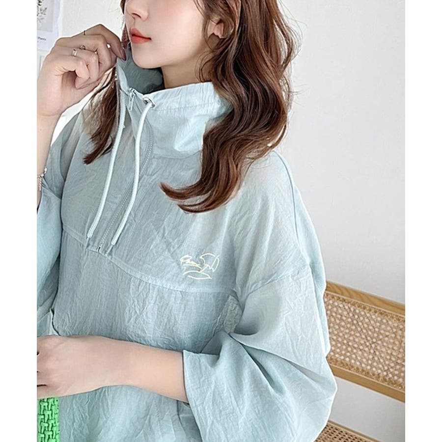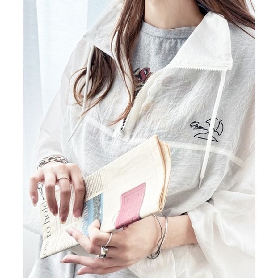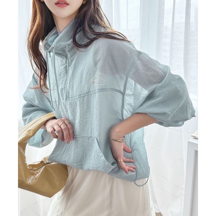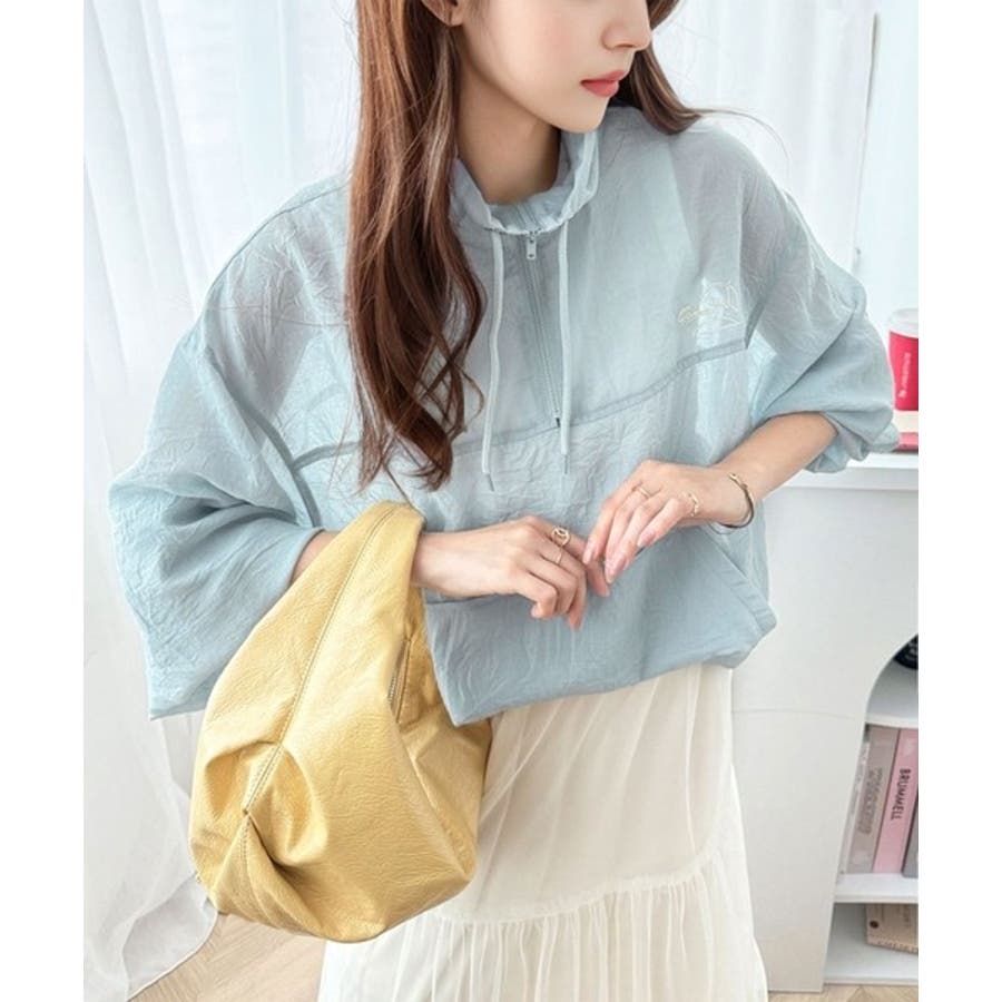 軽やかにこなれ感も漂う。胸パラソル刺繍シアーハーフジッププルオーバー
