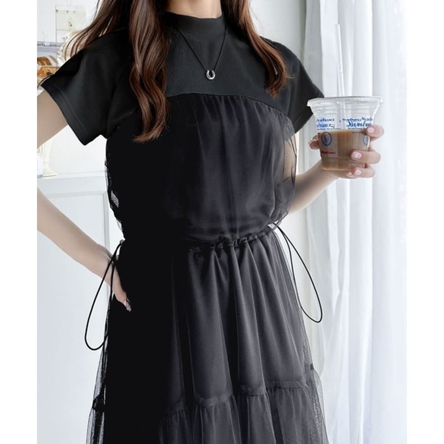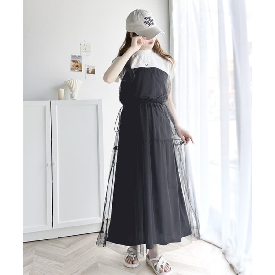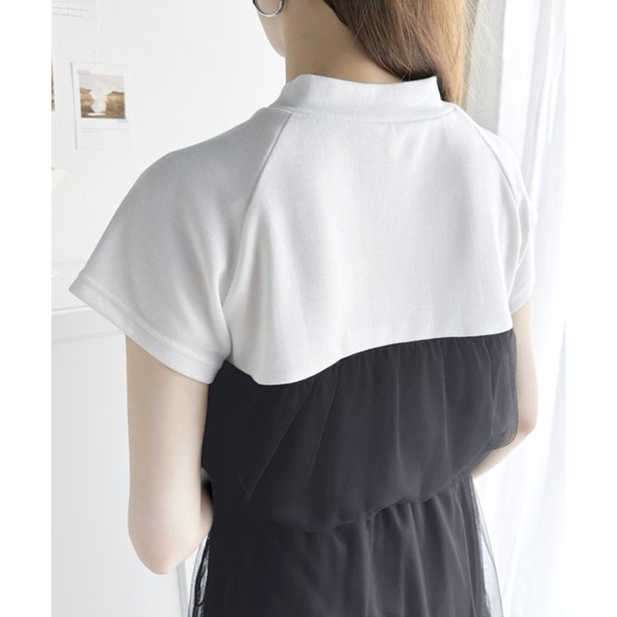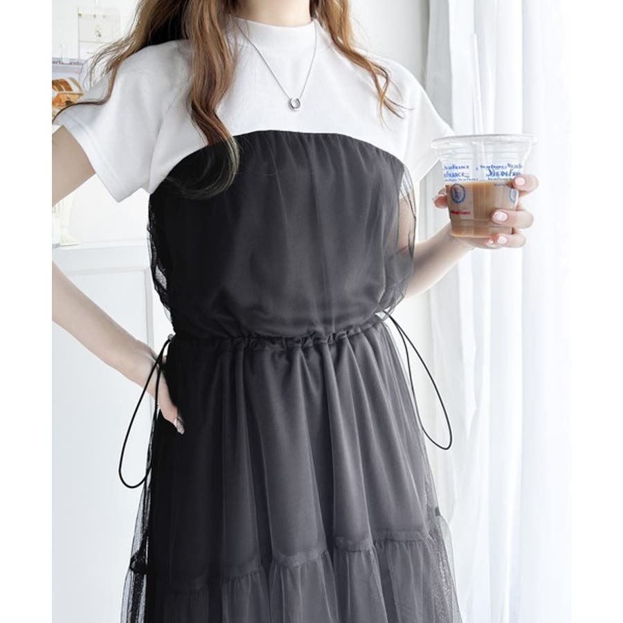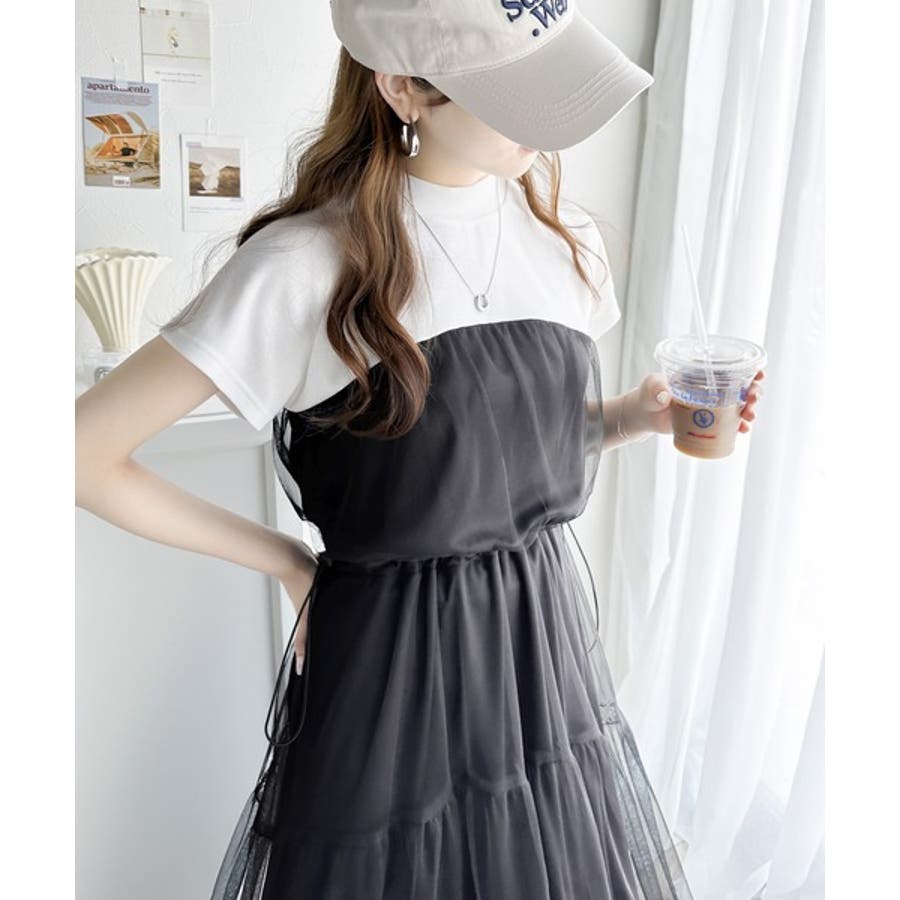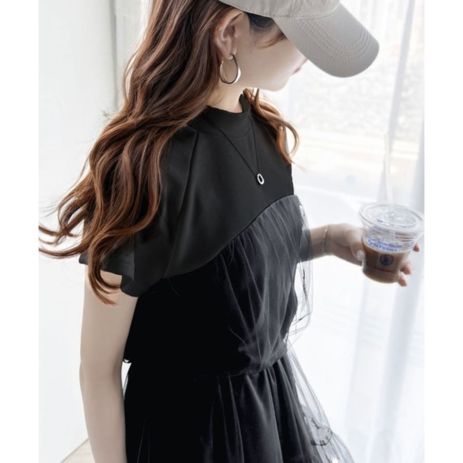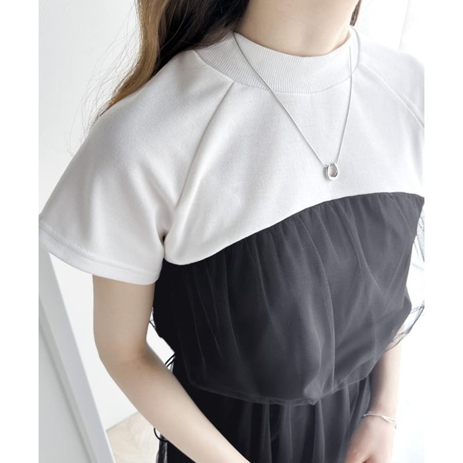 ボリュームのあるチュールとTシャツのドッキングワンピース。