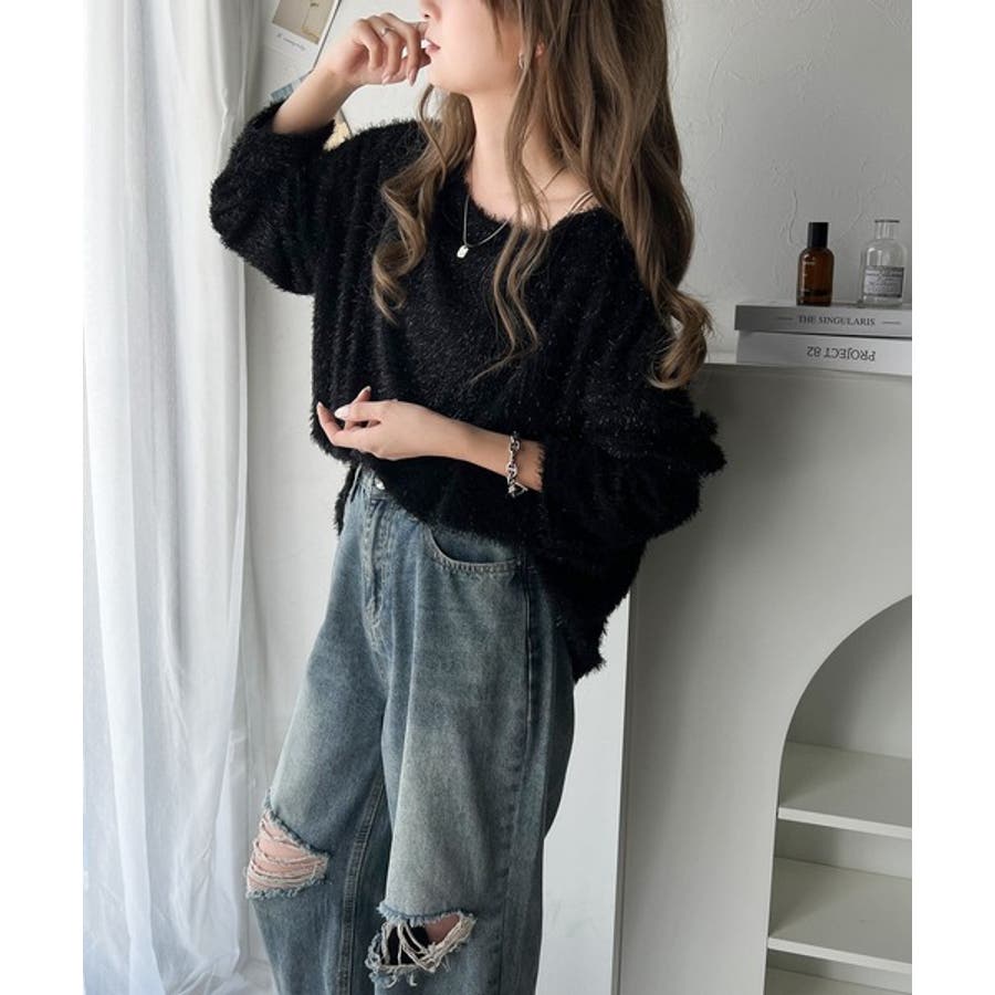 華やかで洗練されたデザインのボートネックラメシャギープルオーバーは、