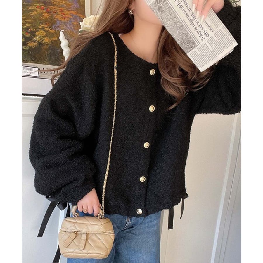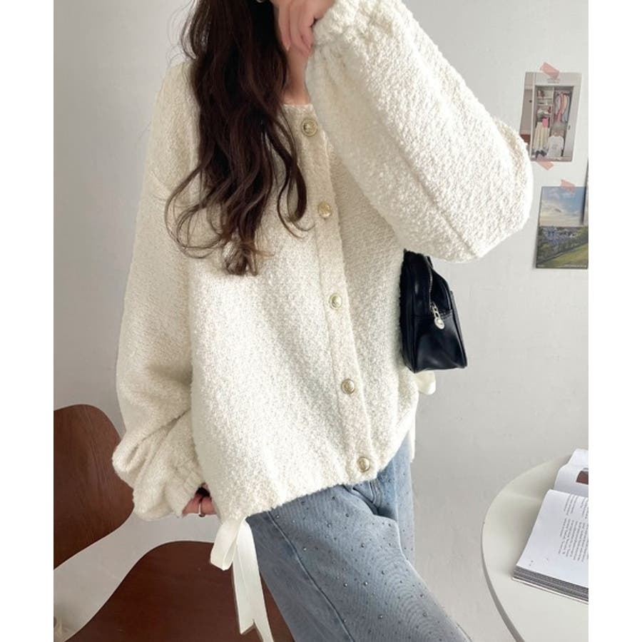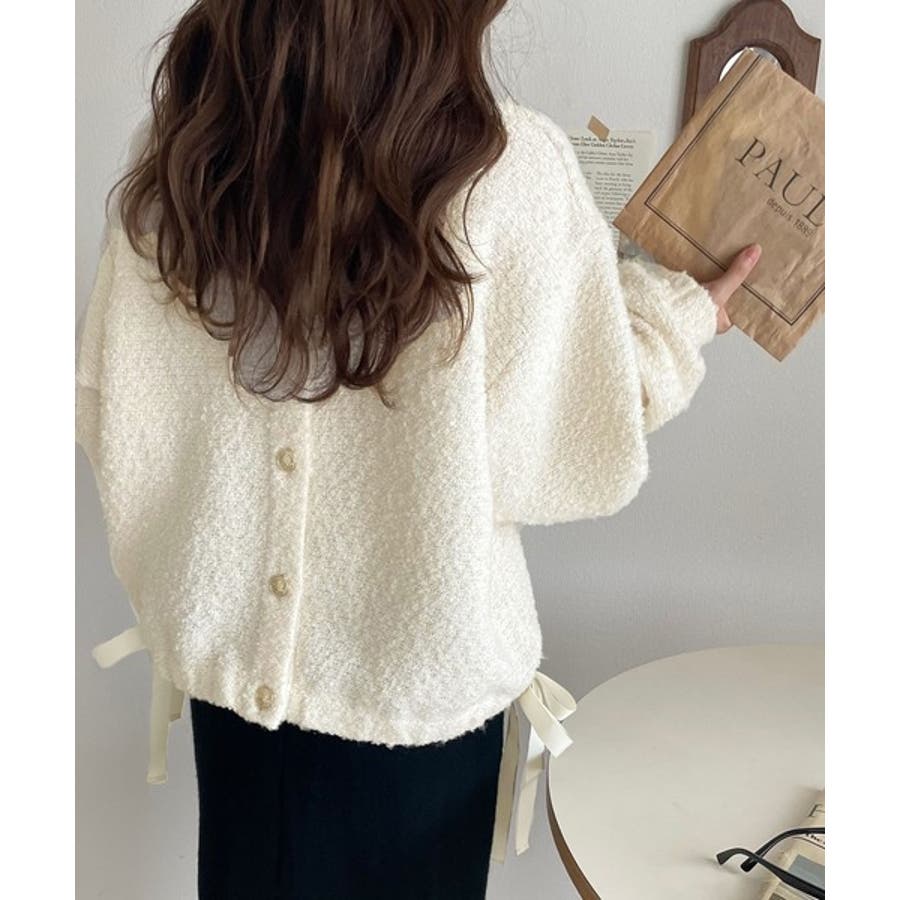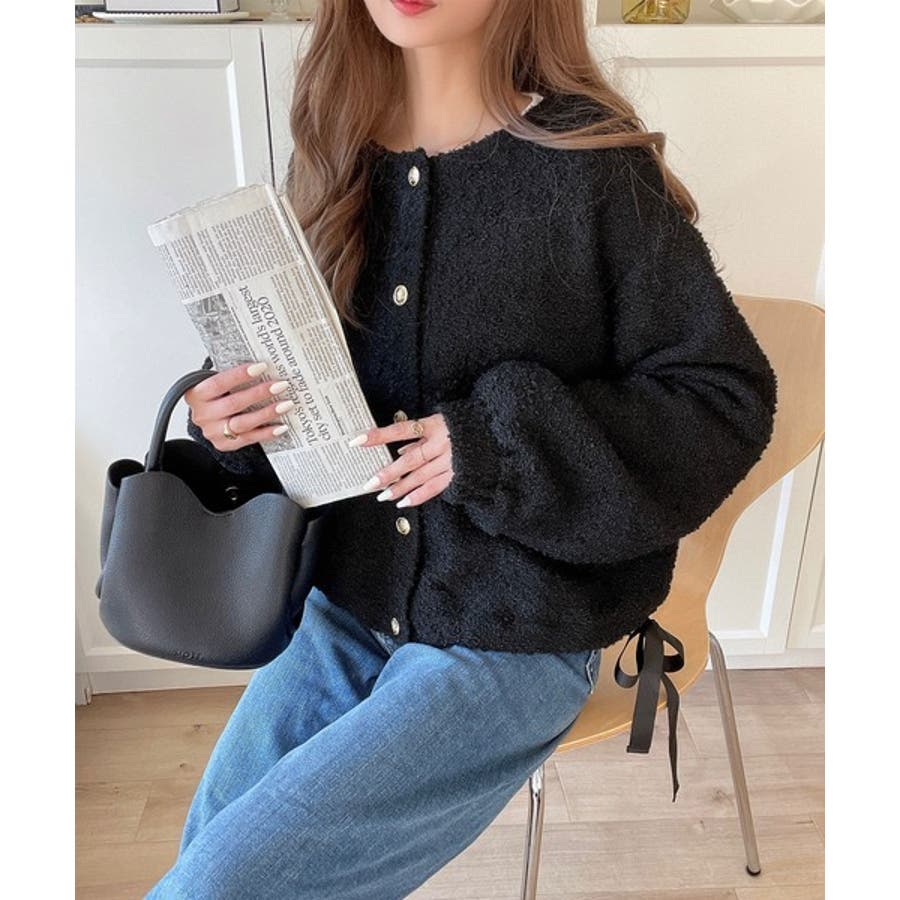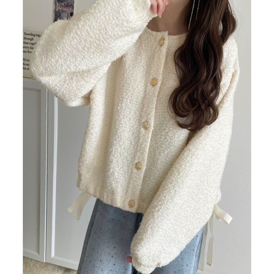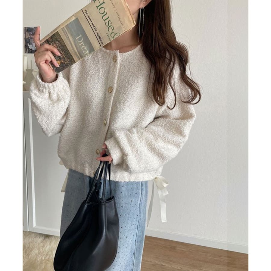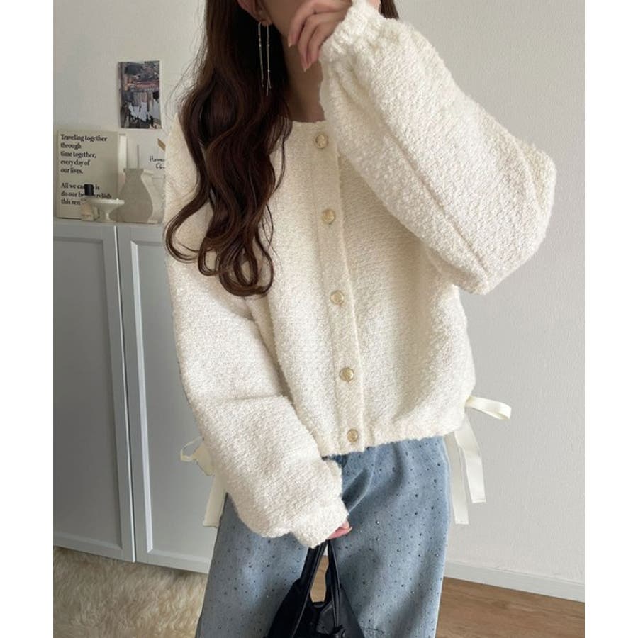 サイドリボンで差をつける! 前後2wayふわふわブークレ素材カーディガン