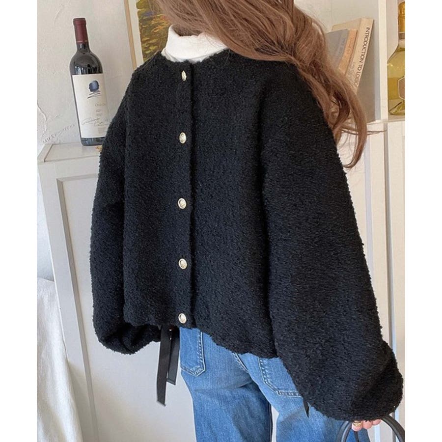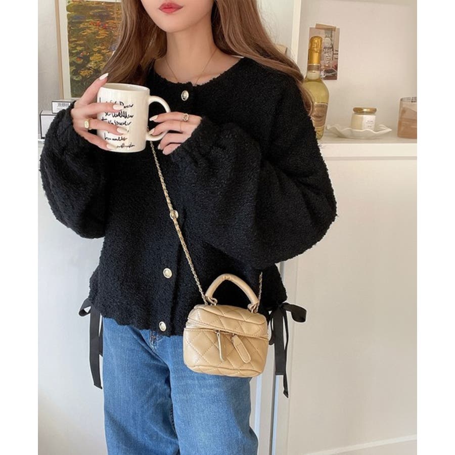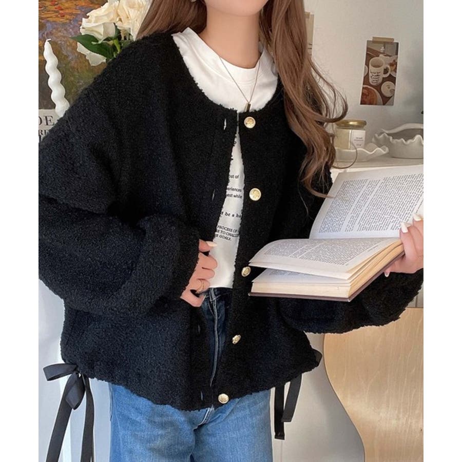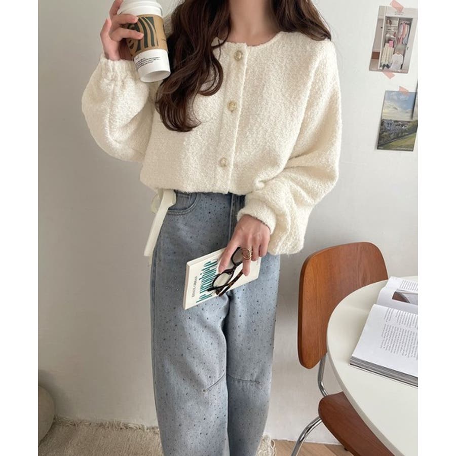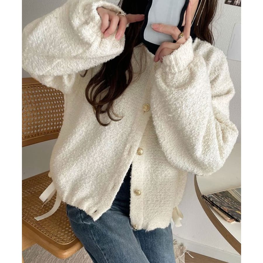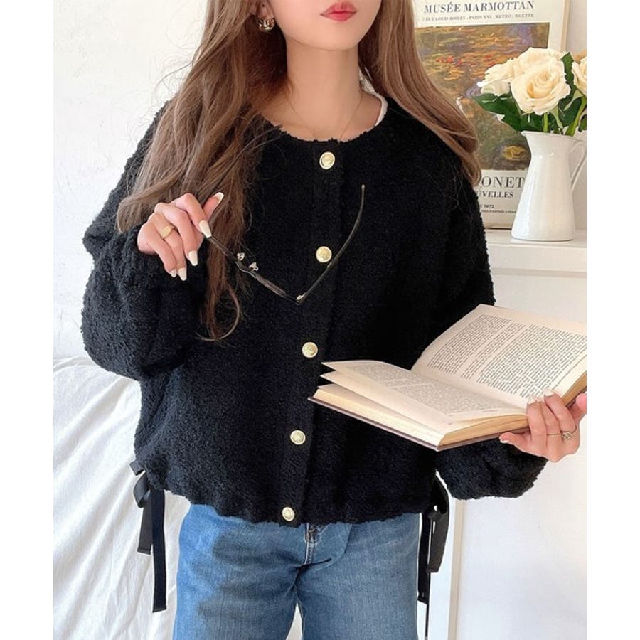 サイドリボンで差をつける! 前後2wayふわふわブークレ素材カーディガン
