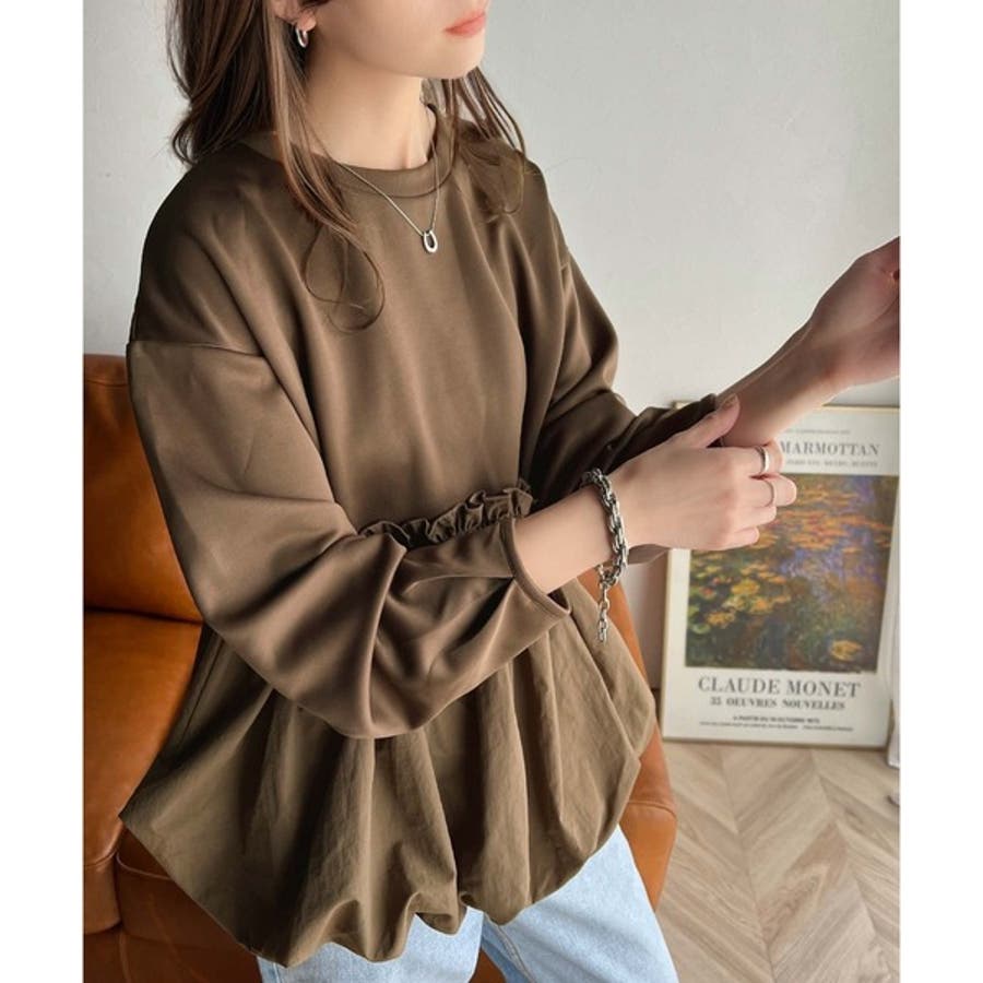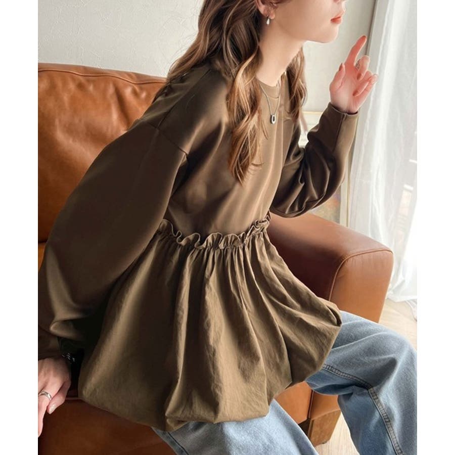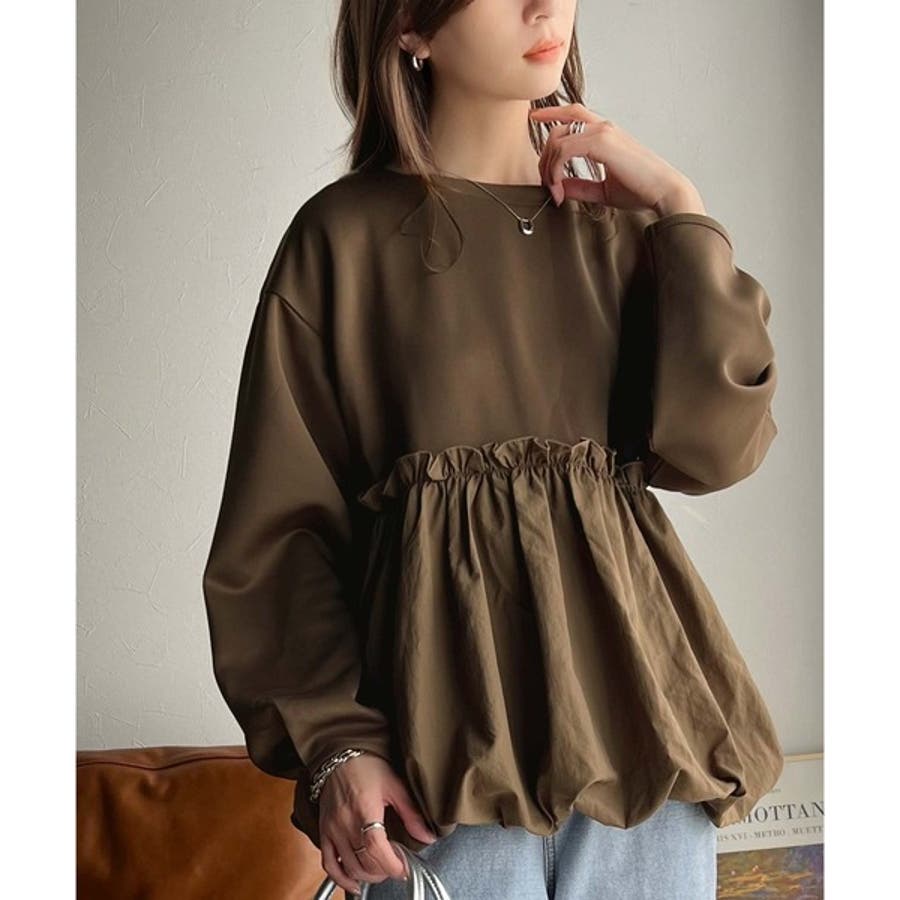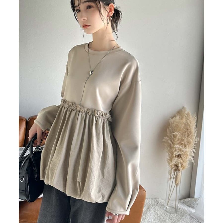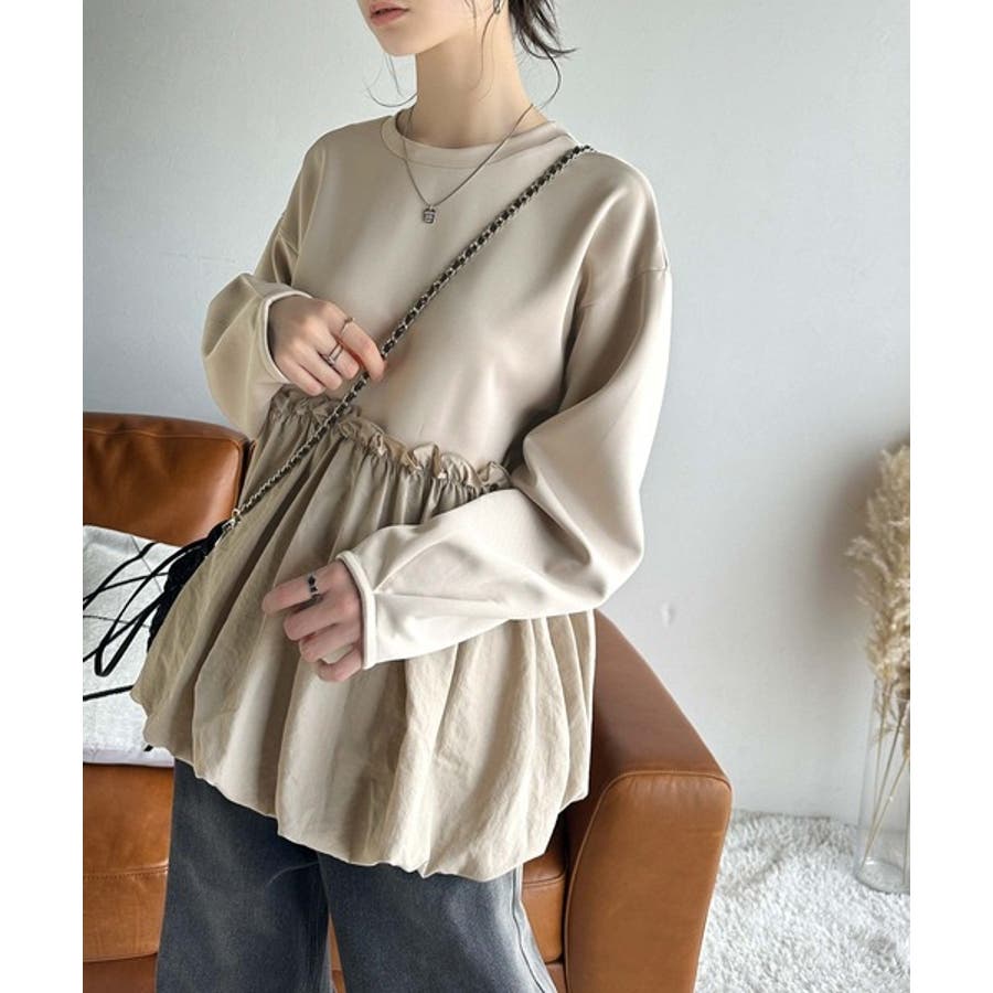大人可愛く着映えする。異素材ドッキングペプラム切替バルーントップス