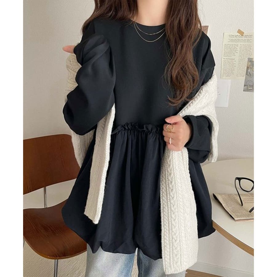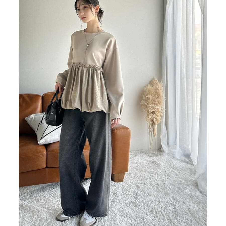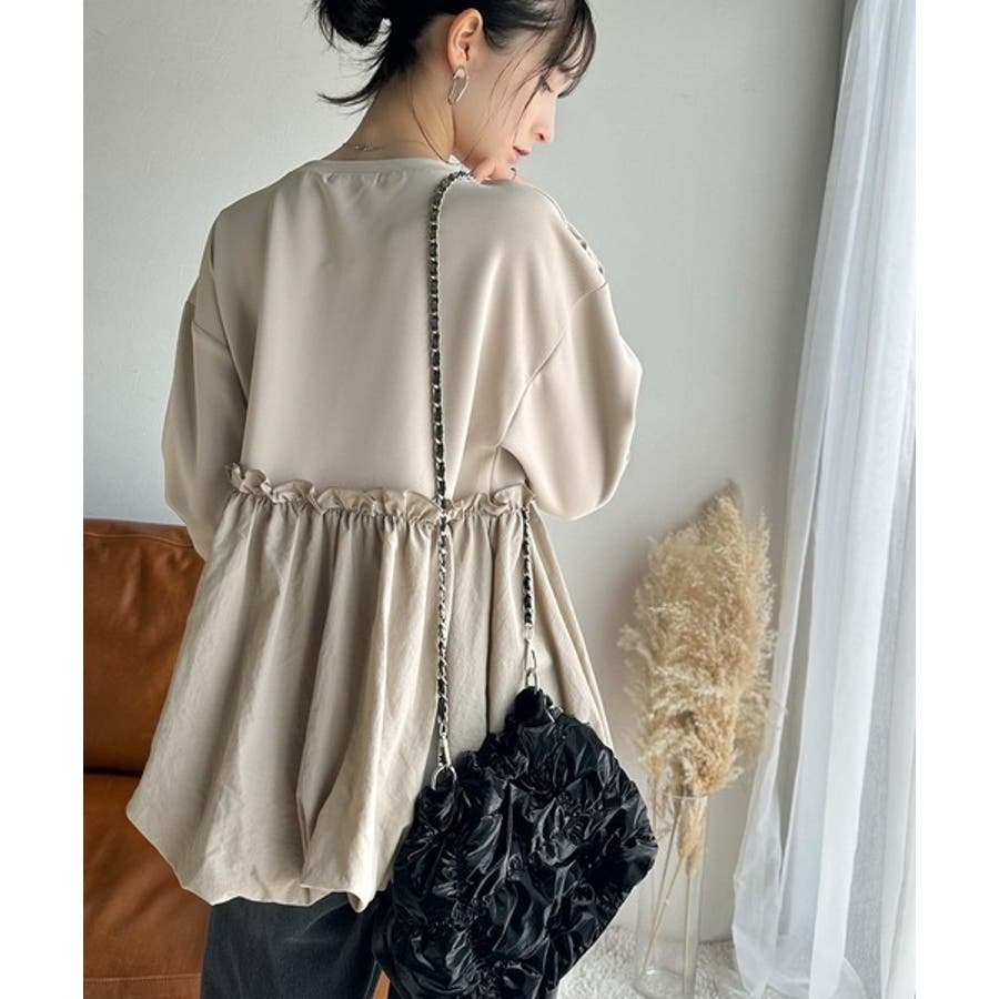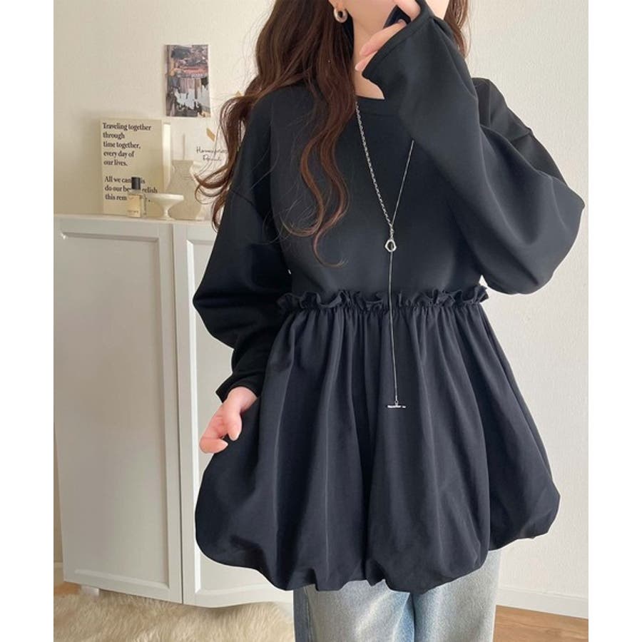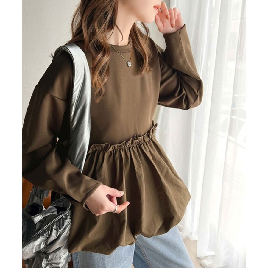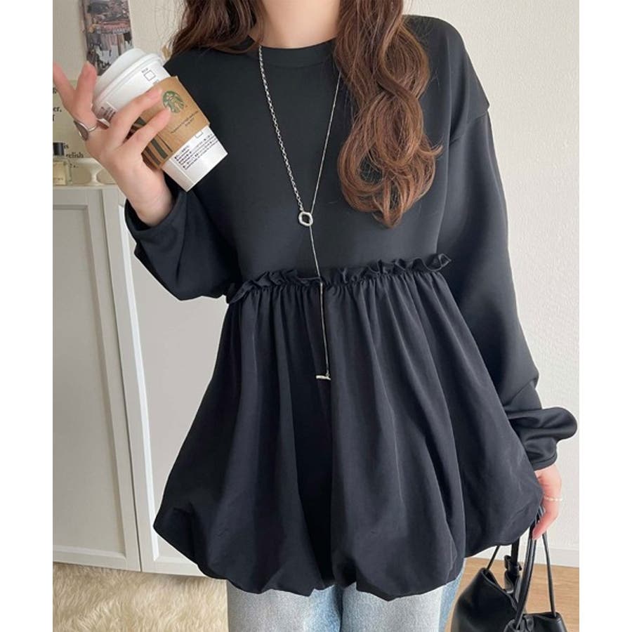 大人可愛く着映えする。異素材ドッキングペプラム切替バルーントップス