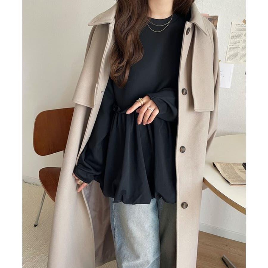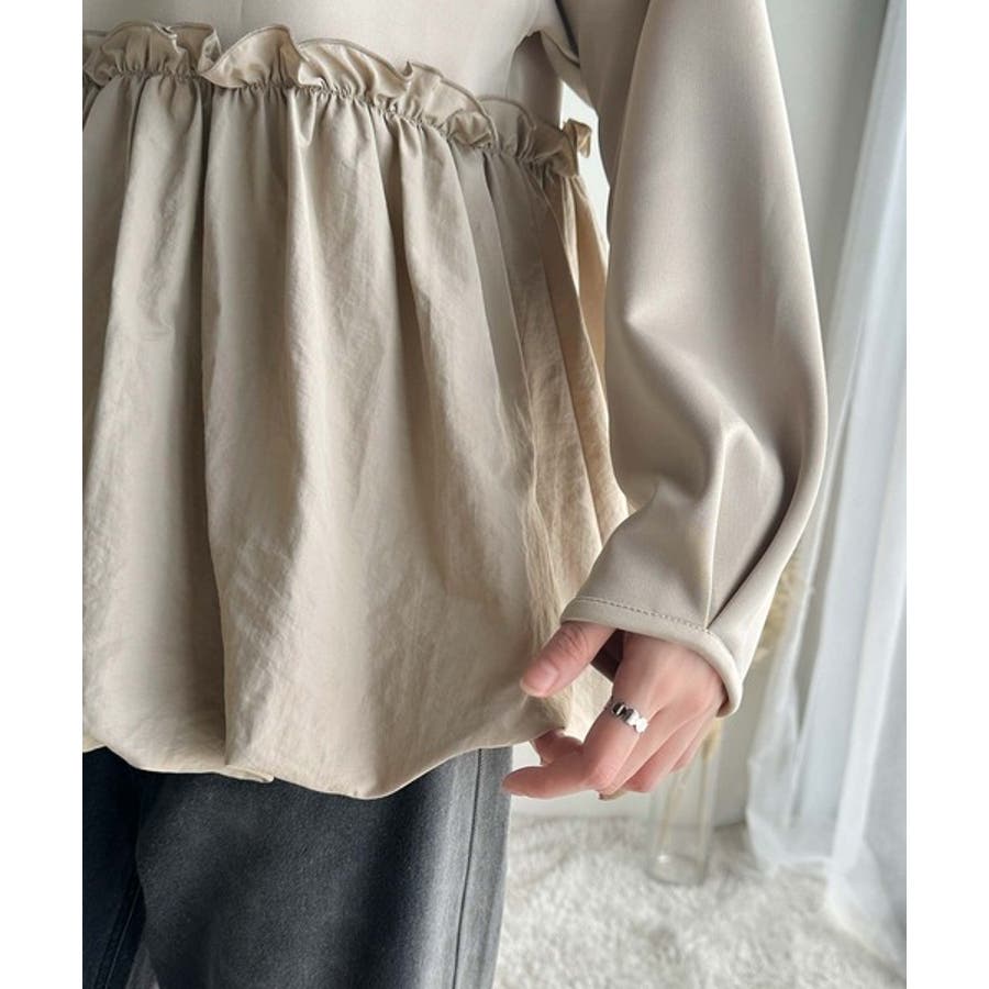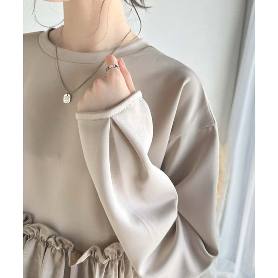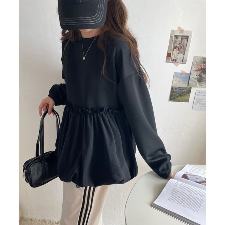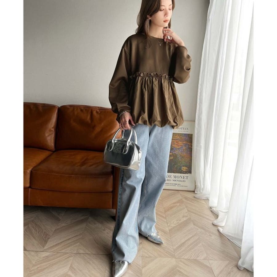大人可愛く着映えする。異素材ドッキングペプラム切替バルーントップス