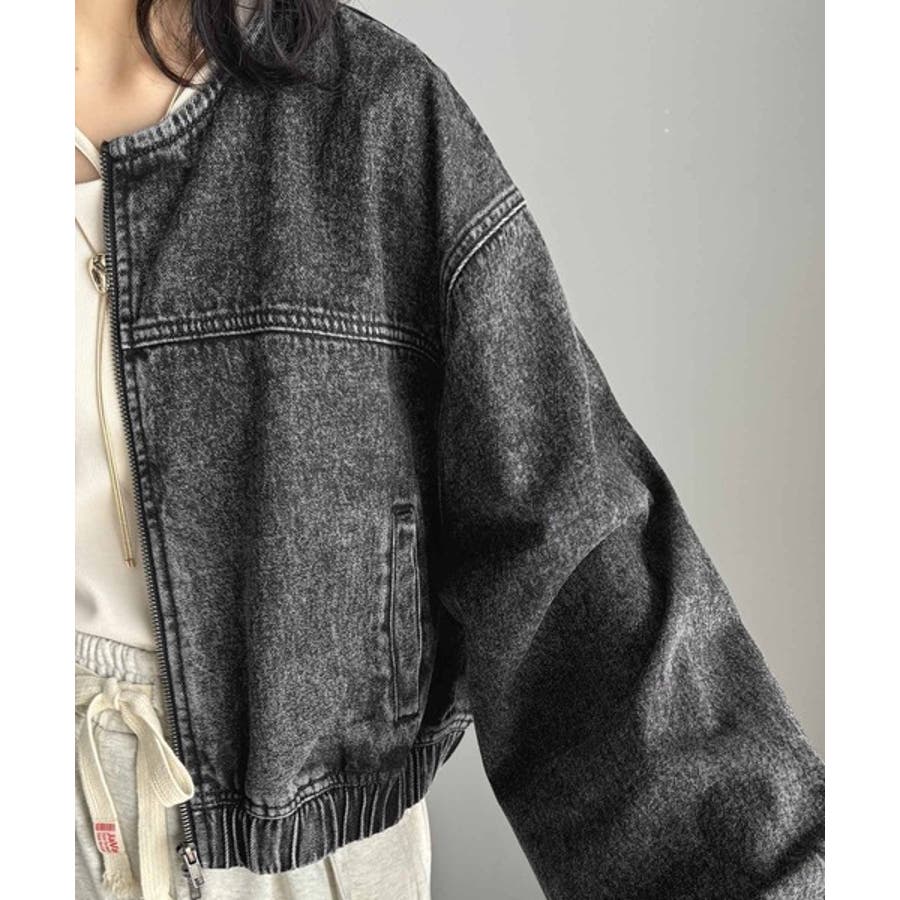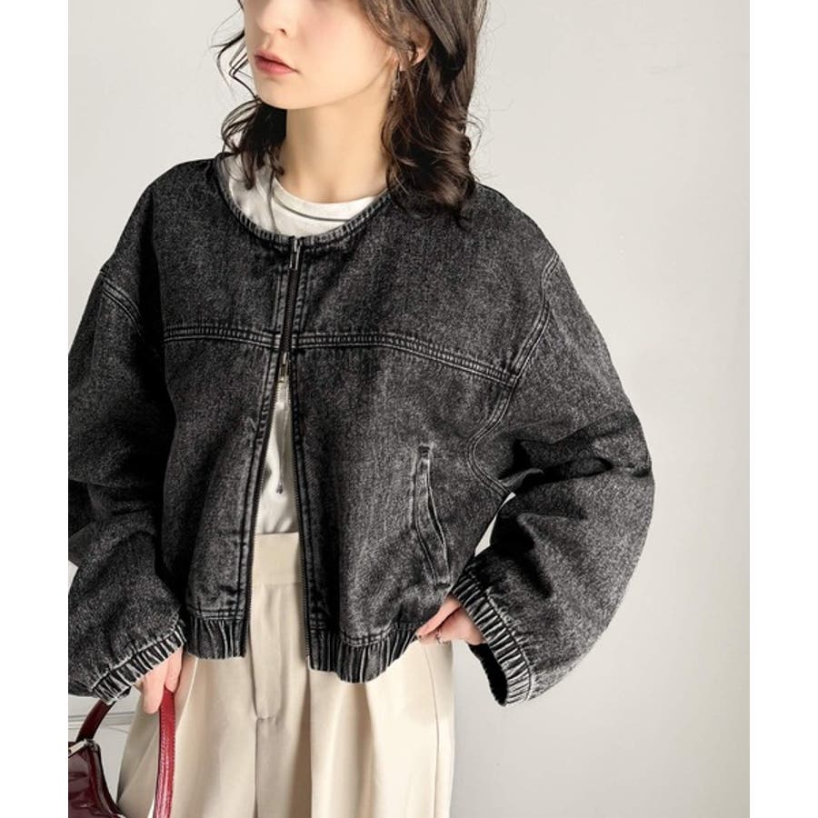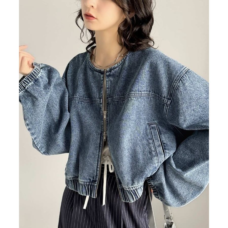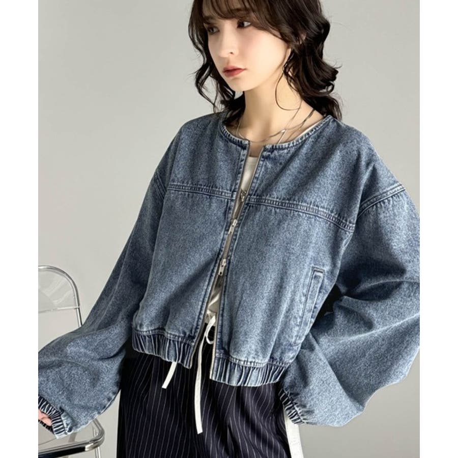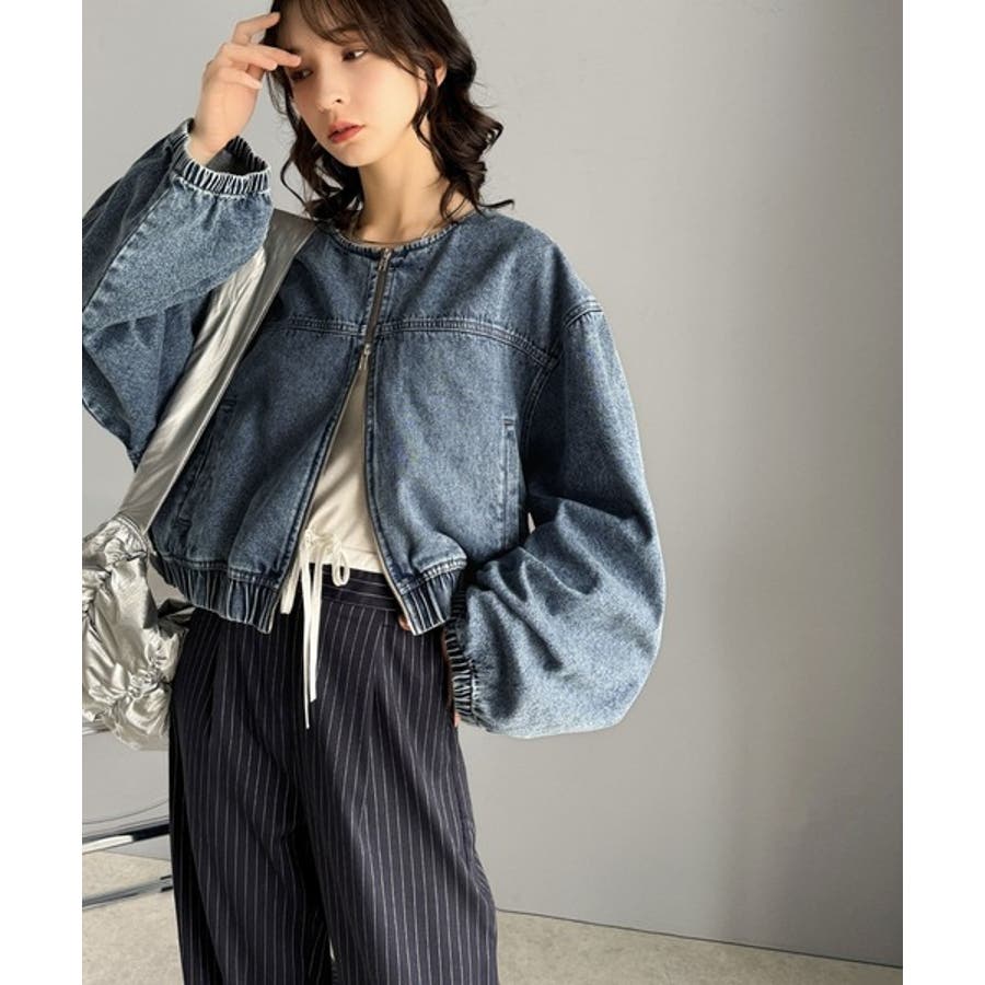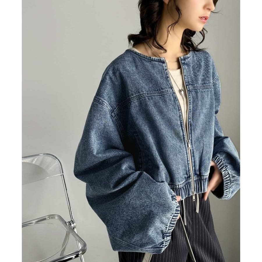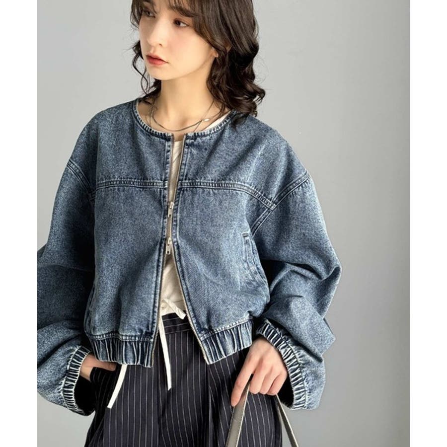 すっきりとしたノーカラーがポイントのデニムブルゾン。