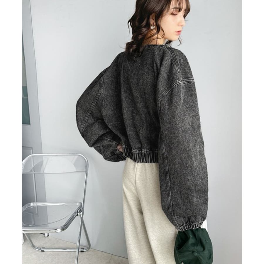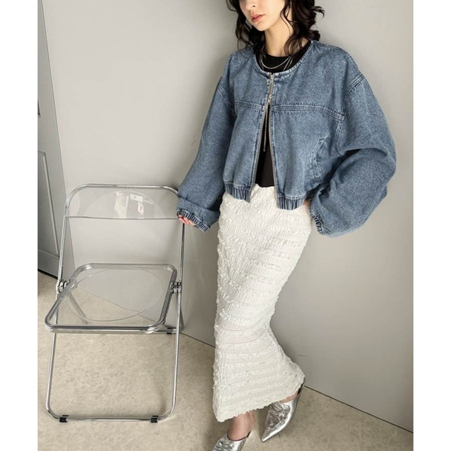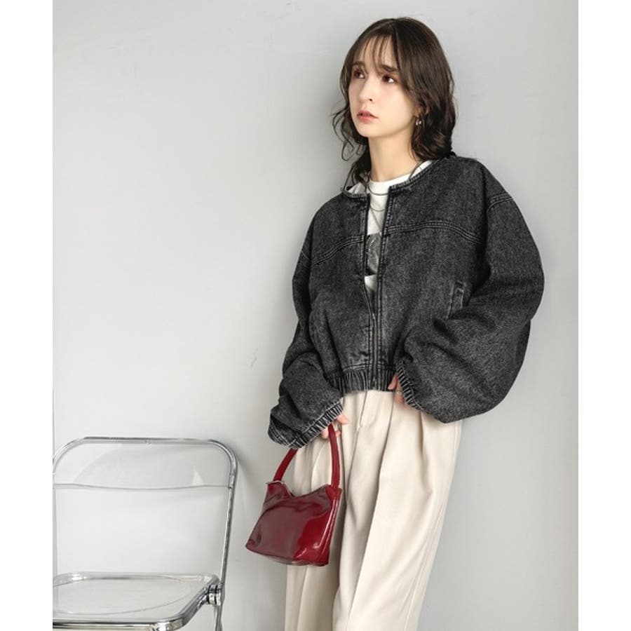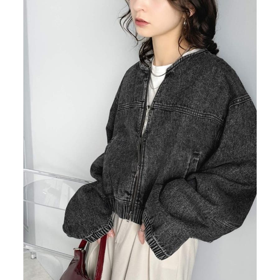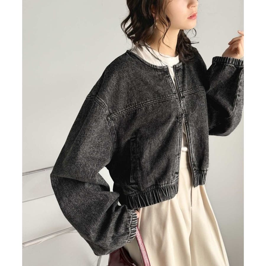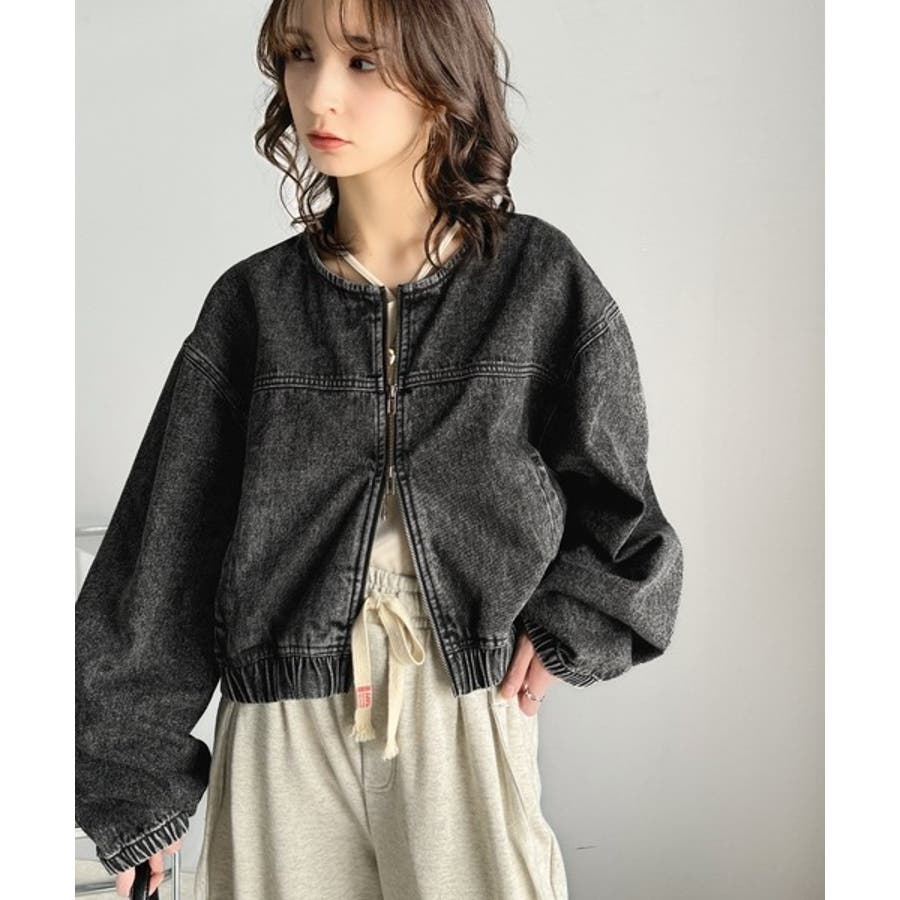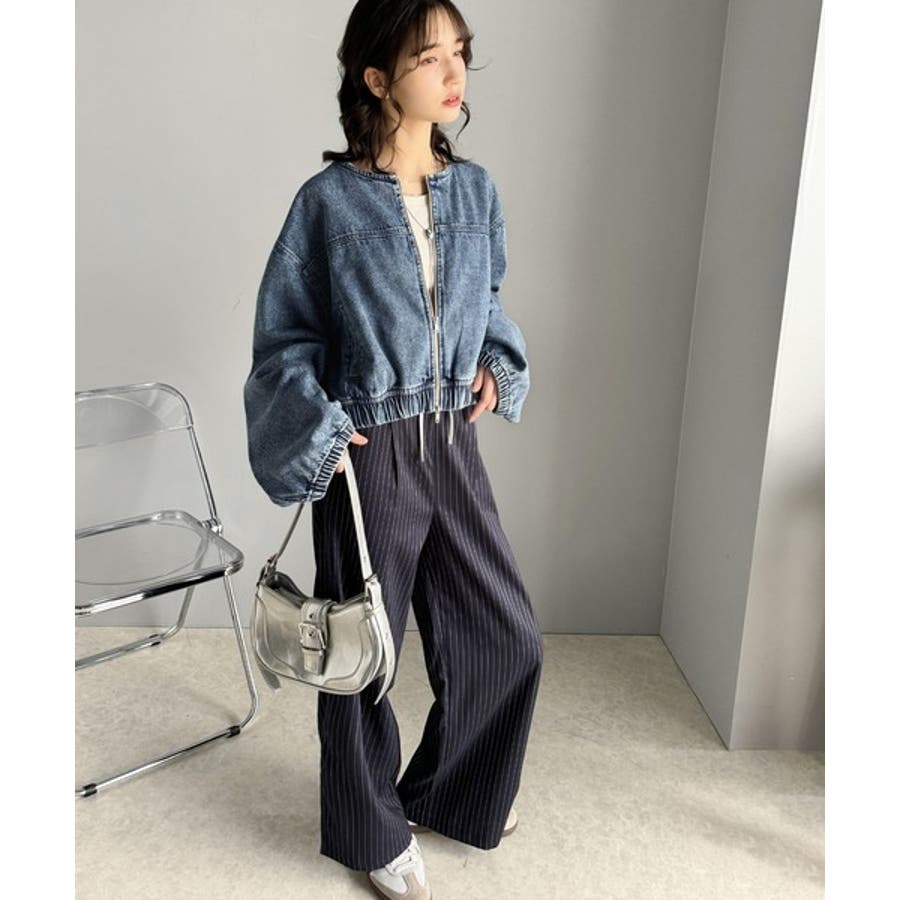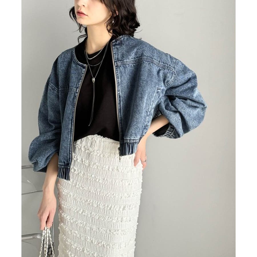 すっきりとしたノーカラーがポイントのデニムブルゾン。