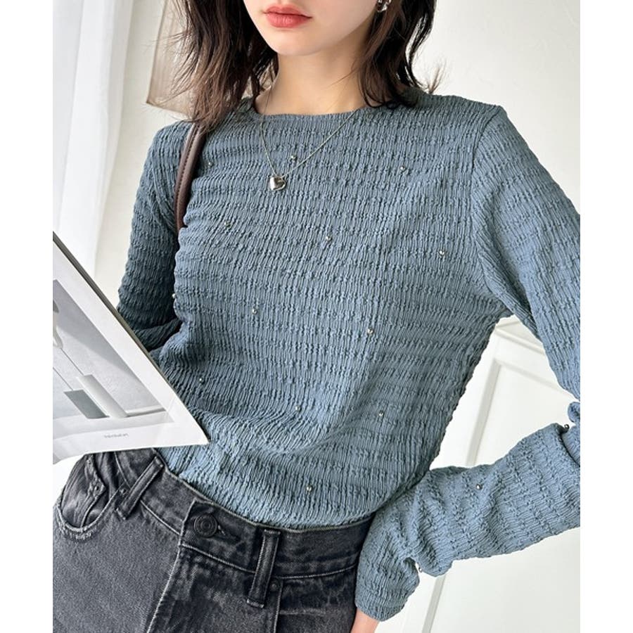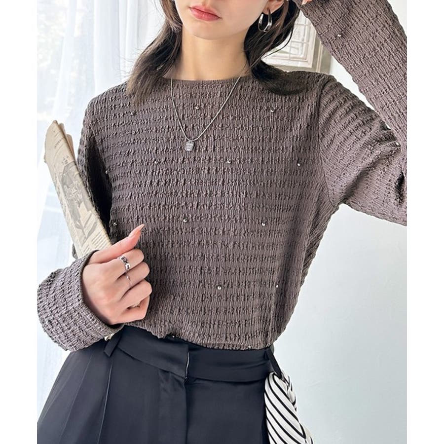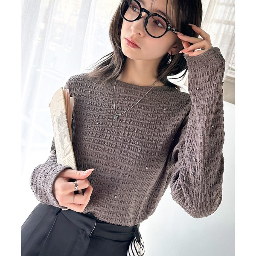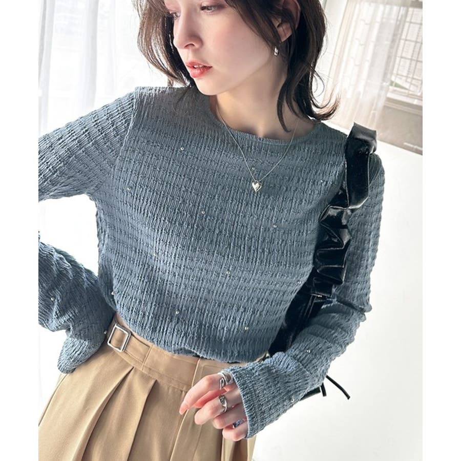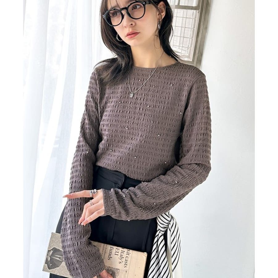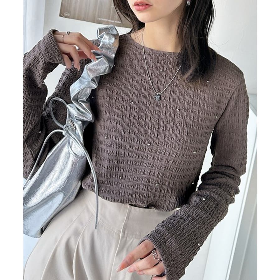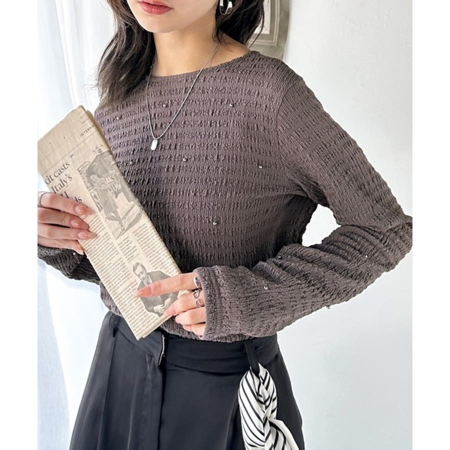 【ダークグレー】ときめきを閉じ込めて。ビジュードットが煌めくシャーリングニットの長袖トップス