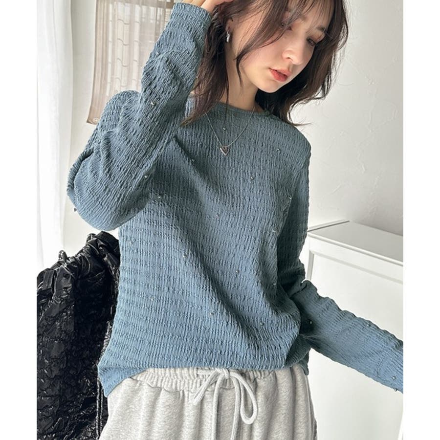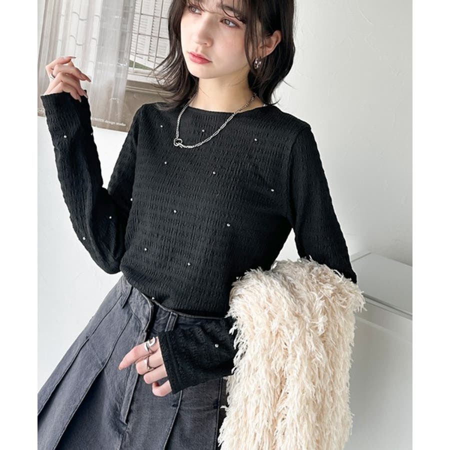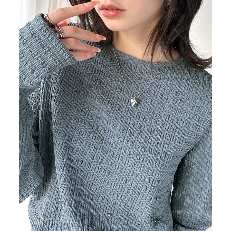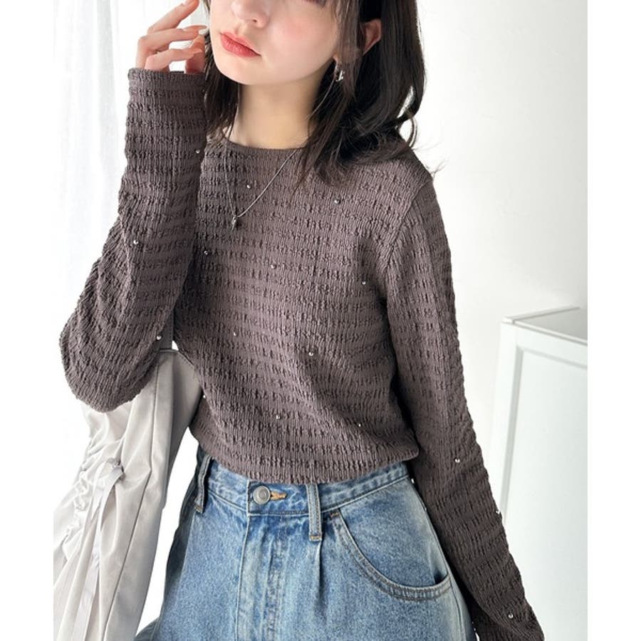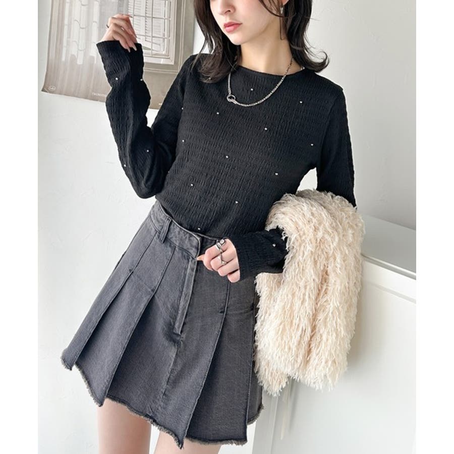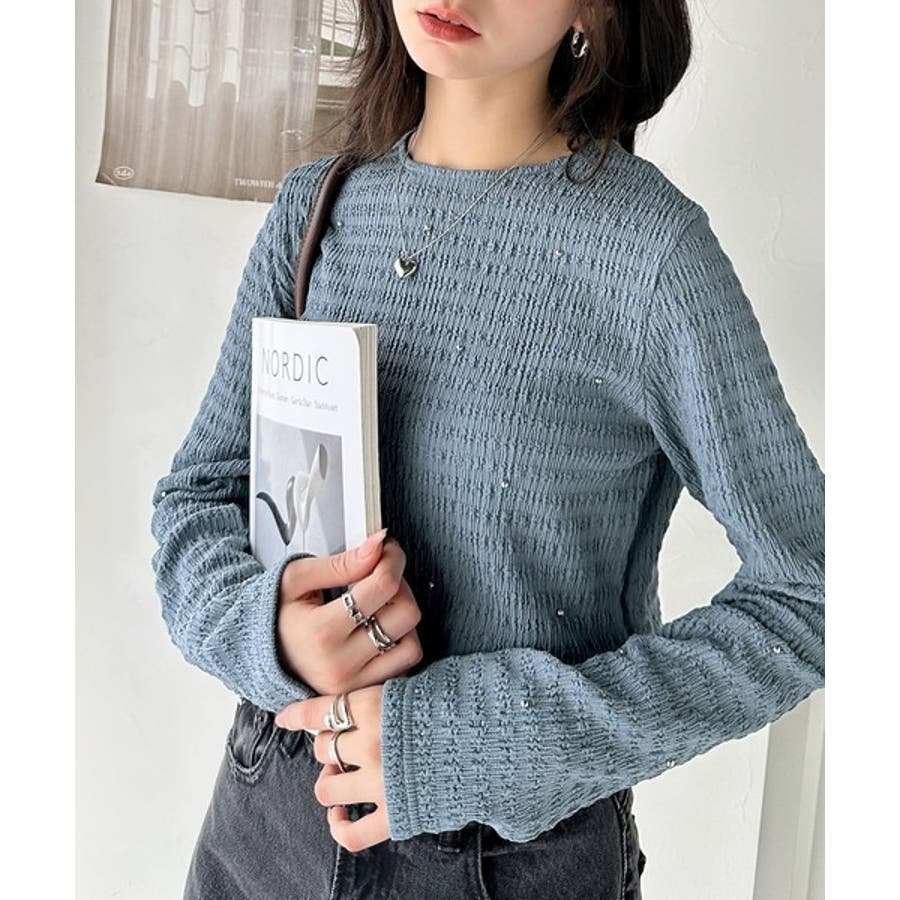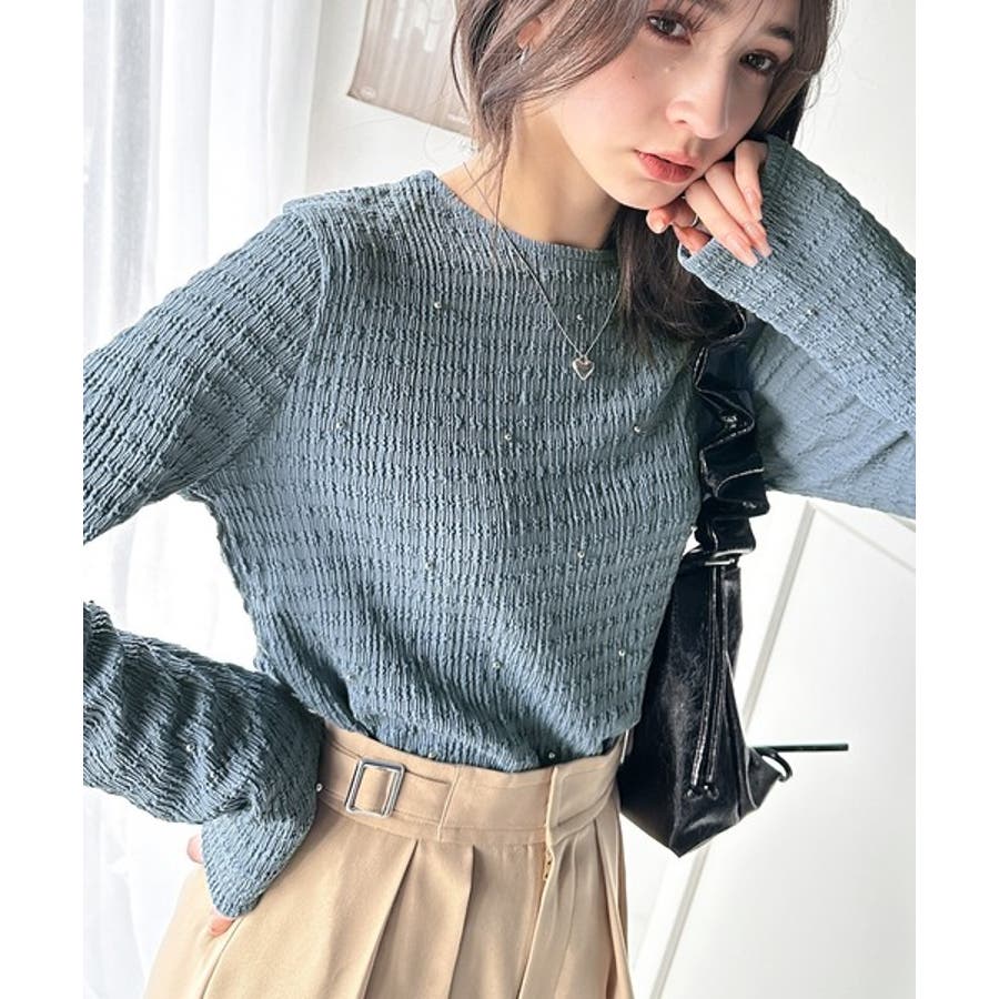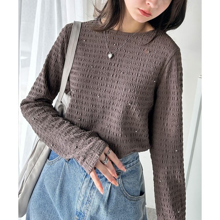 【ダークグレー】ときめきを閉じ込めて。ビジュードットが煌めくシャーリングニットの長袖トップス