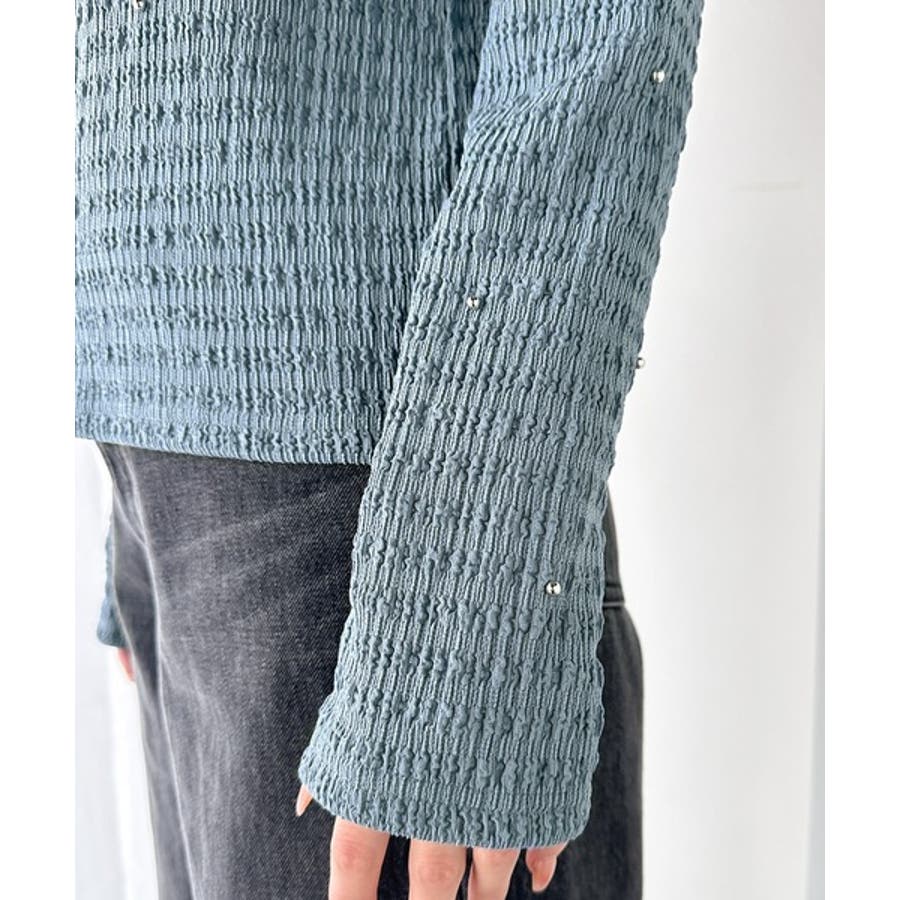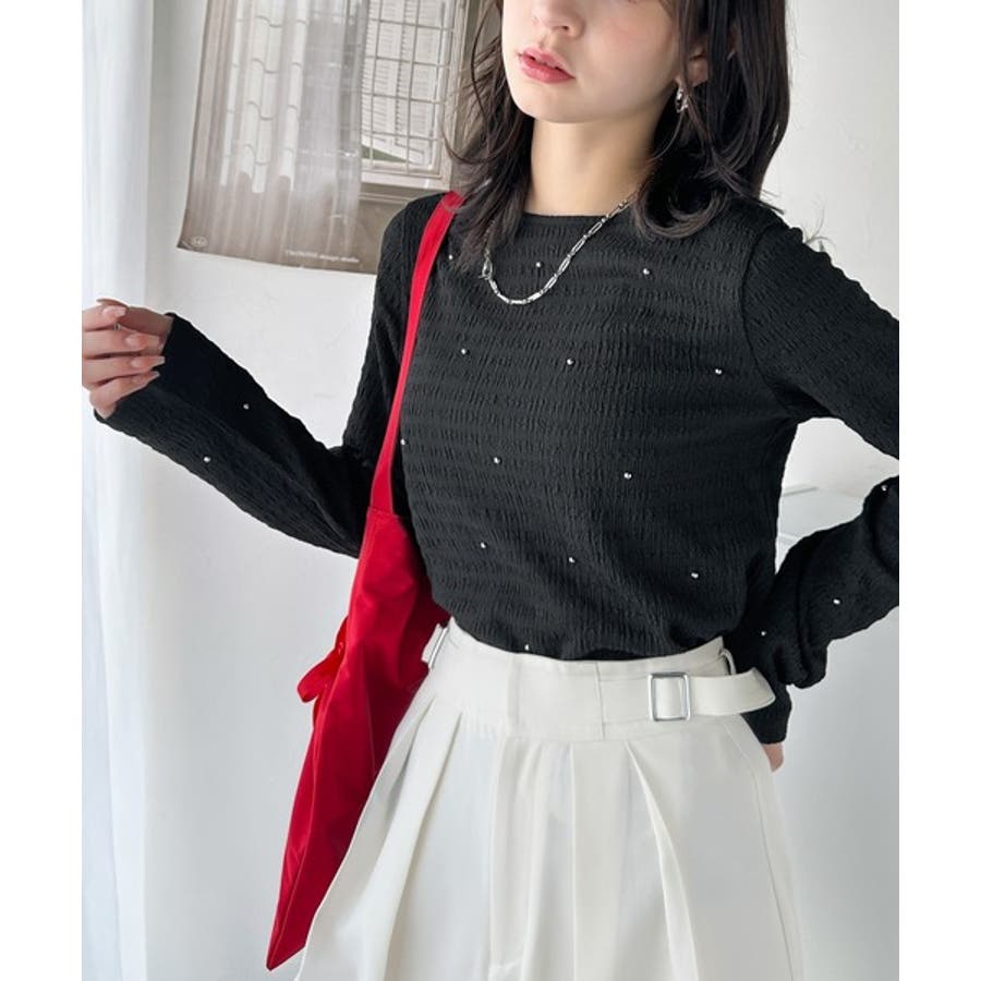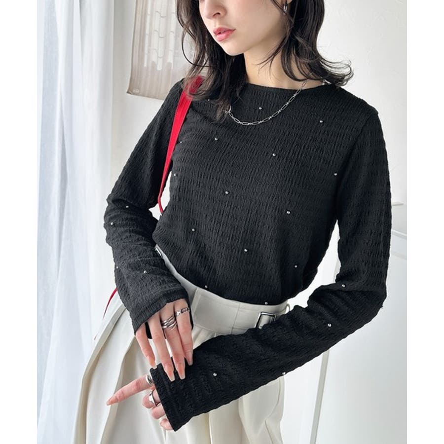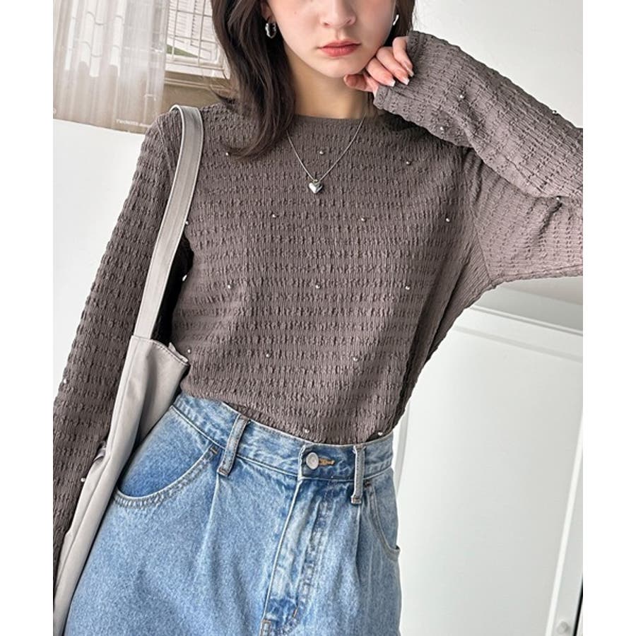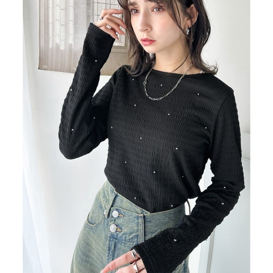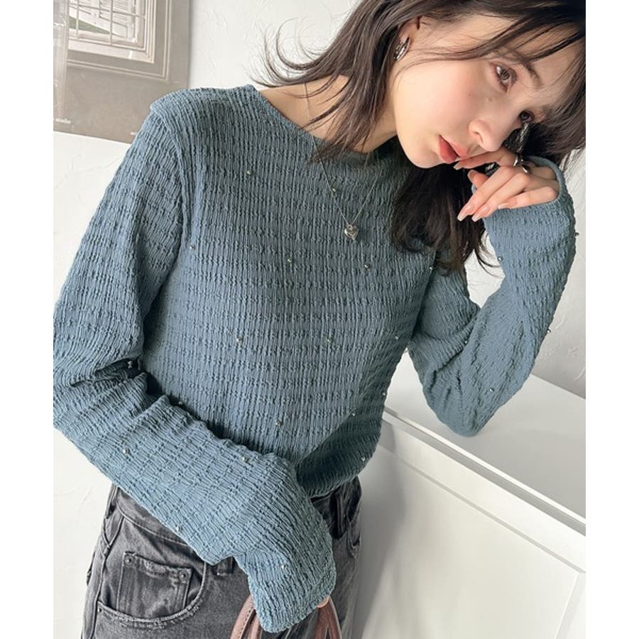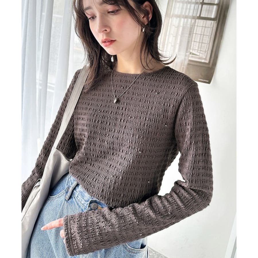 【ダークグレー】ときめきを閉じ込めて。ビジュードットが煌めくシャーリングニットの長袖トップス