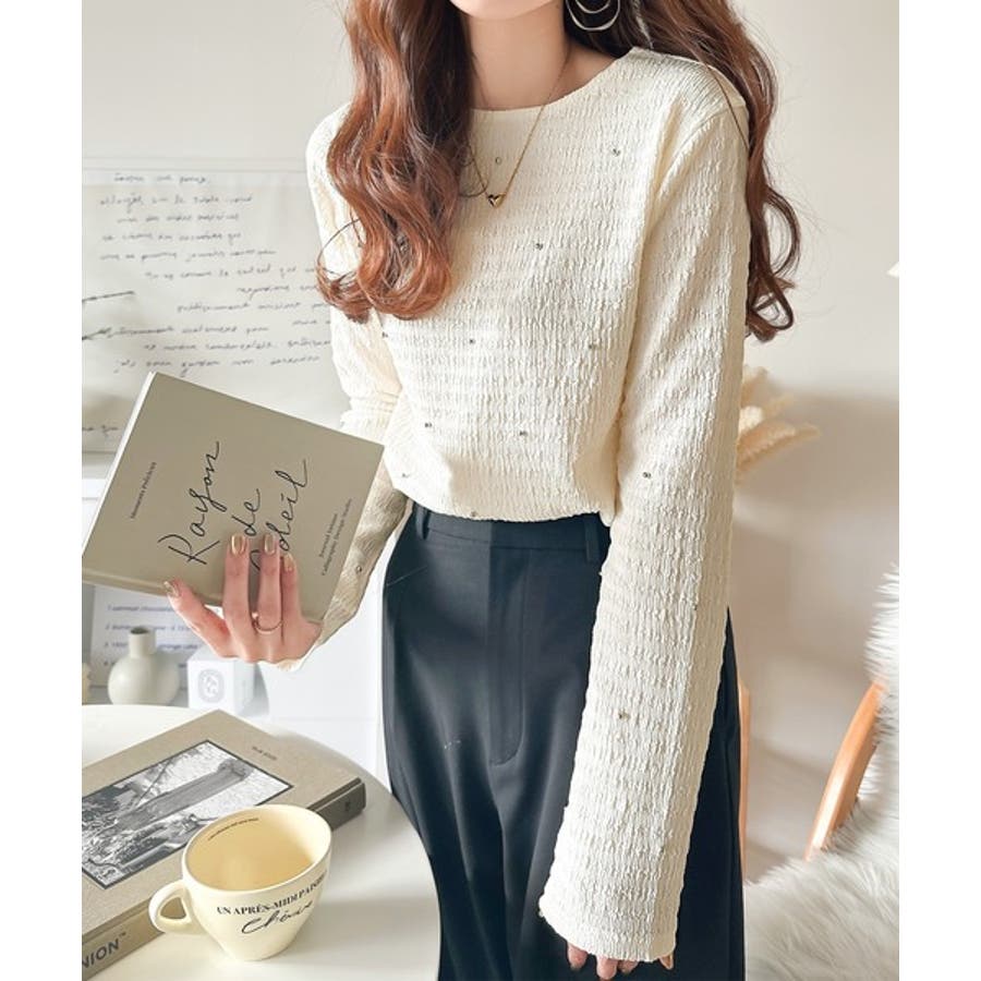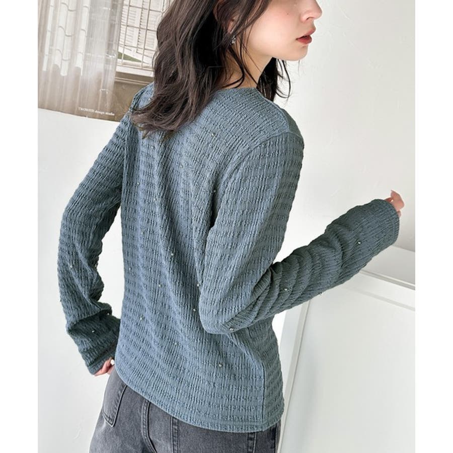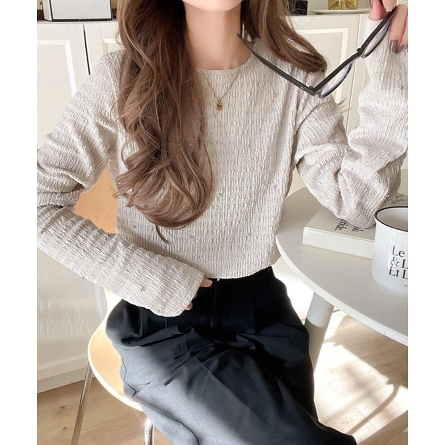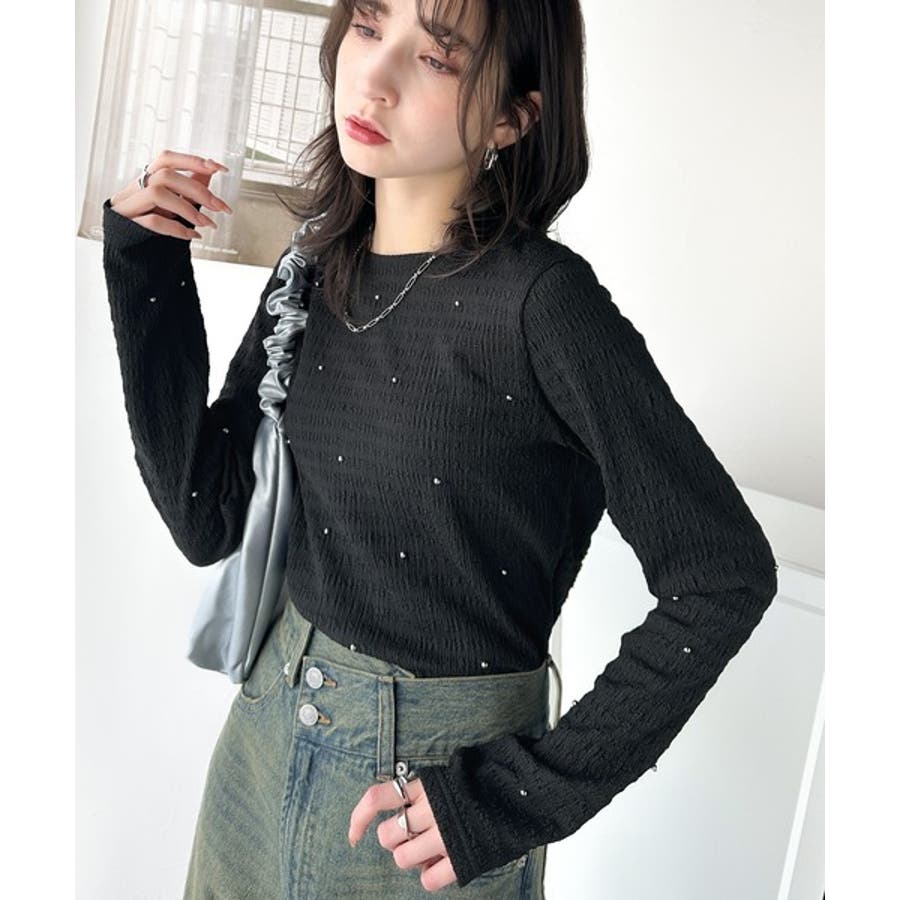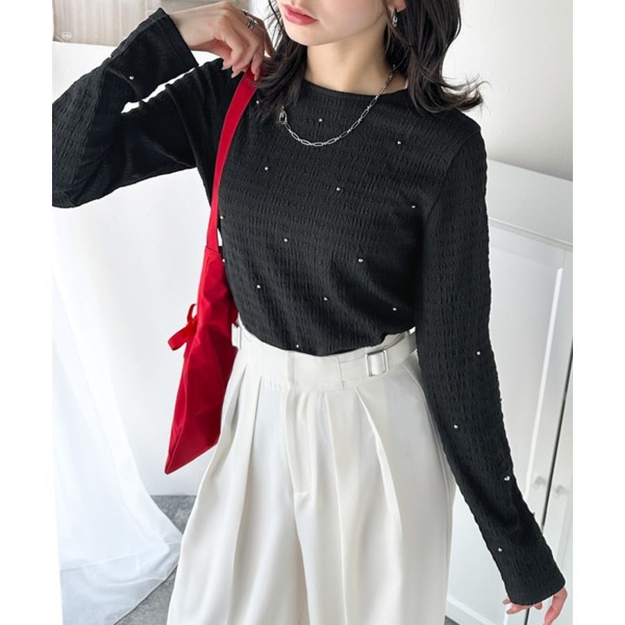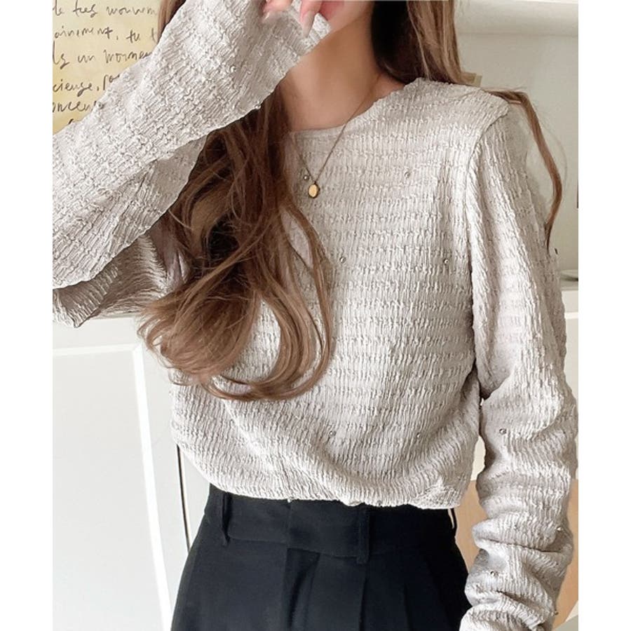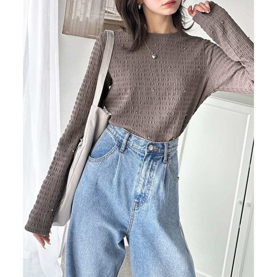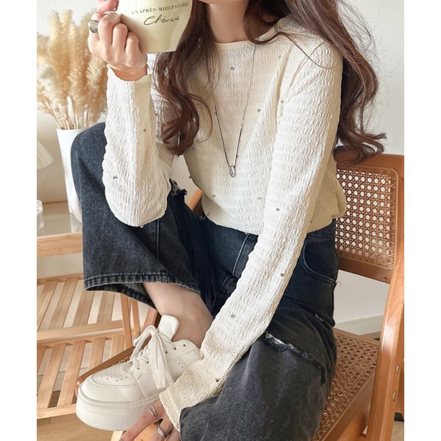 【ダークグレー】ときめきを閉じ込めて。ビジュードットが煌めくシャーリングニットの長袖トップス