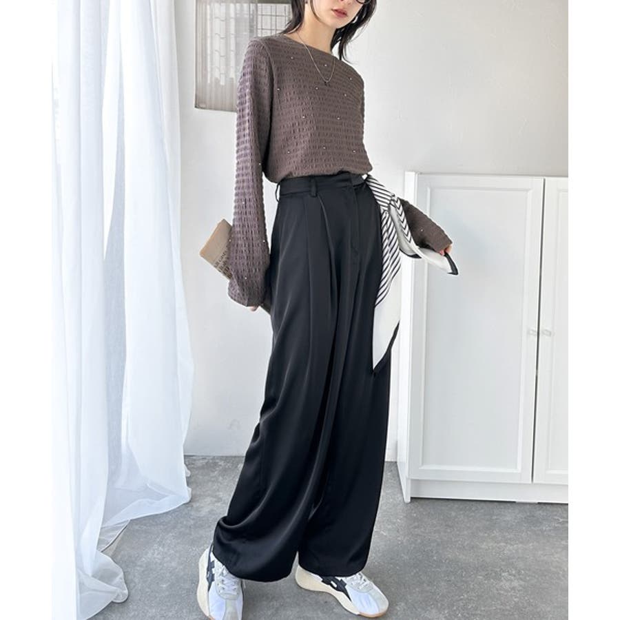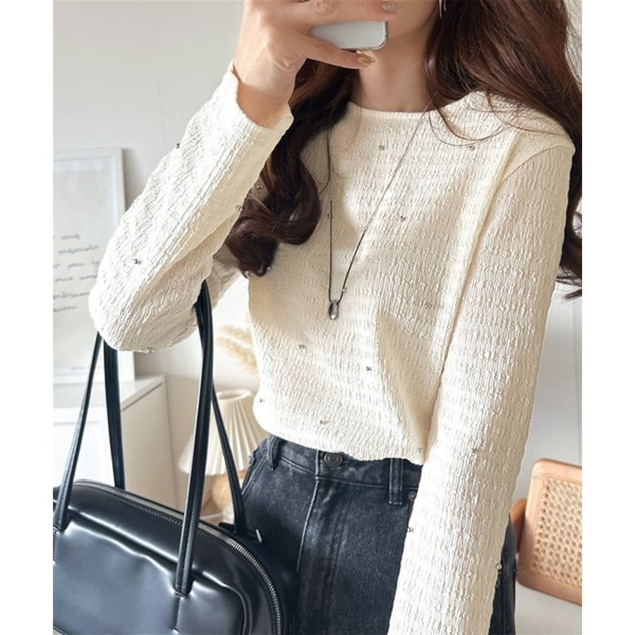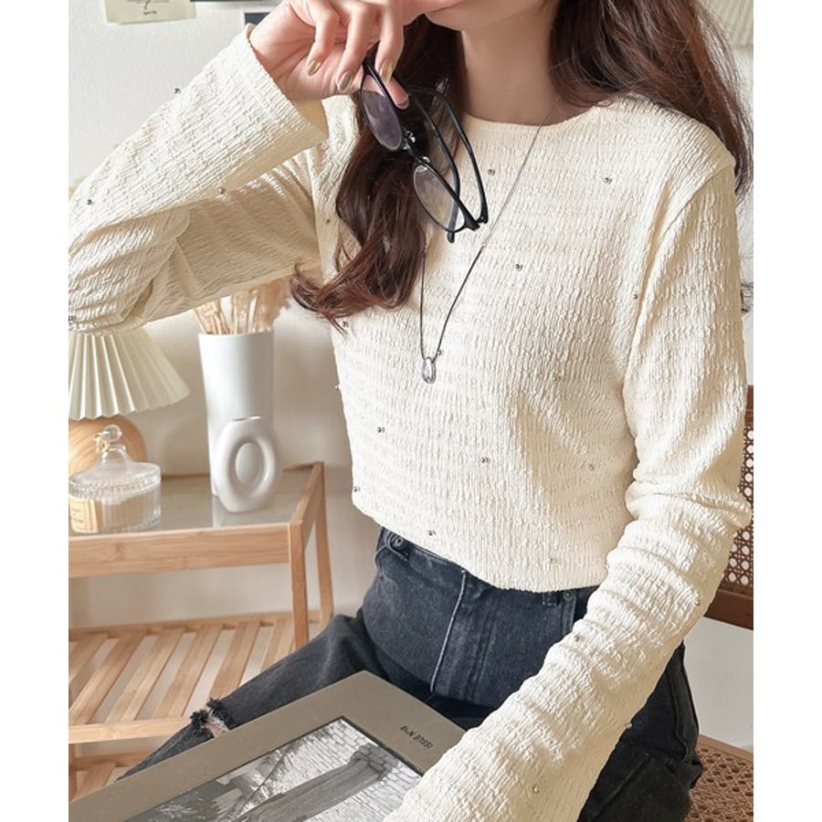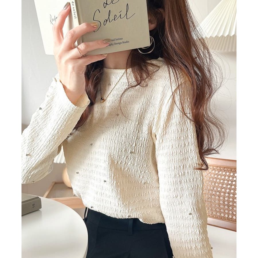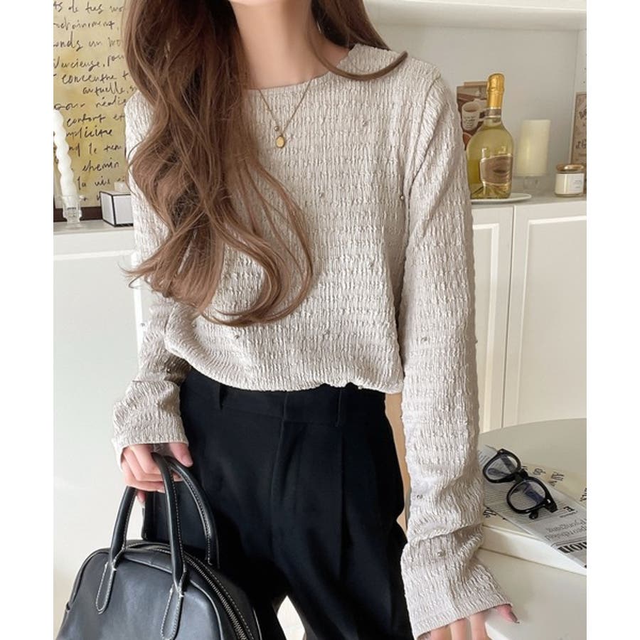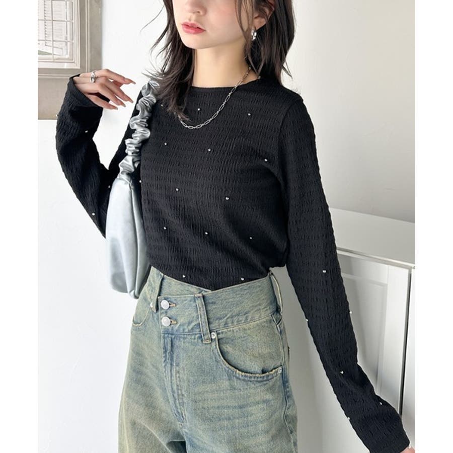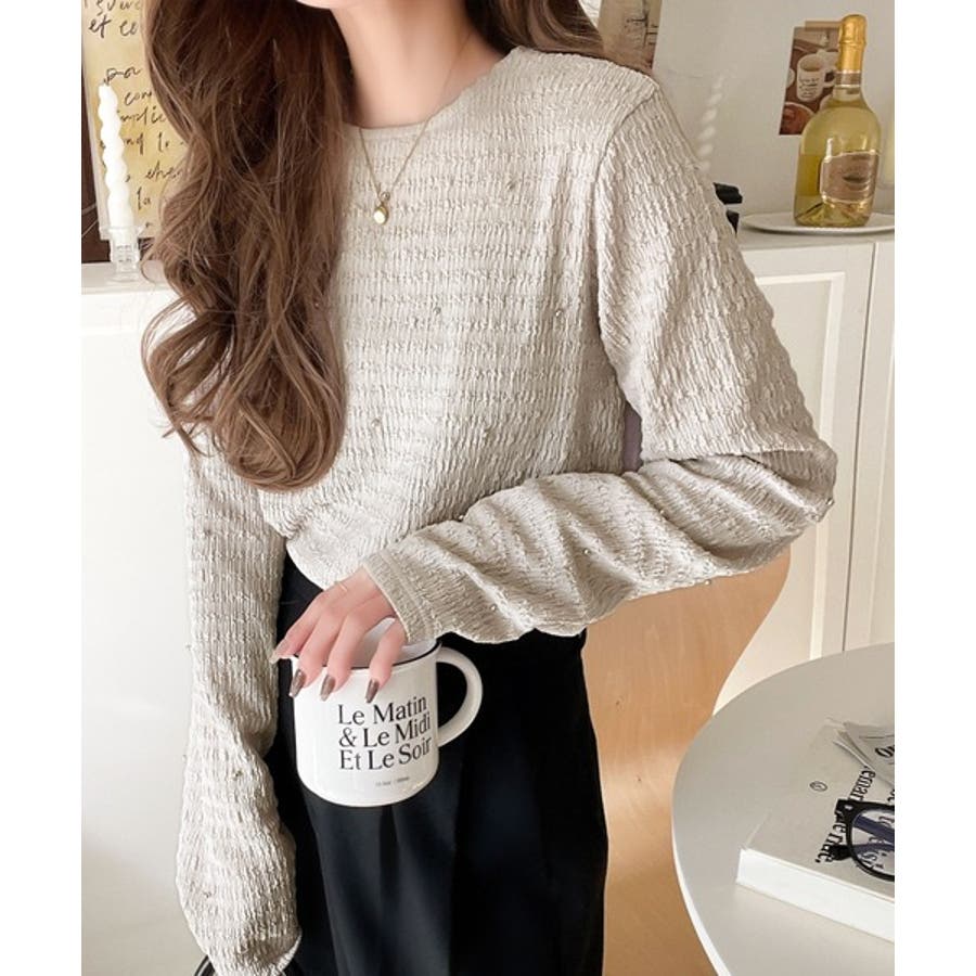 【ダークグレー】ときめきを閉じ込めて。ビジュードットが煌めくシャーリングニットの長袖トップス