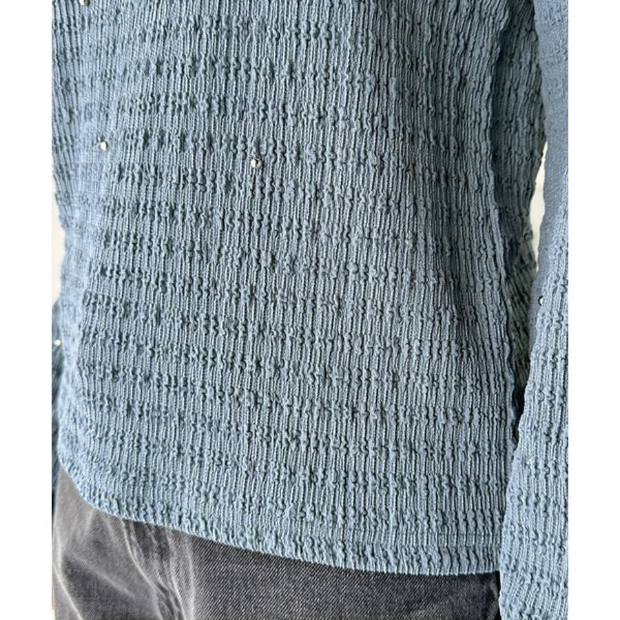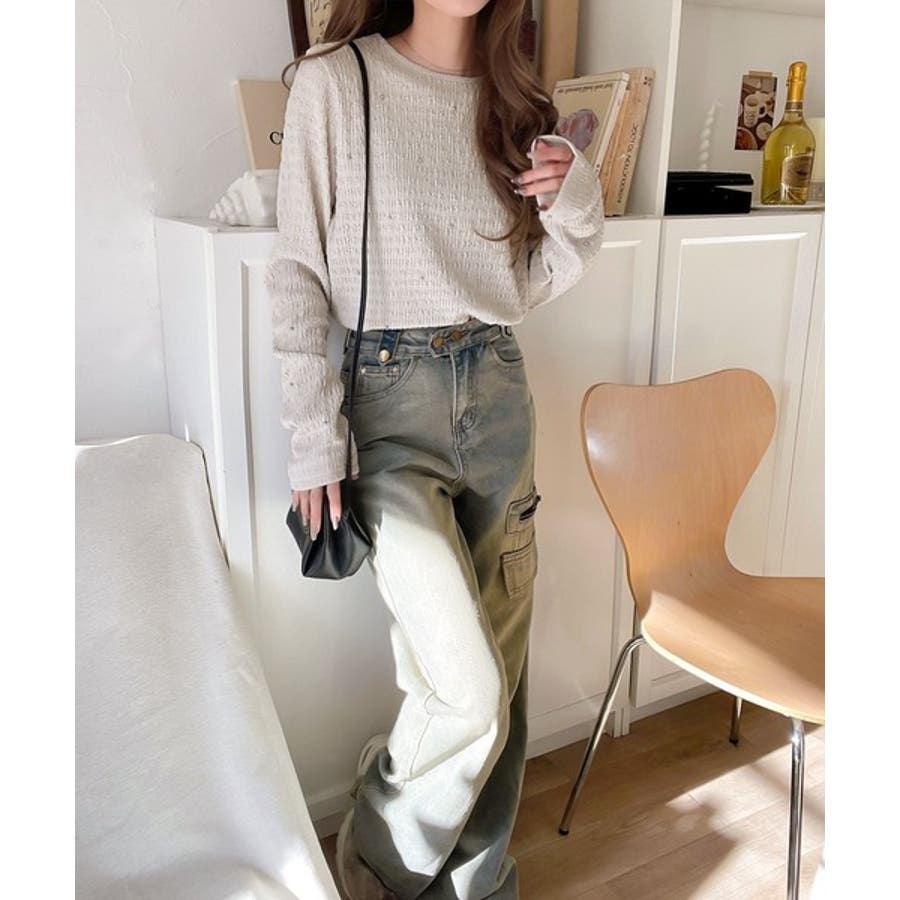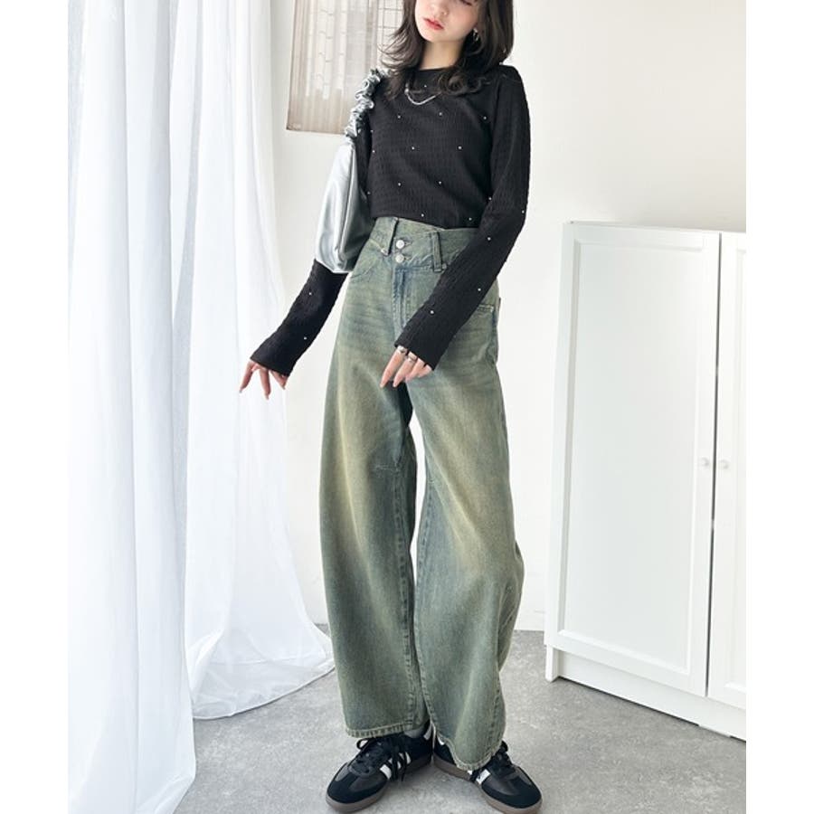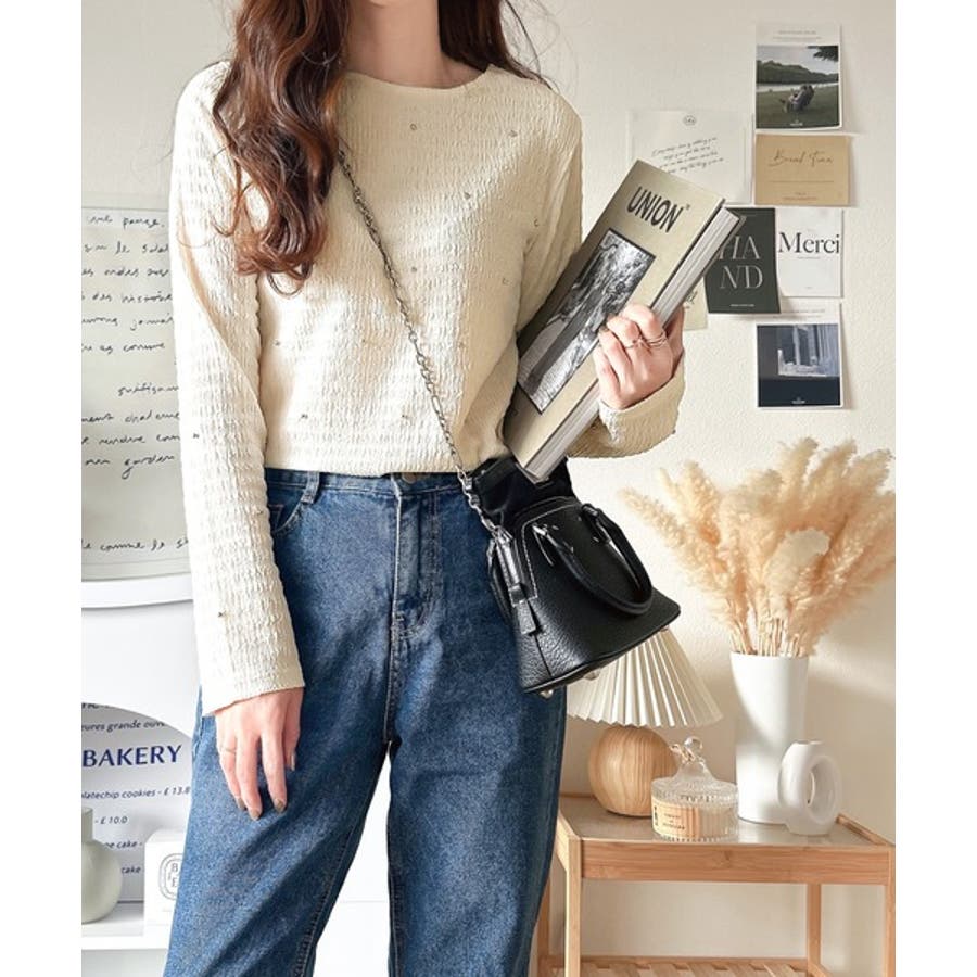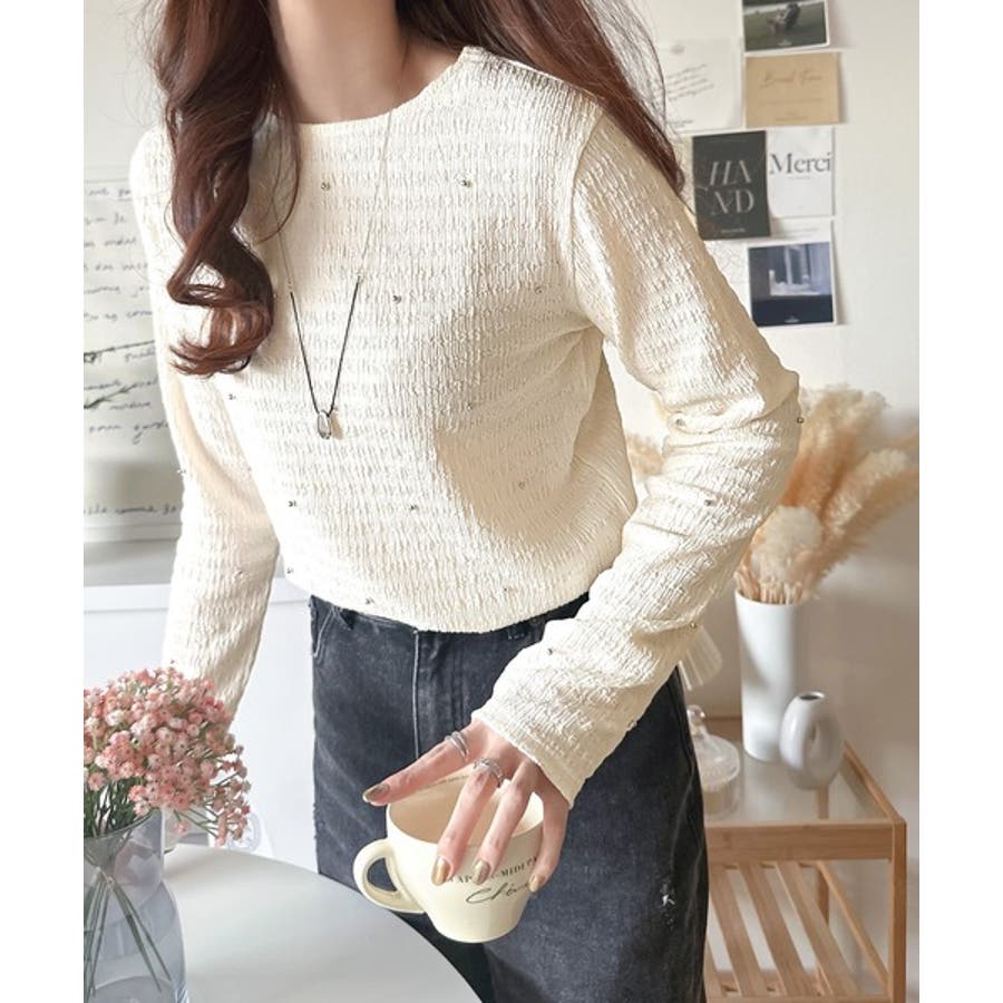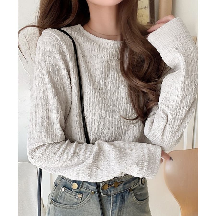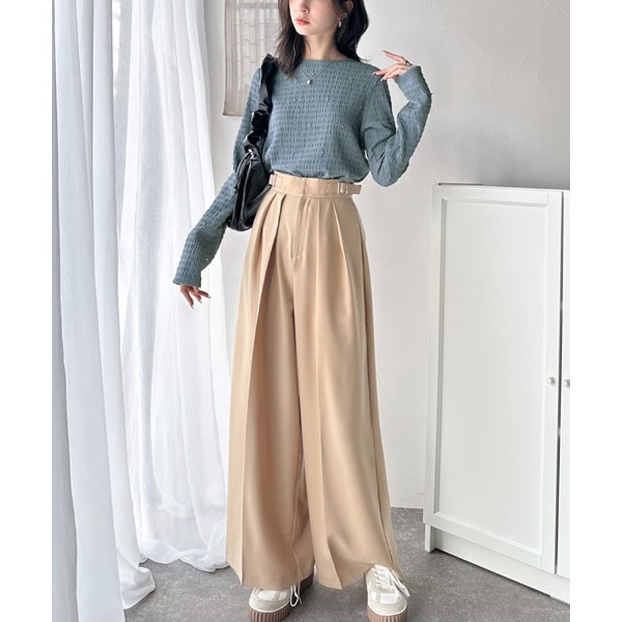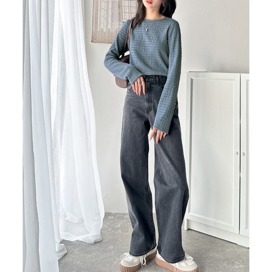 【ダークグレー】ときめきを閉じ込めて。ビジュードットが煌めくシャーリングニットの長袖トップス