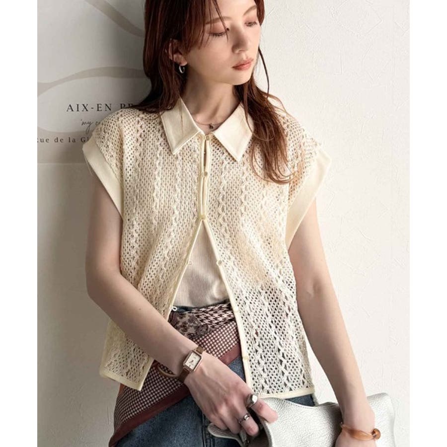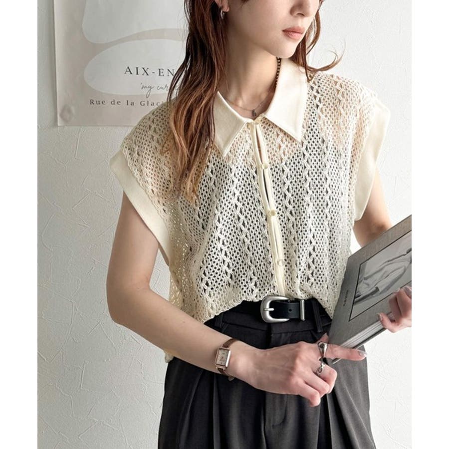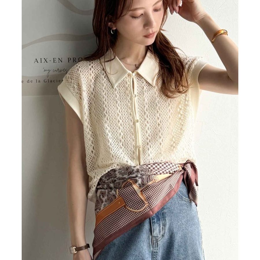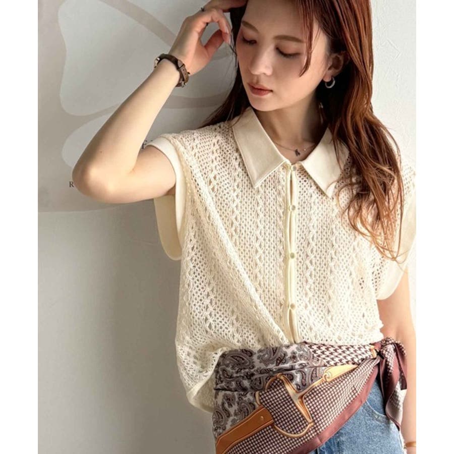 品の良さ漂う、大人カジュアル。クロシェ風レース素材衿付きフレンチスリーブシャツブ…