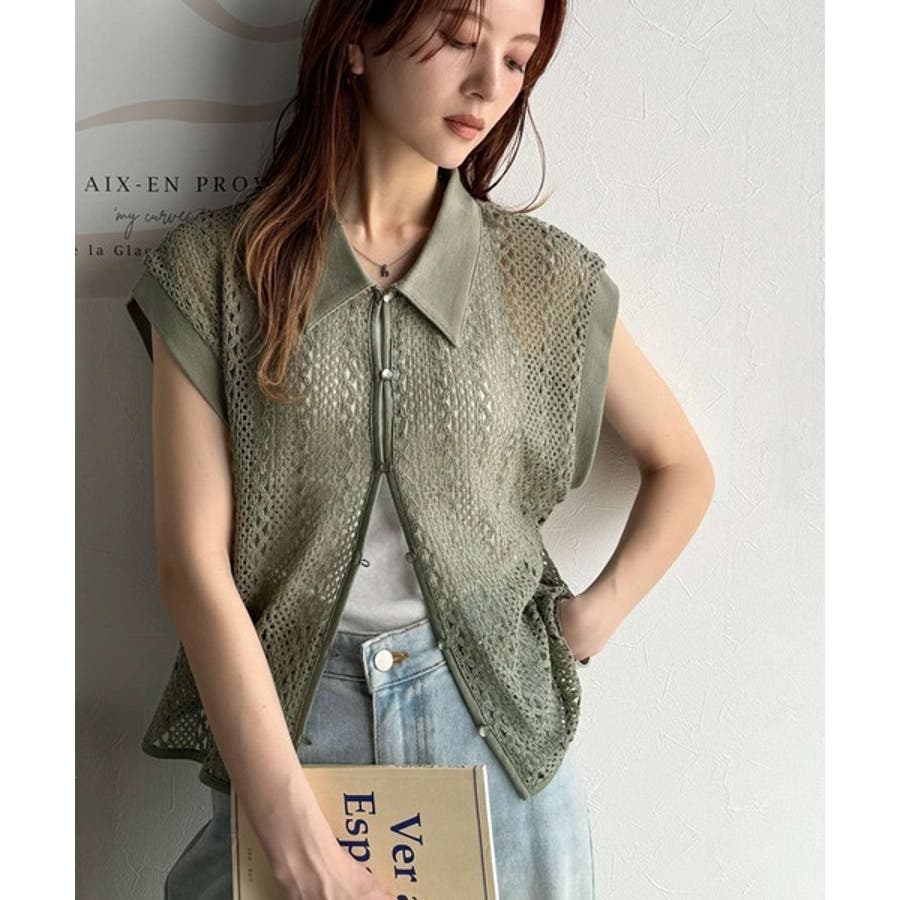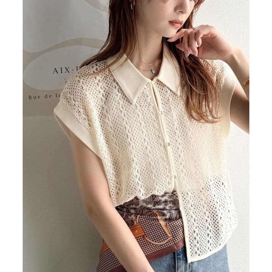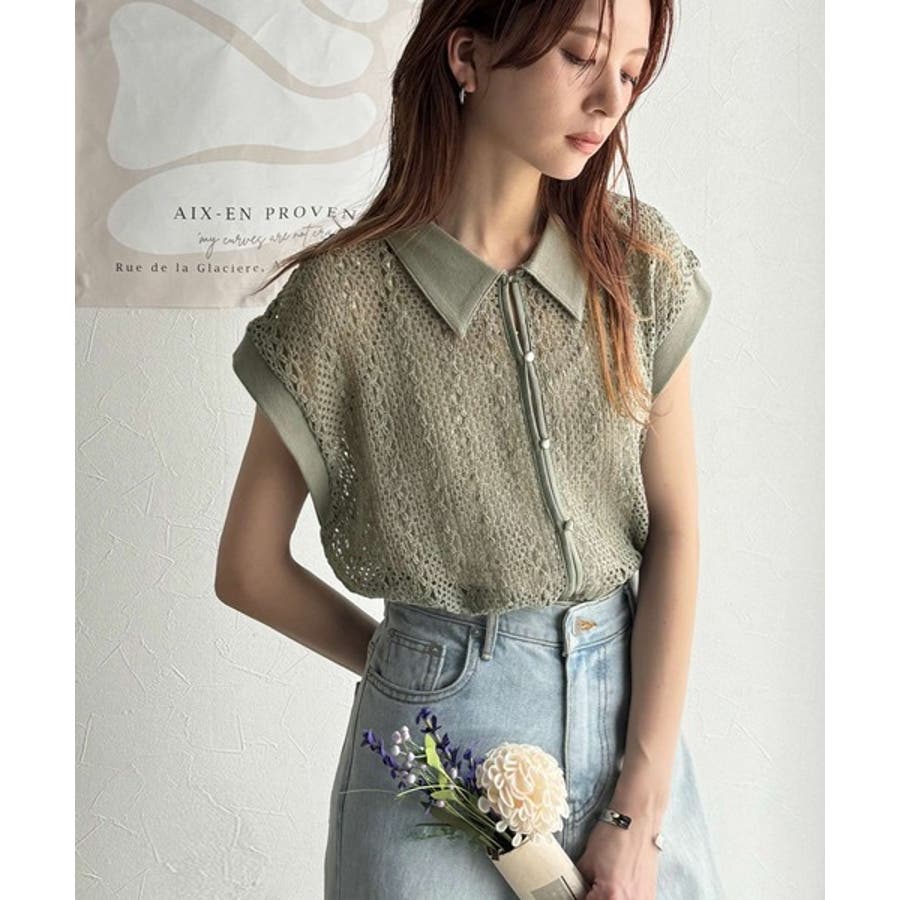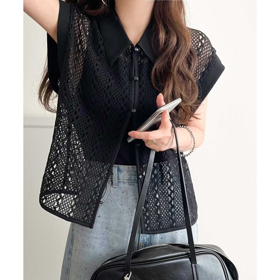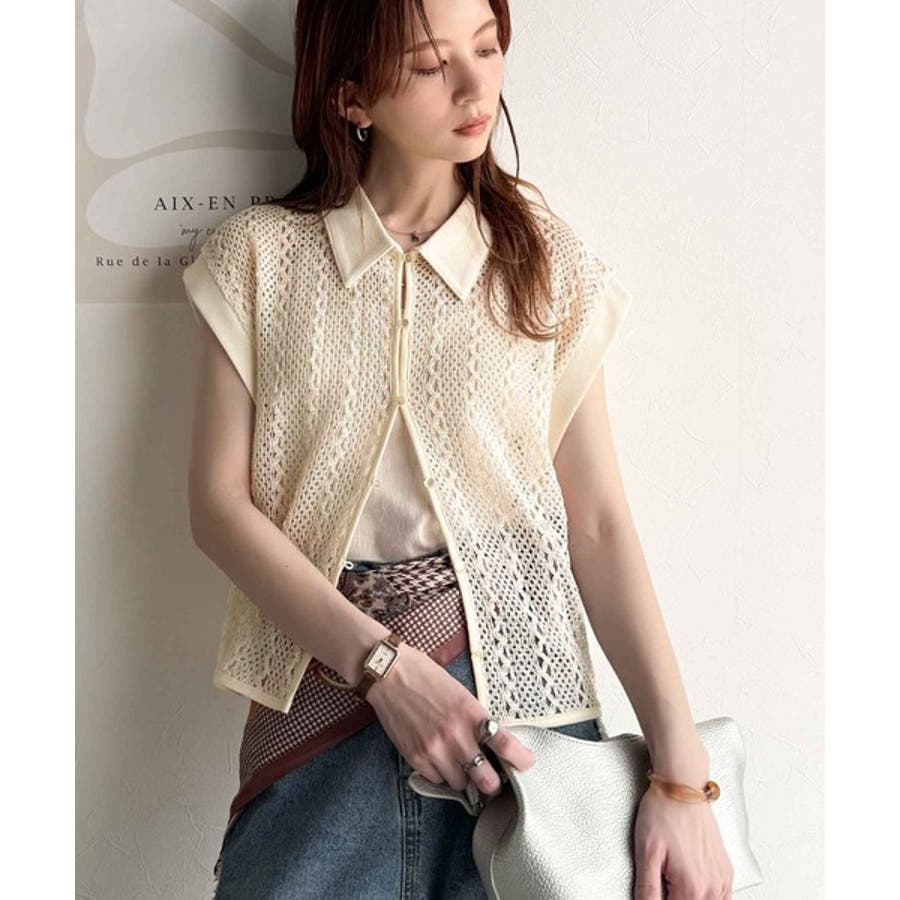 品の良さ漂う、大人カジュアル。クロシェ風レース素材衿付きフレンチスリーブシャツブ…