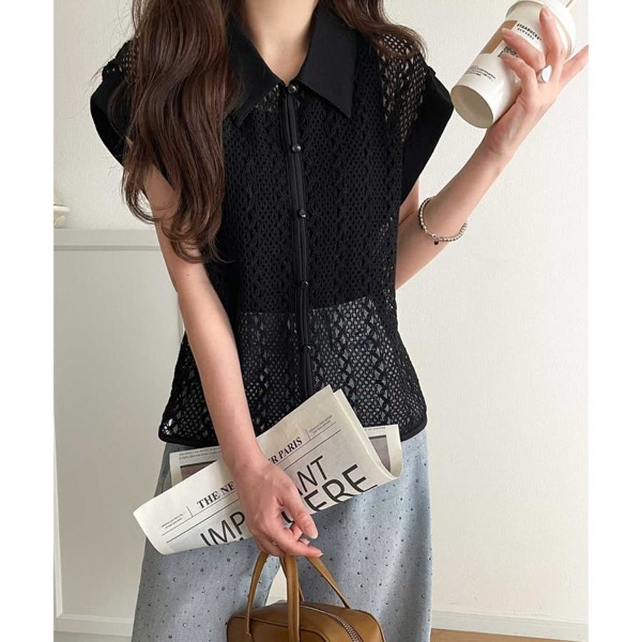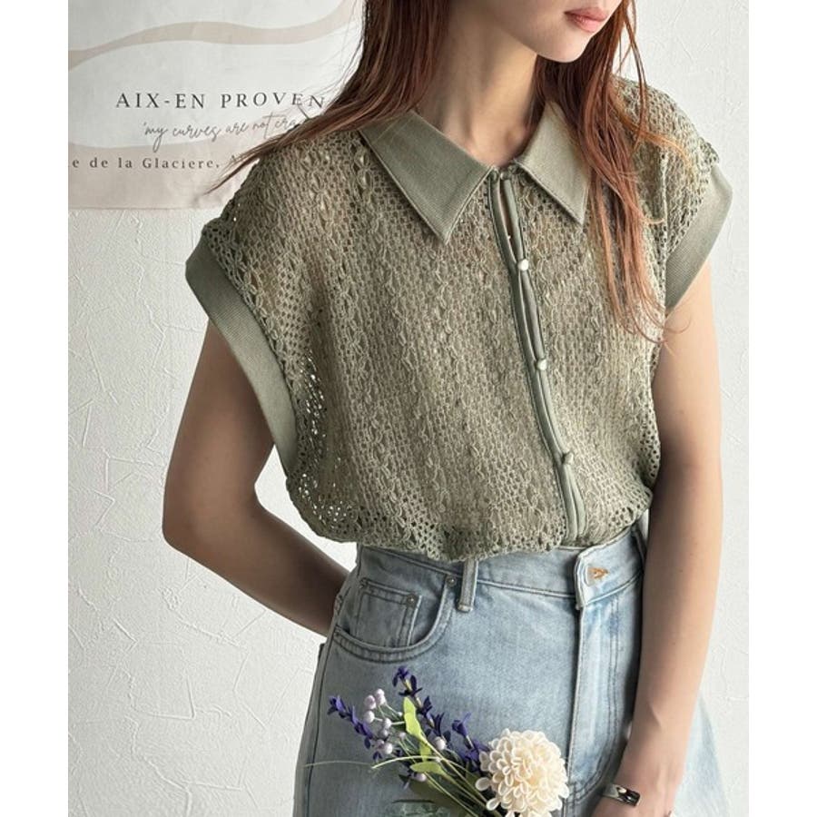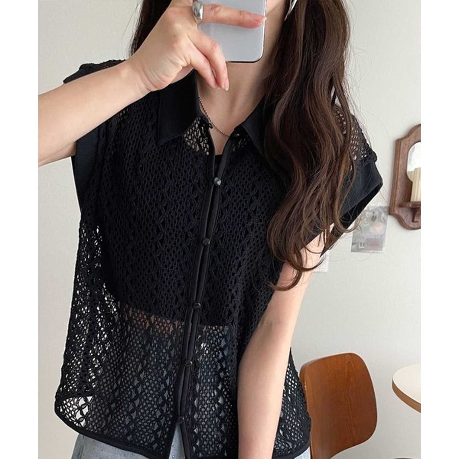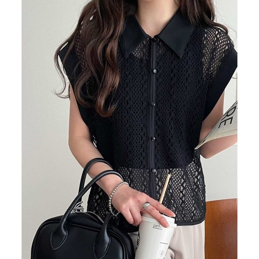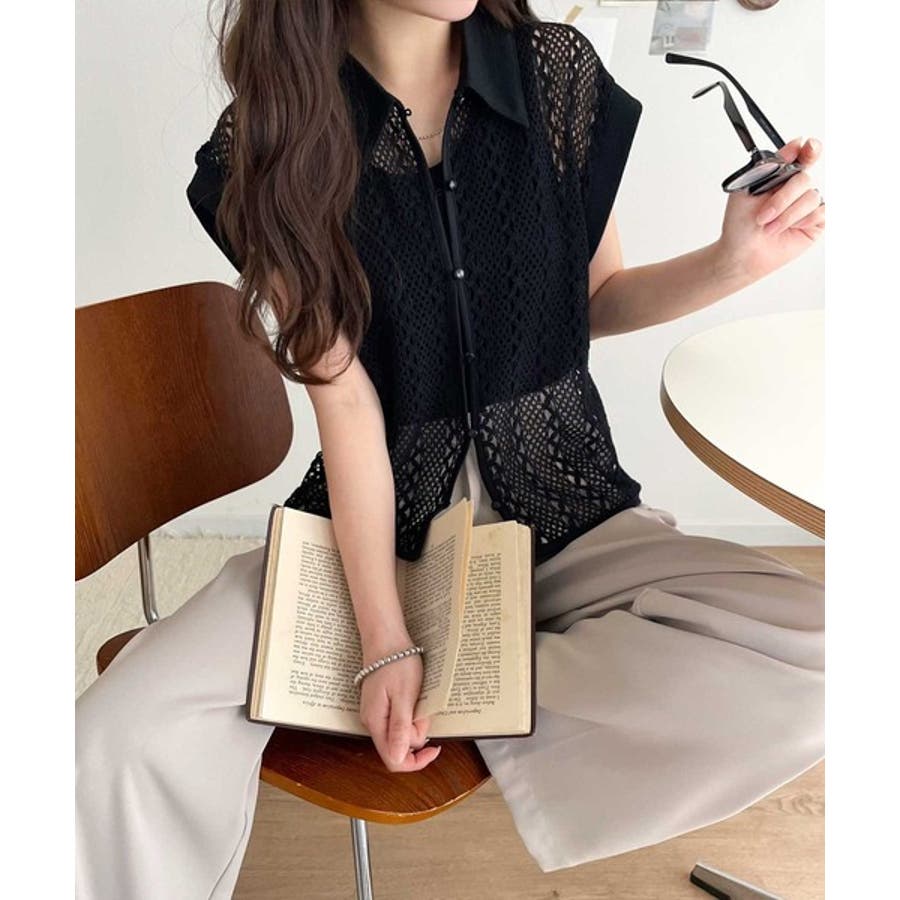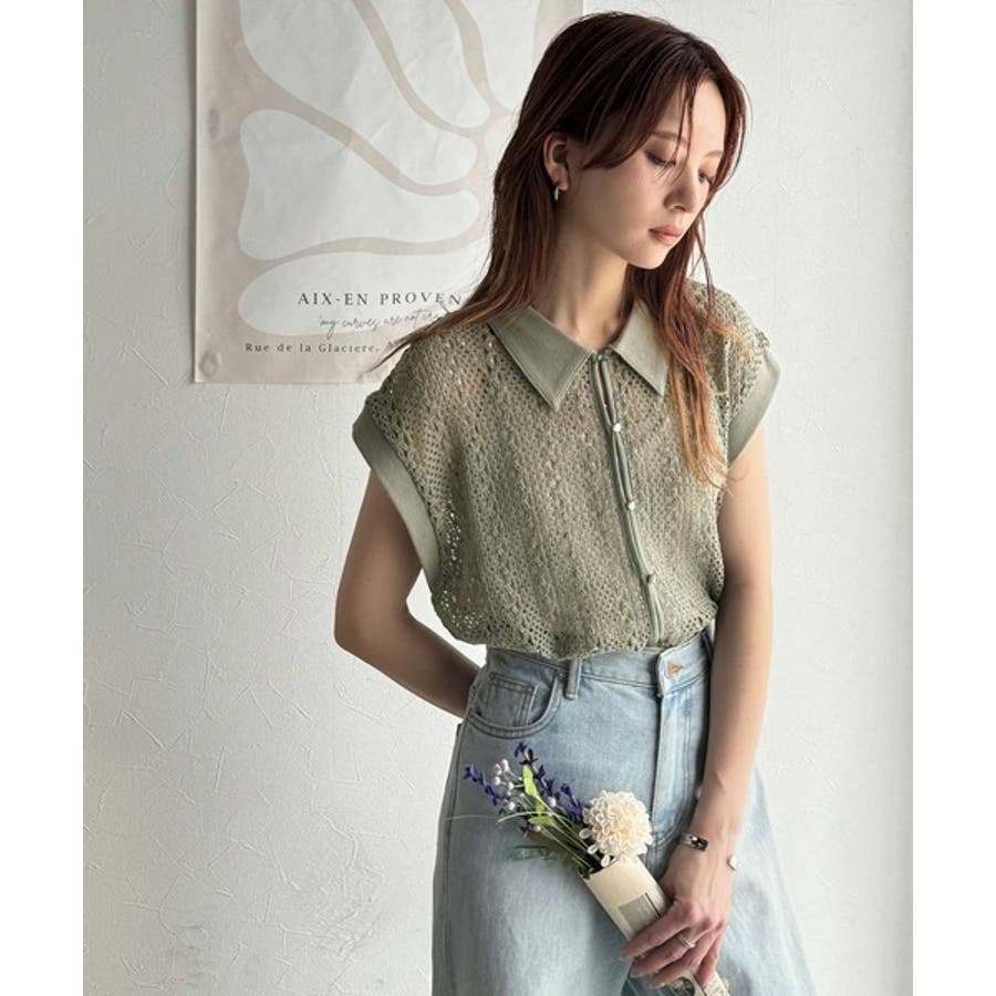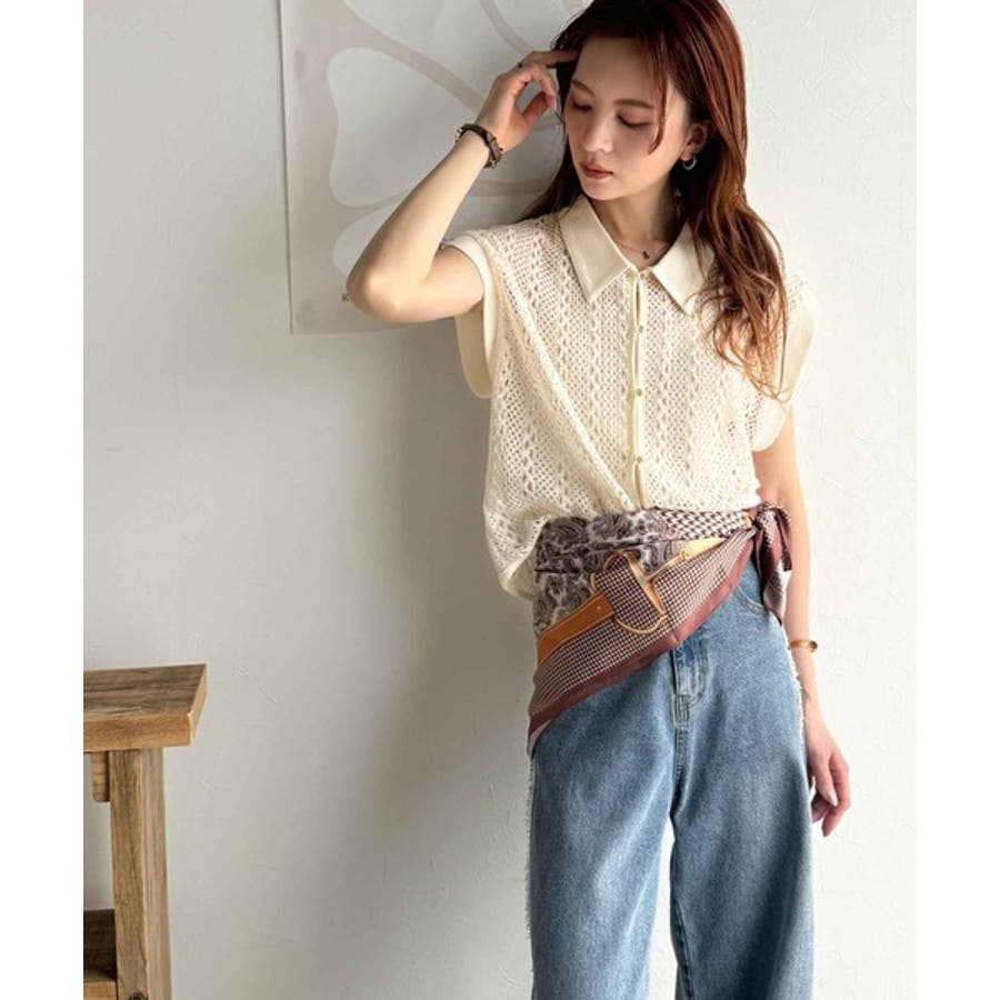 クロシェ風の柄レースがトレンド感のあるシャツブラウス。