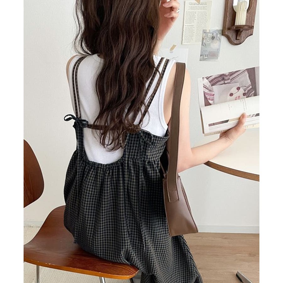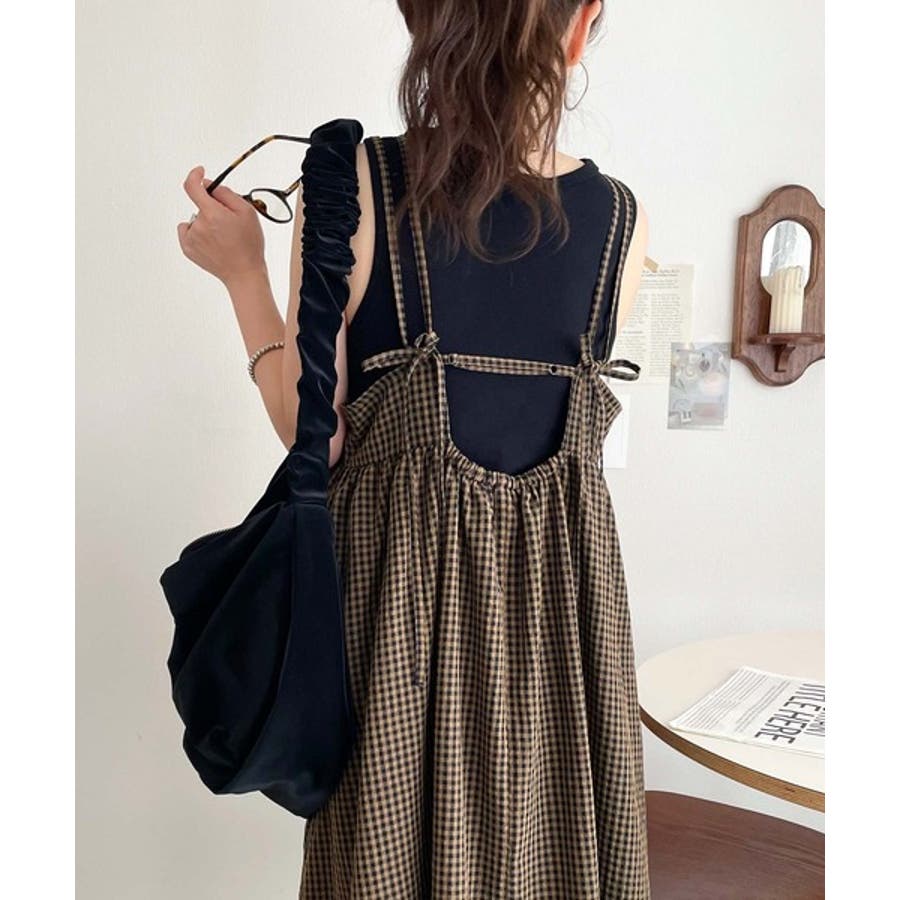 肩紐はダブルストラップ仕様で、後ろのリボンで長さ調節が可能。