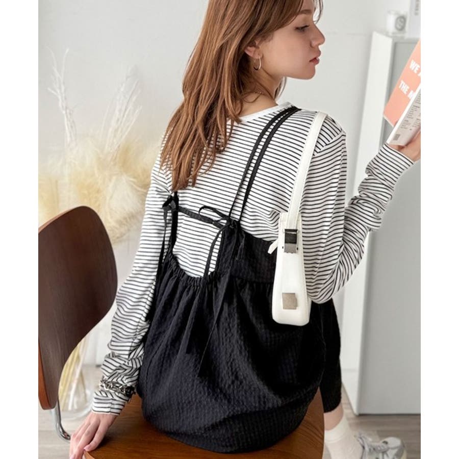 インナーには、シンプルなタンクトップやTシャツがおすすめ。