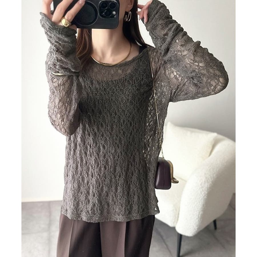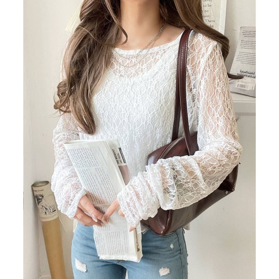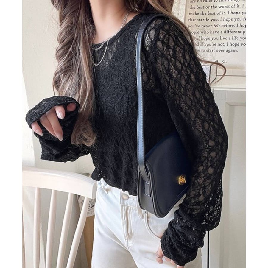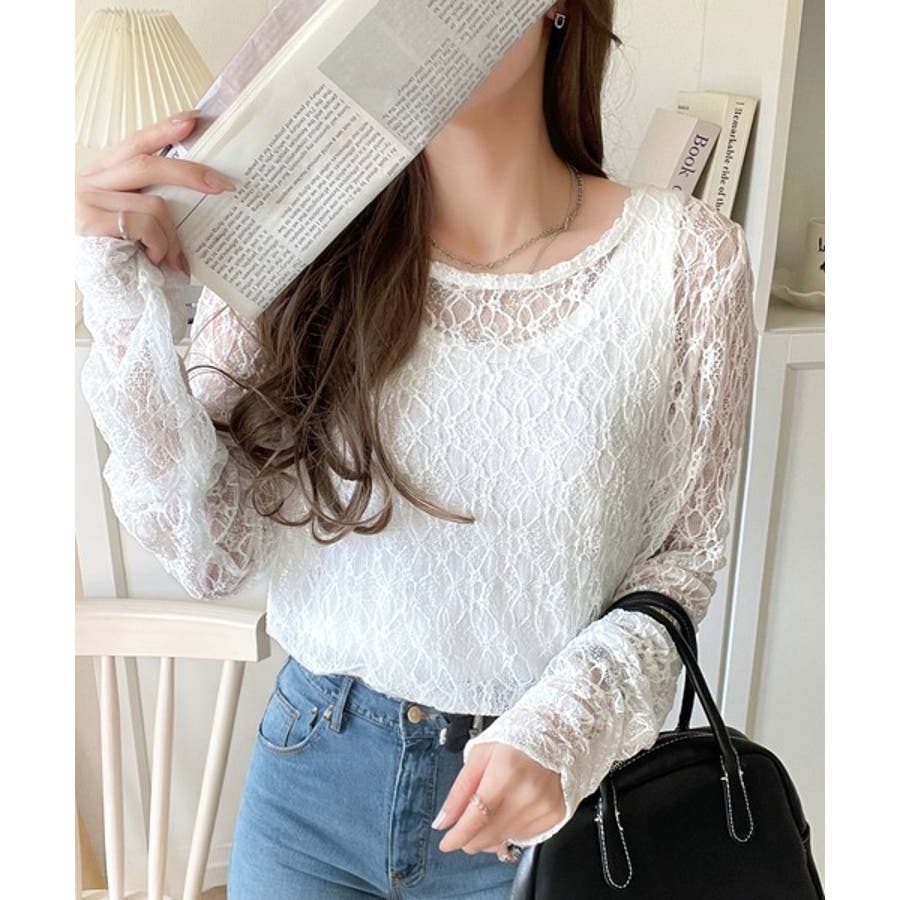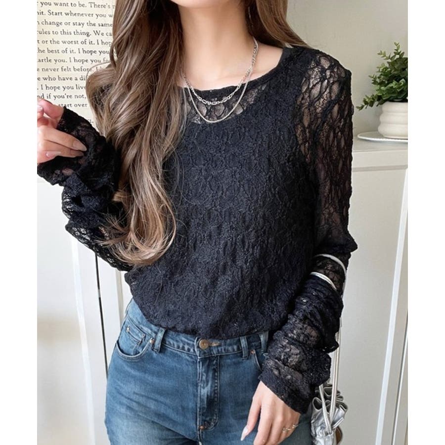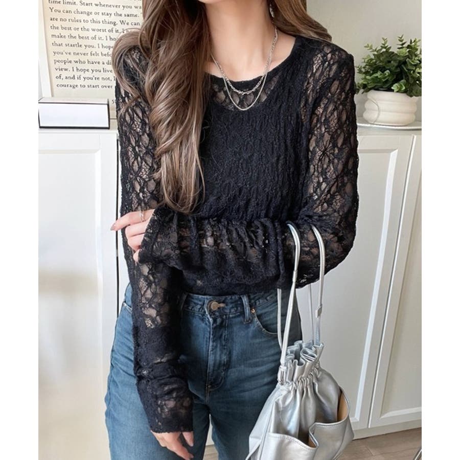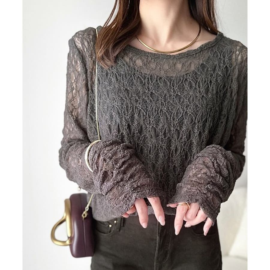 大人の上品映えレースアイテム。袖ギャザーレーストップス(長袖)