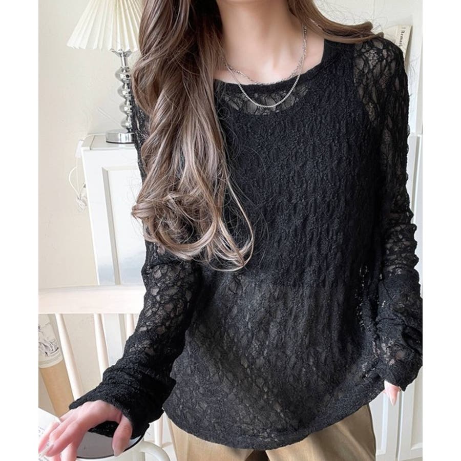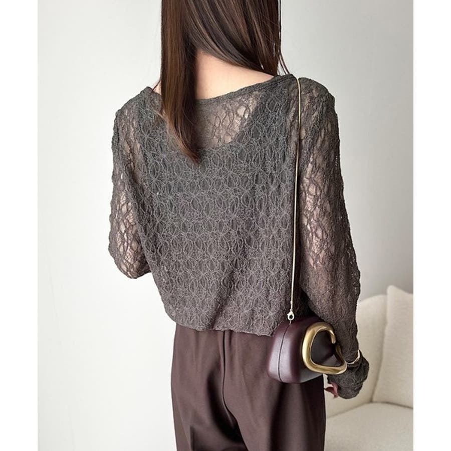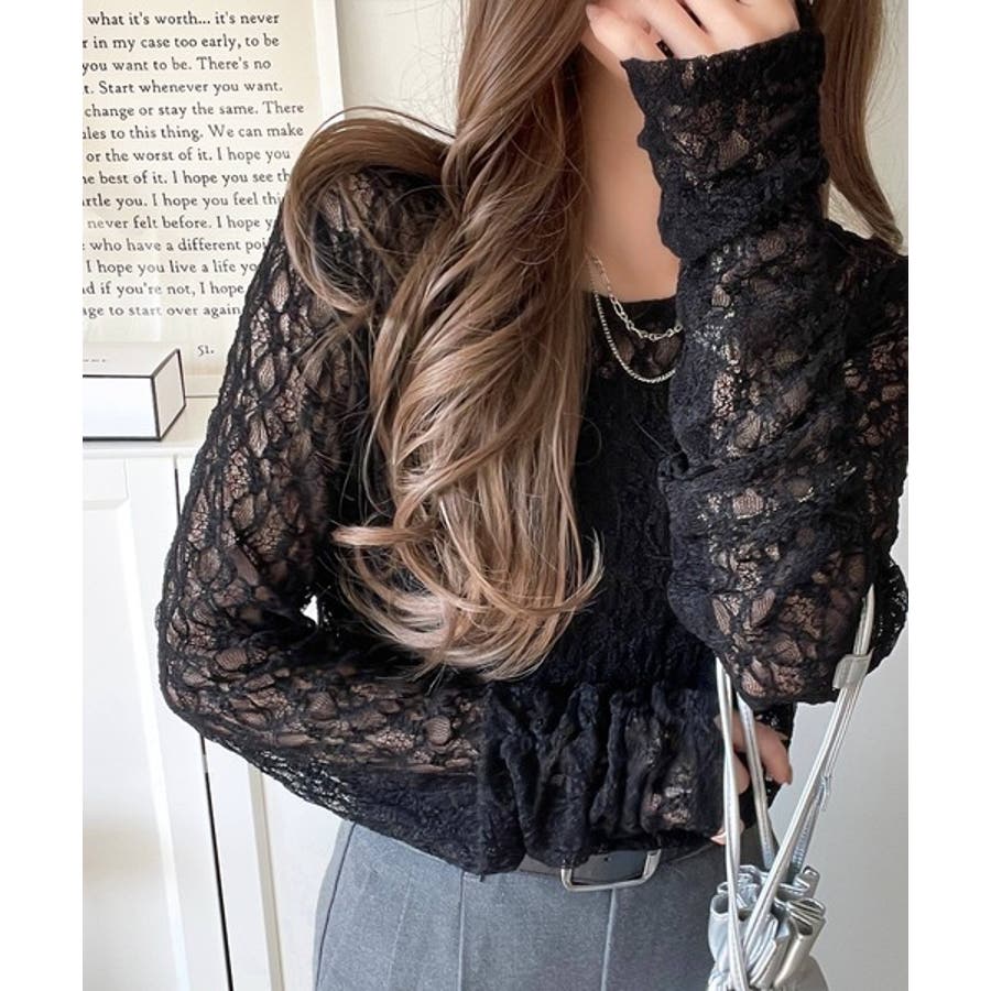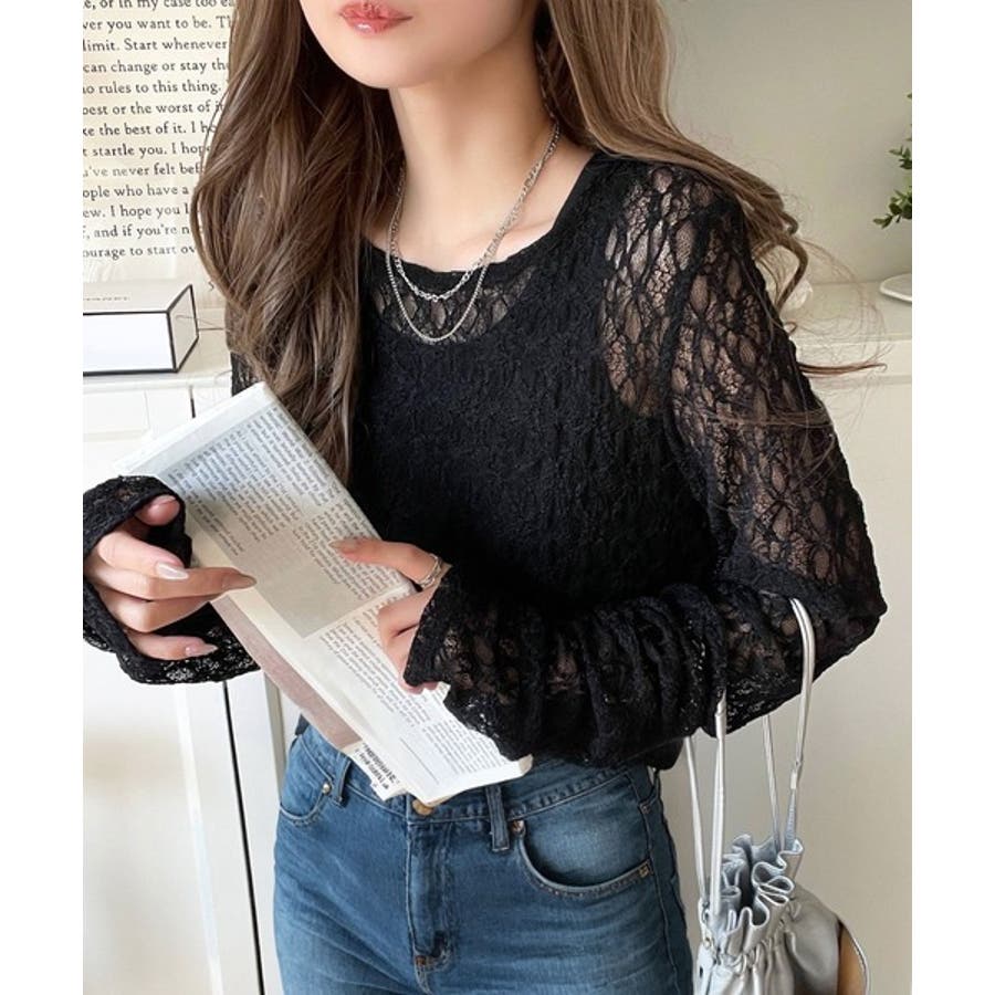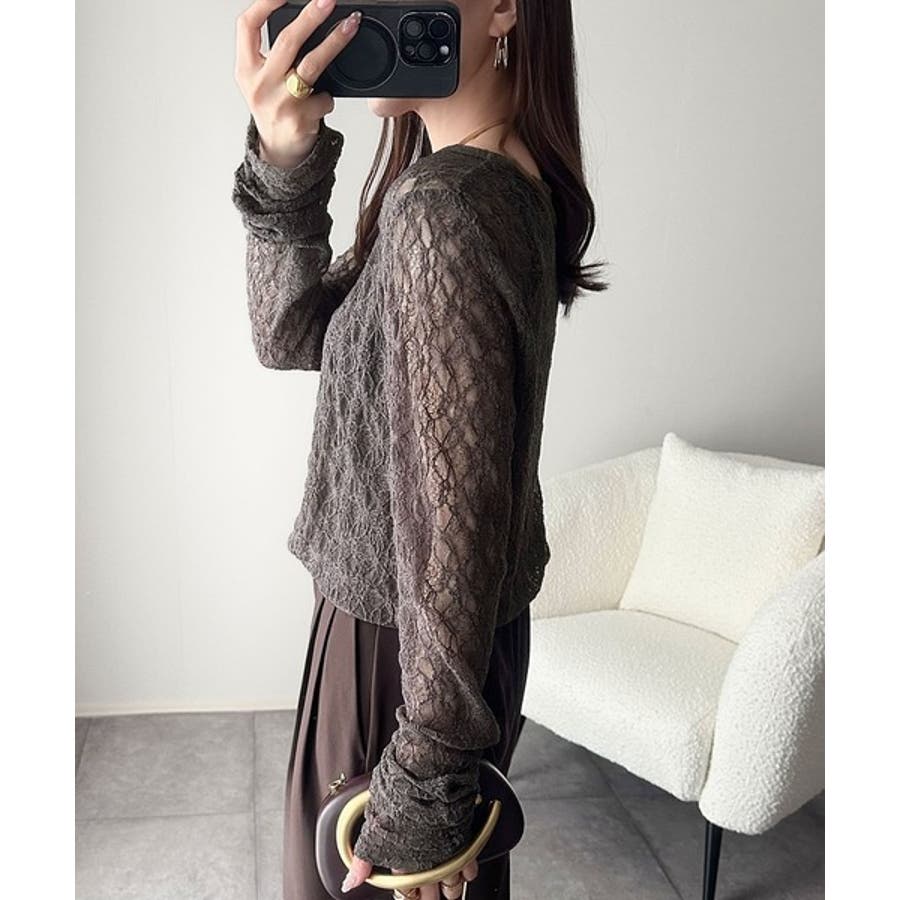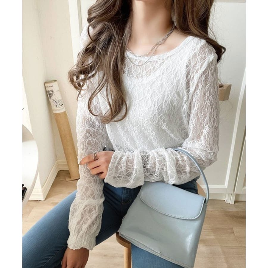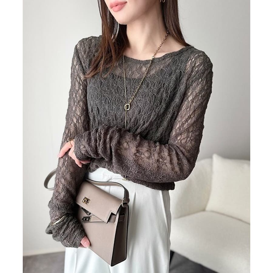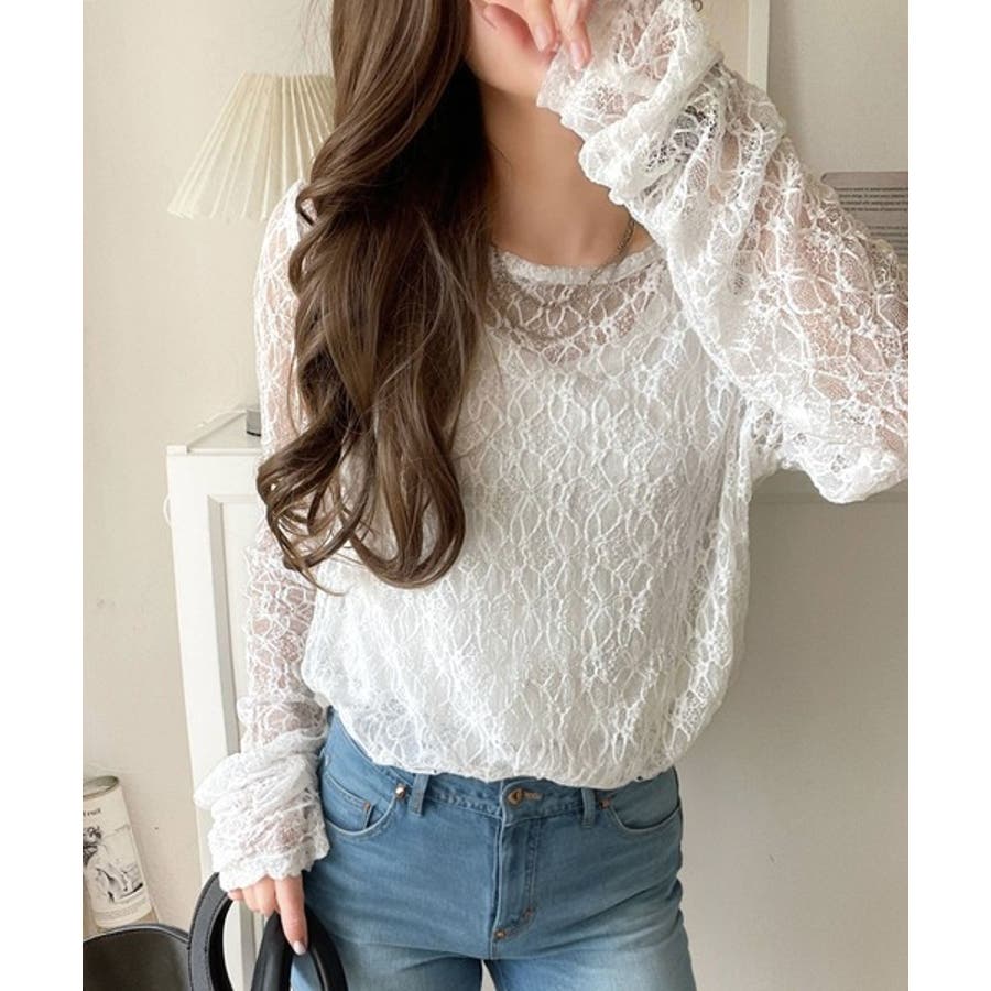 大人の上品映えレースアイテム。袖ギャザーレーストップス(長袖)