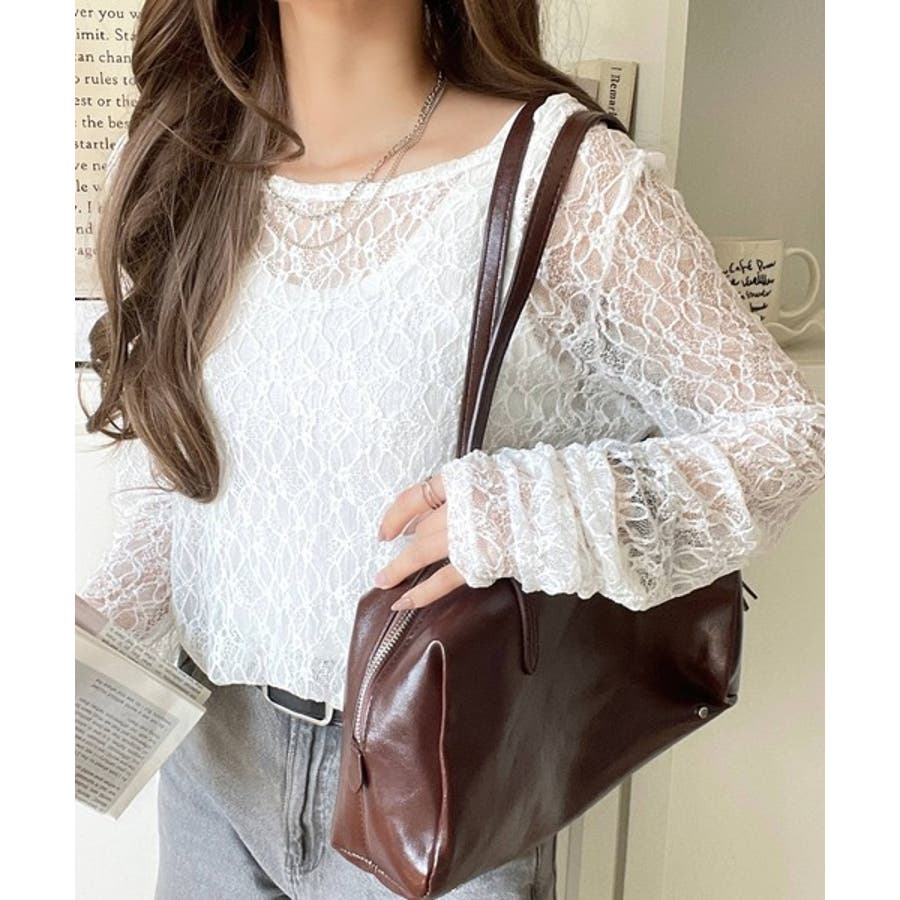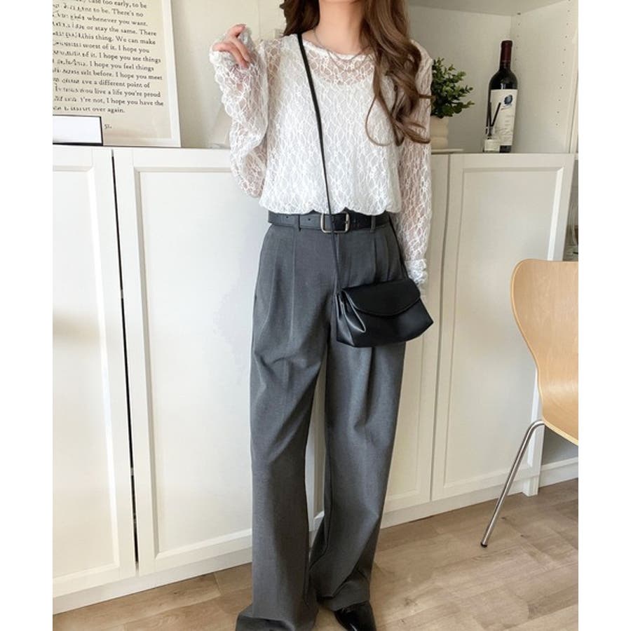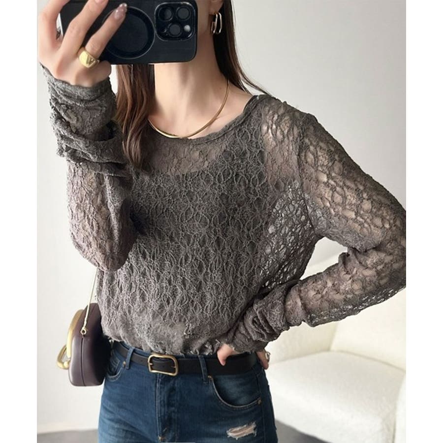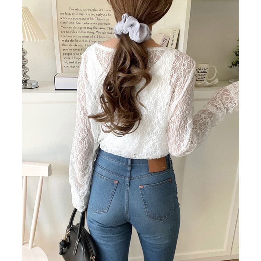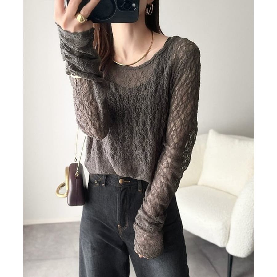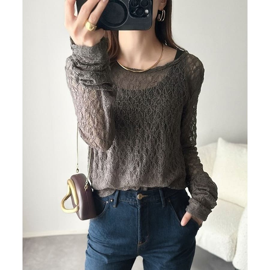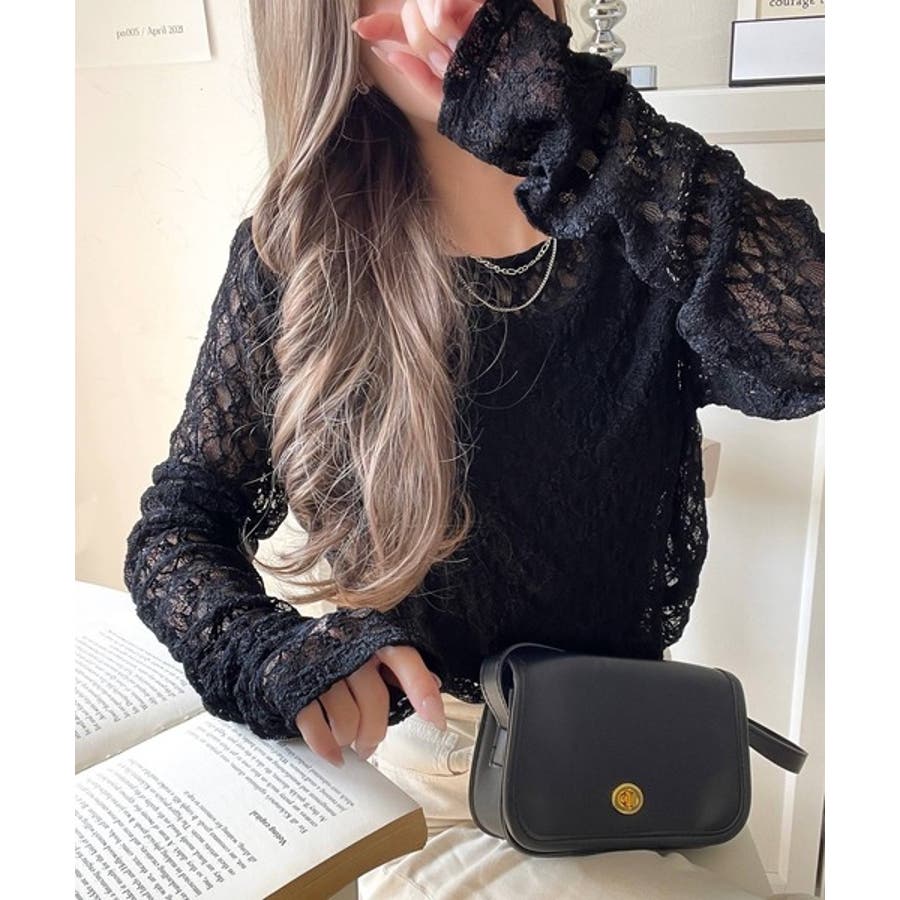 大人の上品映えレースアイテム。袖ギャザーレーストップス(長袖)