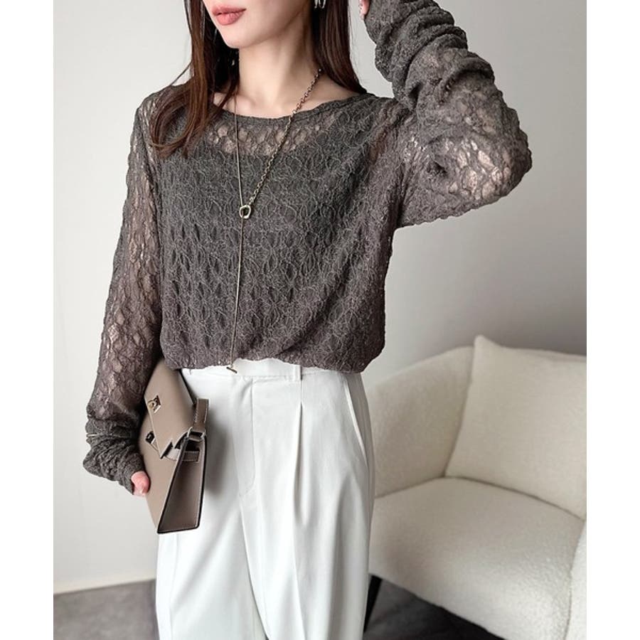 シアー感のあるレース素材を使用した袖ギャザートップス。