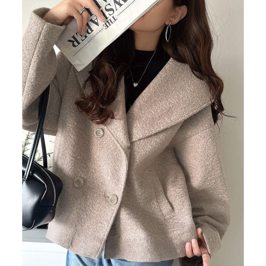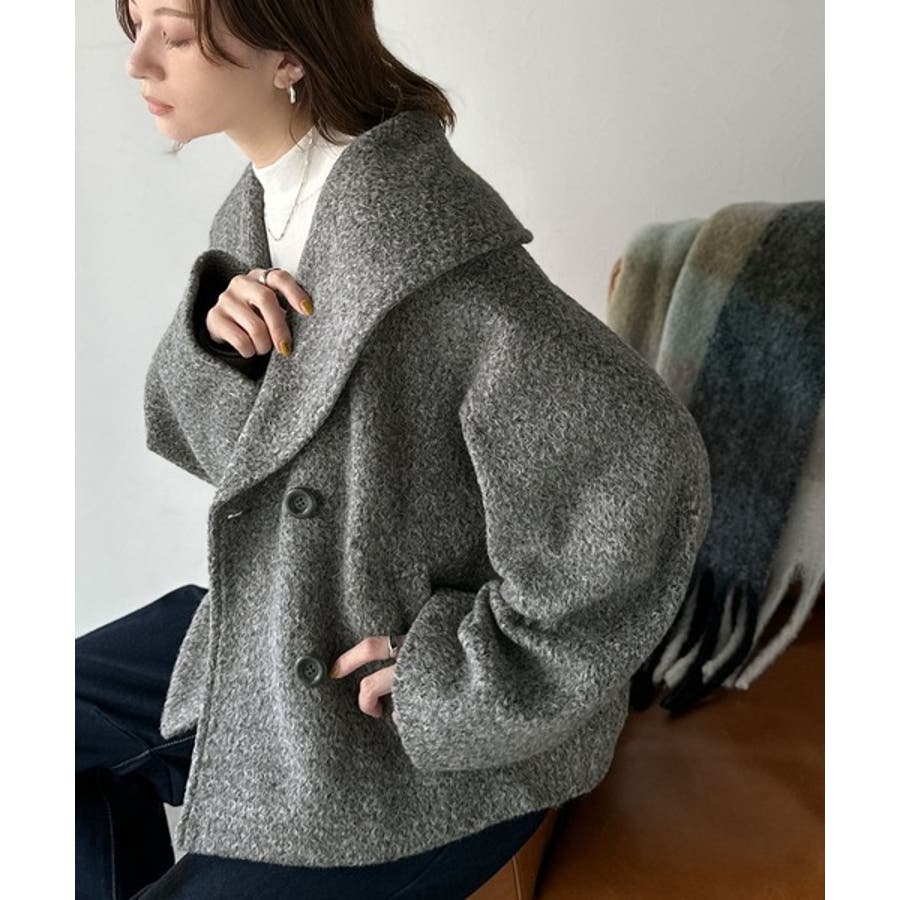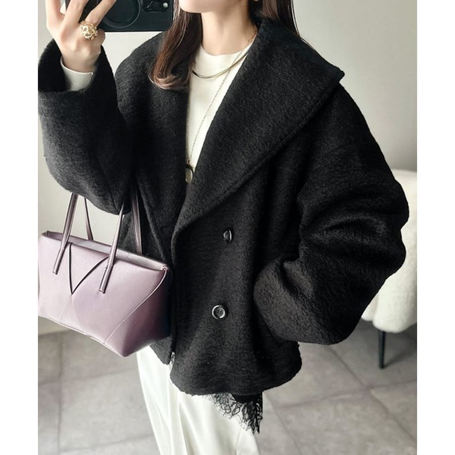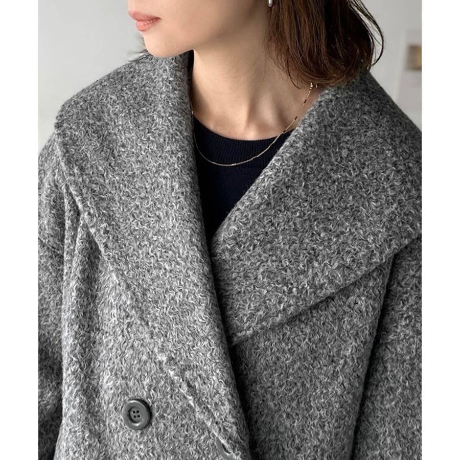 顔まわりをすっきりと見せてくれる、大きめの衿が印象的なダブルコート。立体的なビッグカラーが小顔効果を叶えながら、いつものスタイリングをぐっと上品に引き上げます。柔らかなフェイクウール素材を使用し、軽さとあたたかさを両立。ボクシーなシルエットとヒップが隠れるミドル丈で、パンツにもスカートにもバランス良くマッチします。秋から冬、そして春先まで、ロングシーズン活躍する一着です。