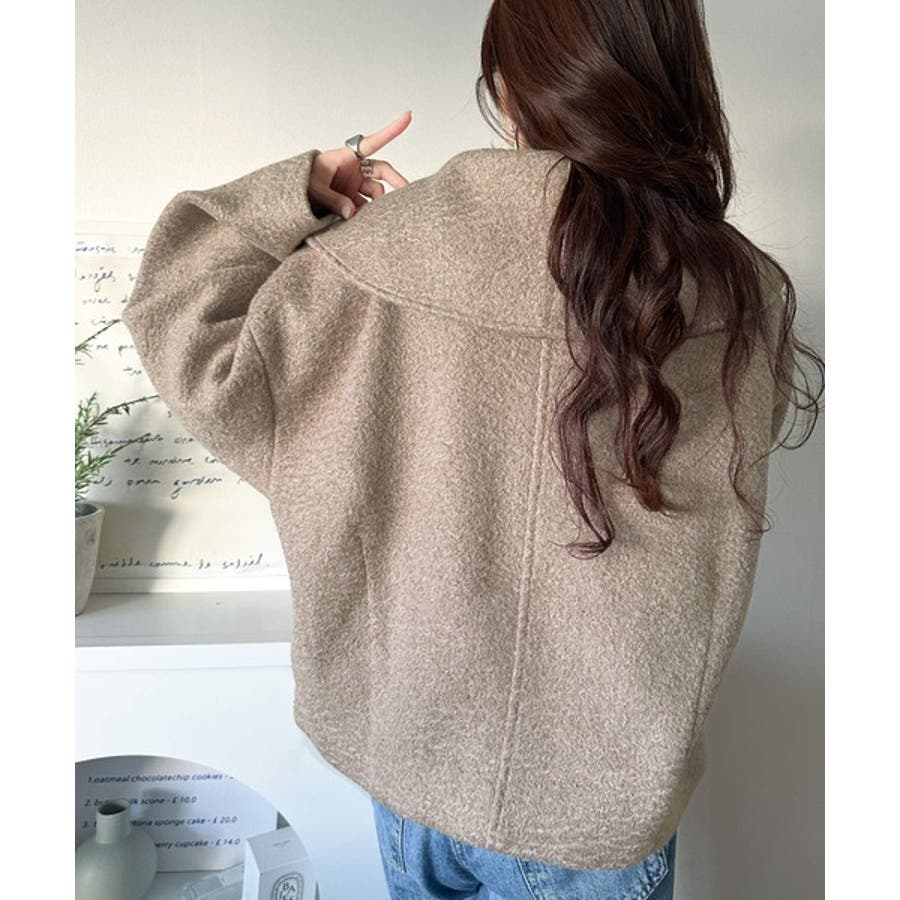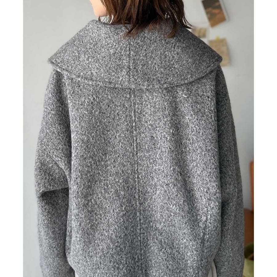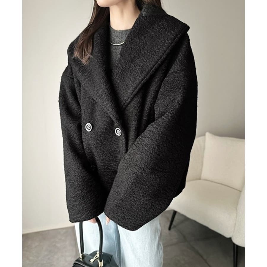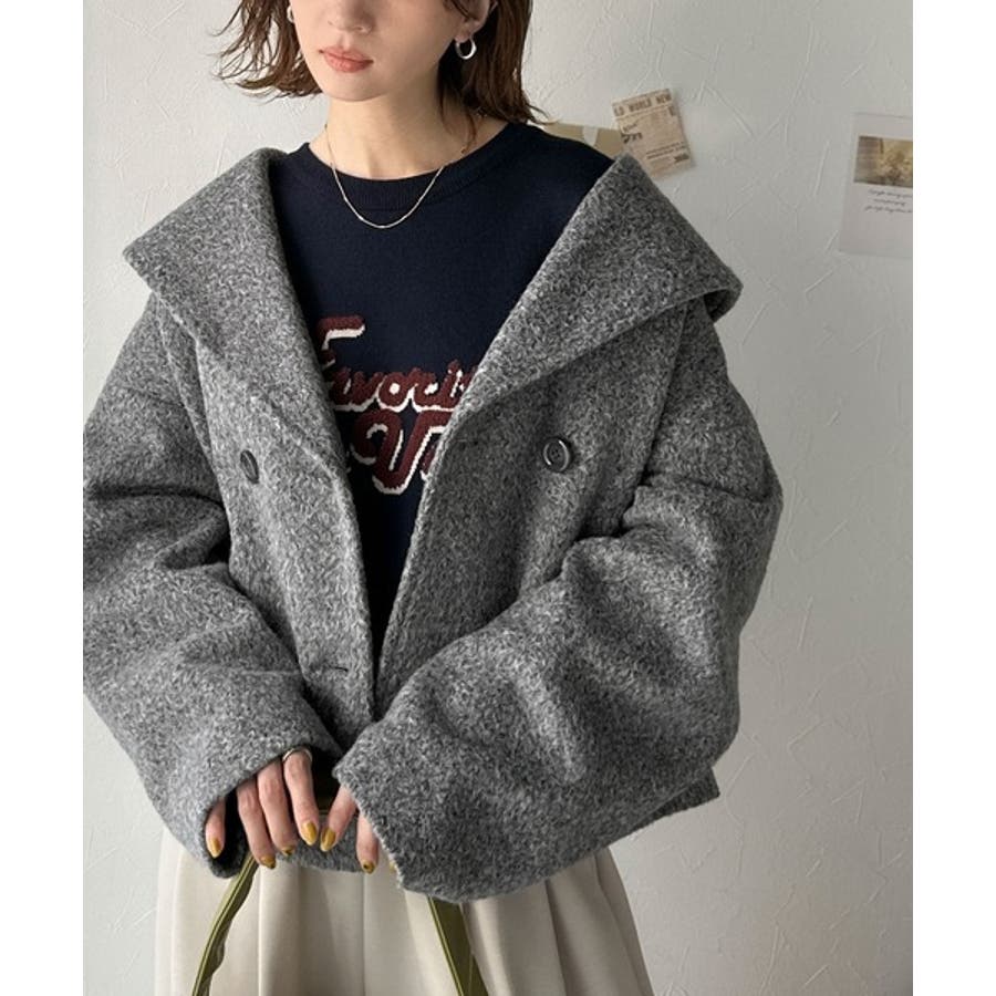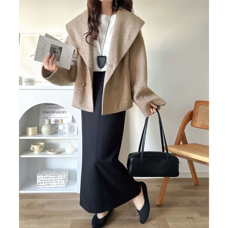 顔まわりをすっきりと見せてくれる、大きめの衿が印象的なダブルコート。立体的なビッグカラーが小顔効果を叶えながら、いつものスタイリングをぐっと上品に引き上げます。柔らかなフェイクウール素材を使用し、軽さとあたたかさを両立。ボクシーなシルエットとヒップが隠れるミドル丈で、パンツにもスカートにもバランス良くマッチします。秋から冬、そして春先まで、ロングシーズン活躍する一着です。