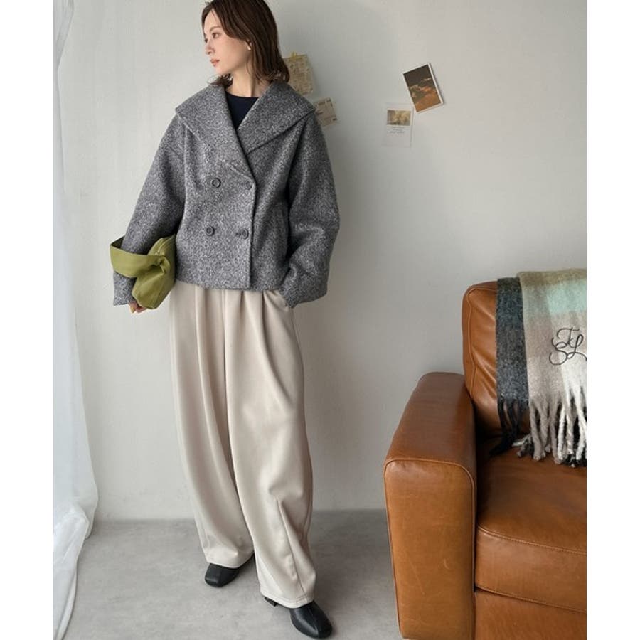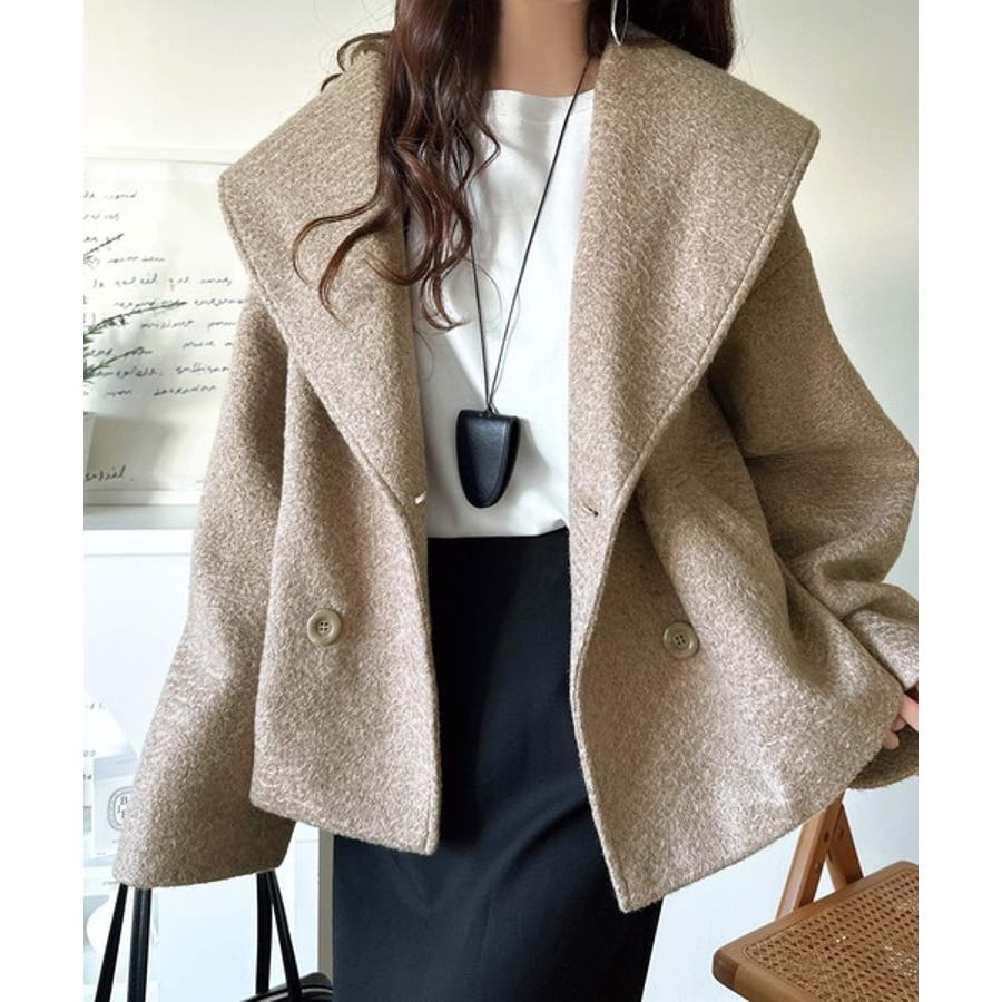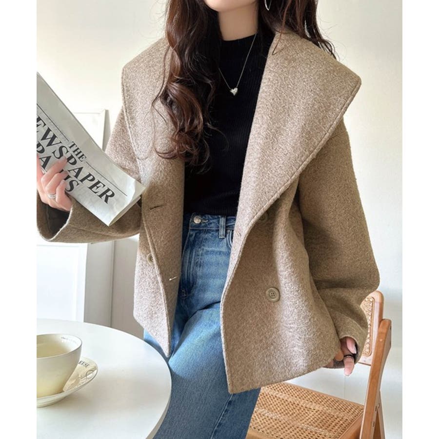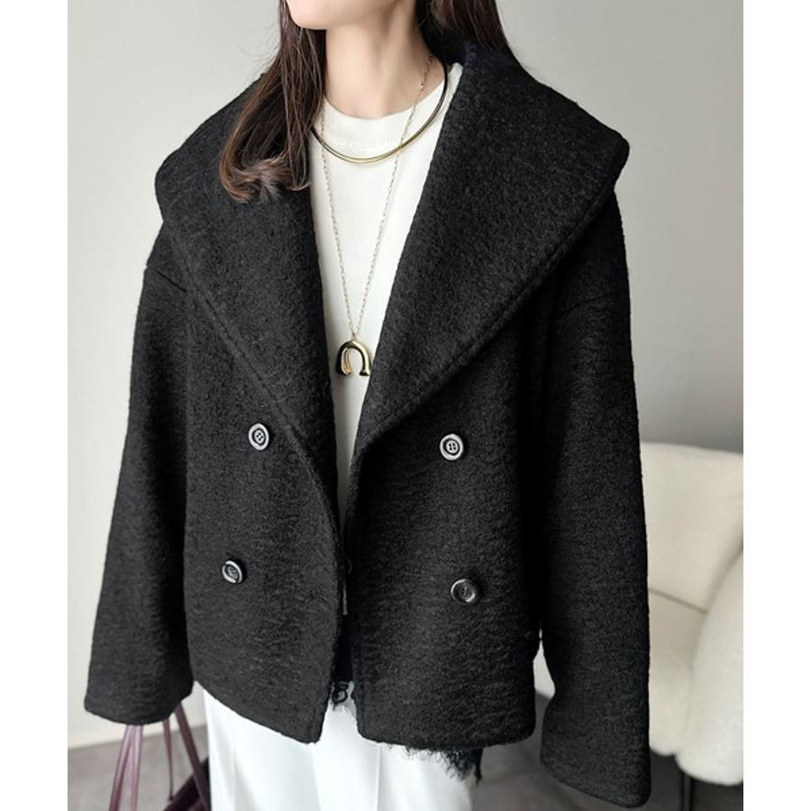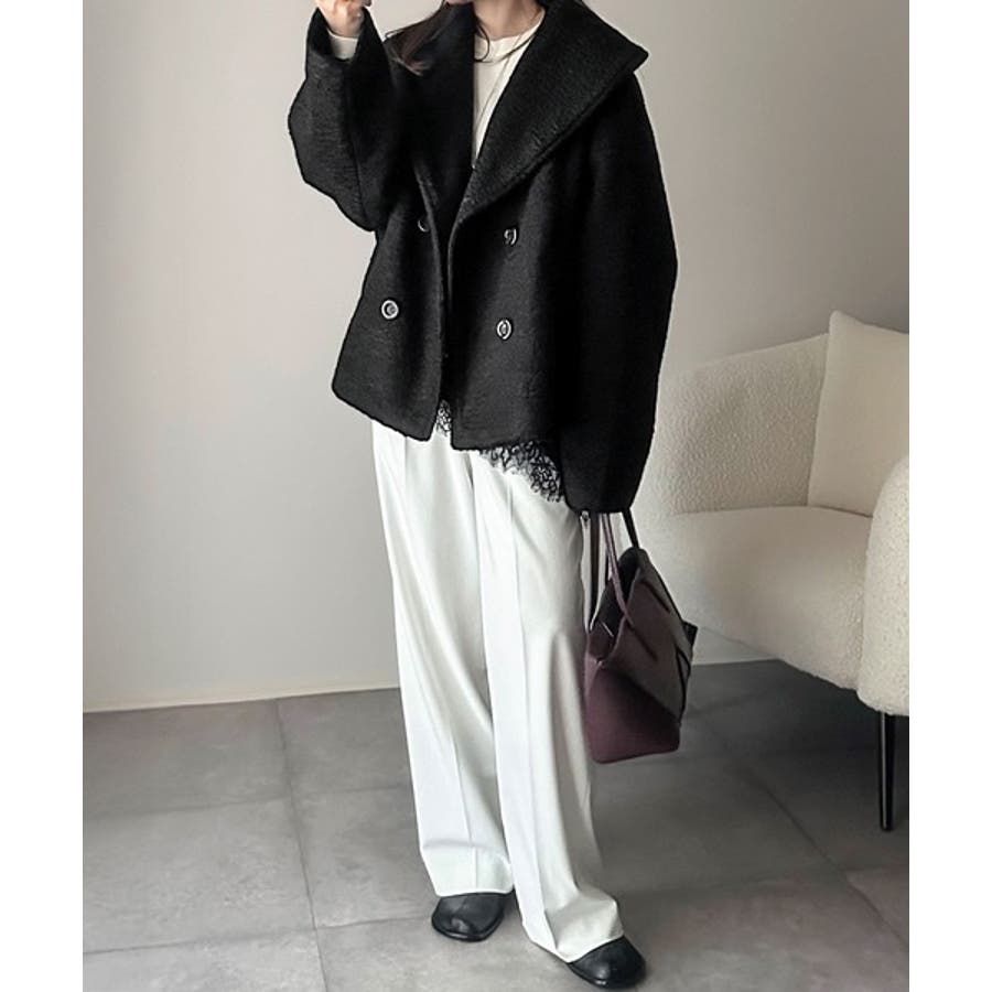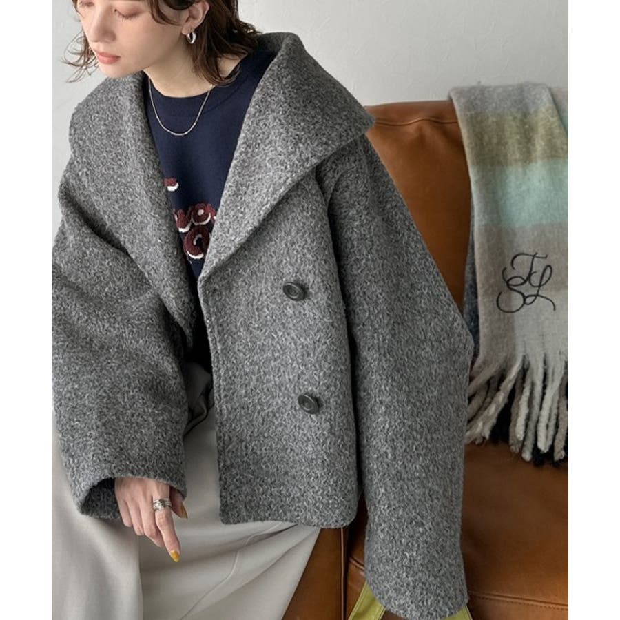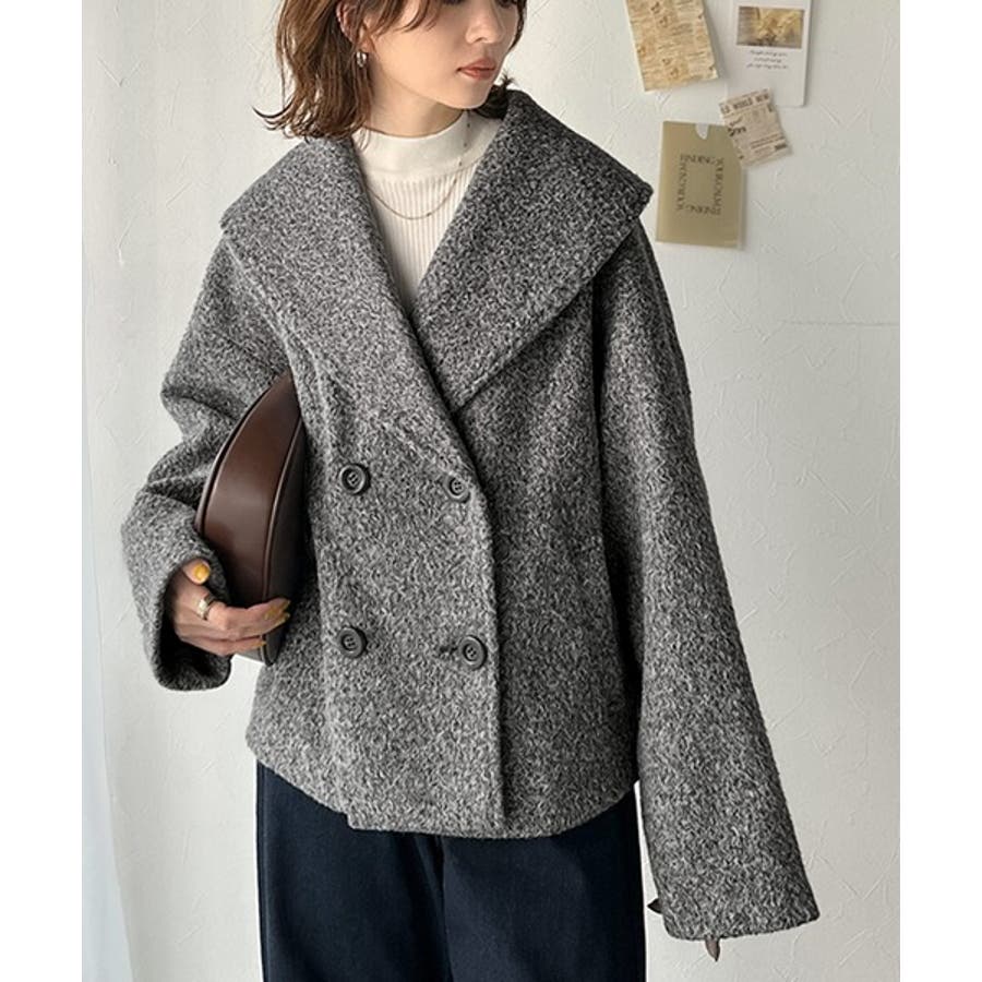 存在感のあるビッグカラーがポイントのダブルブレストコート。