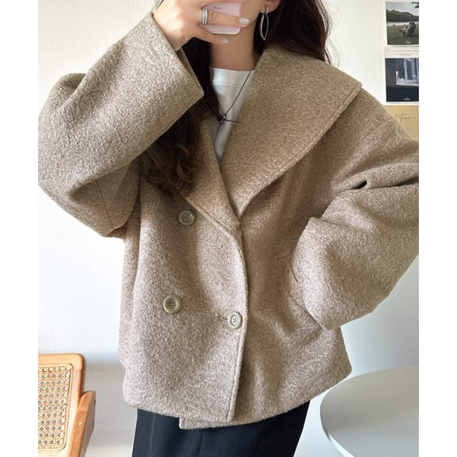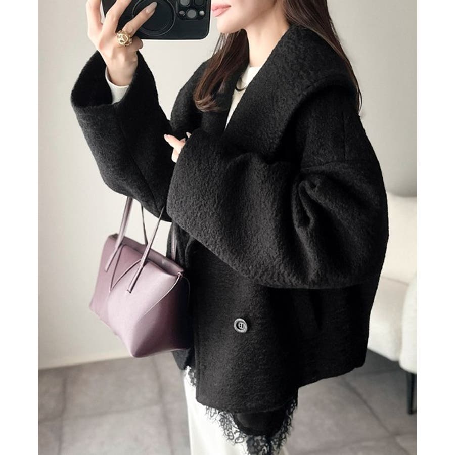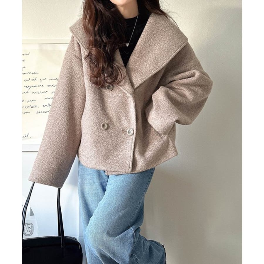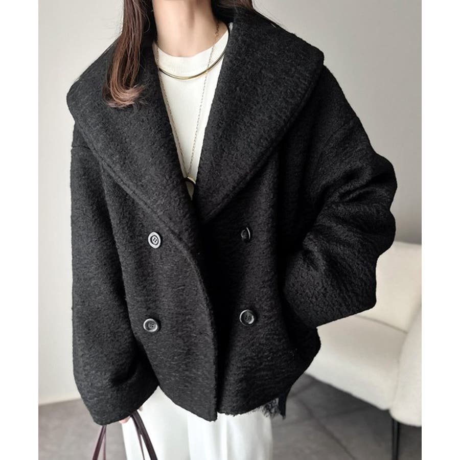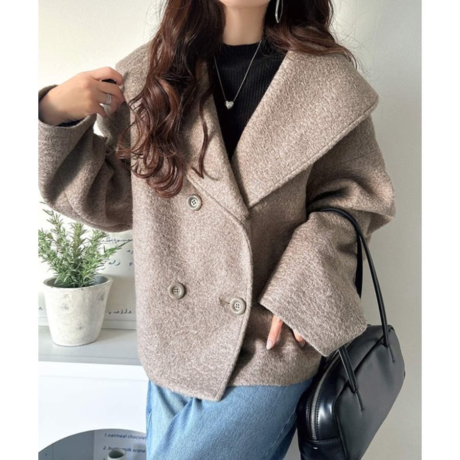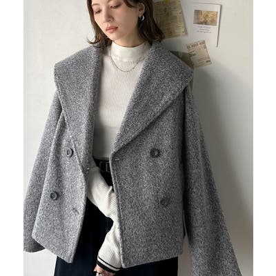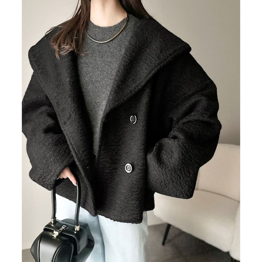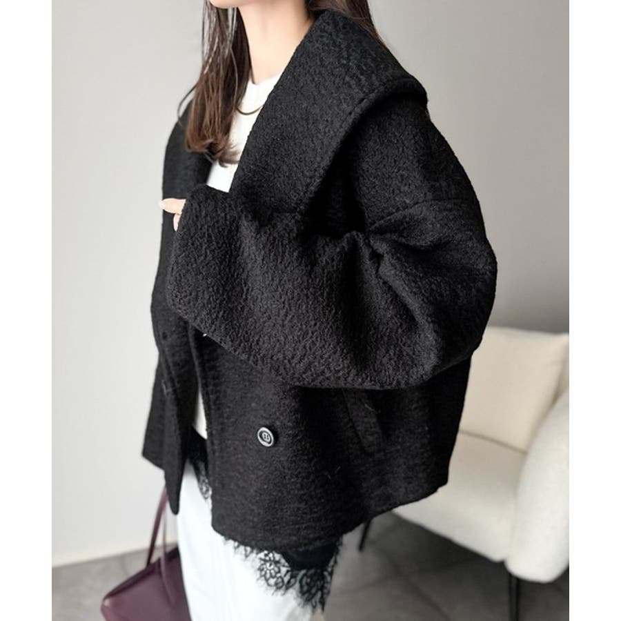 存在感のあるビッグカラーがポイントのダブルブレストコート。
