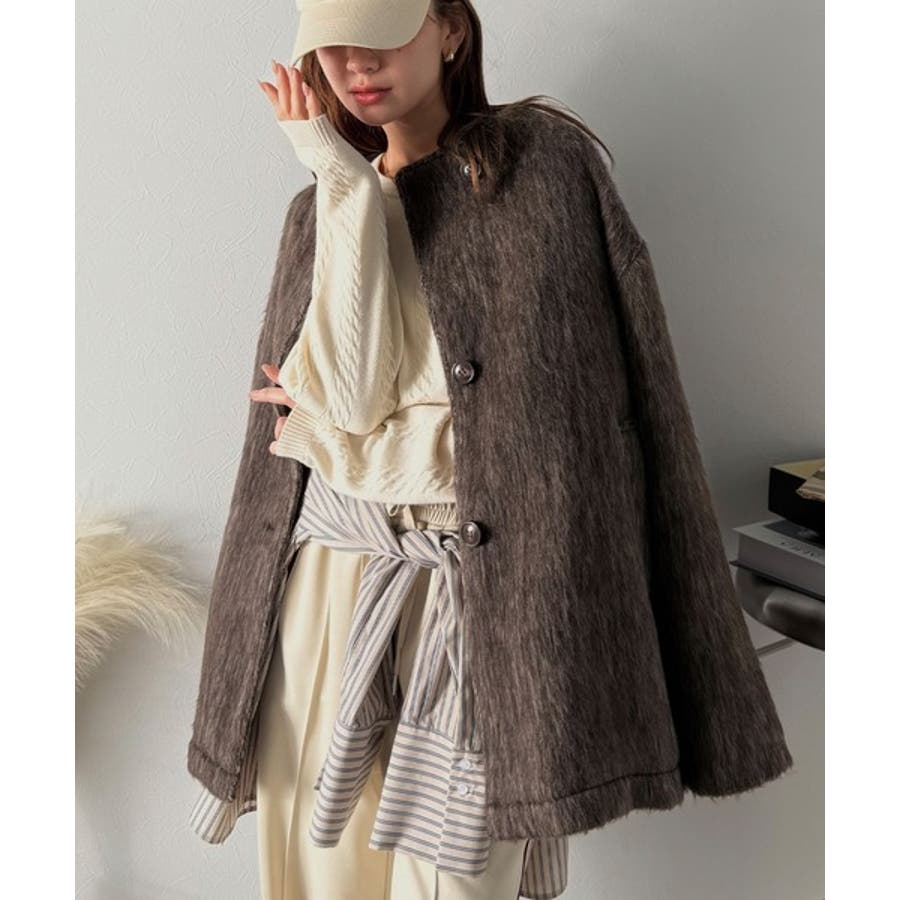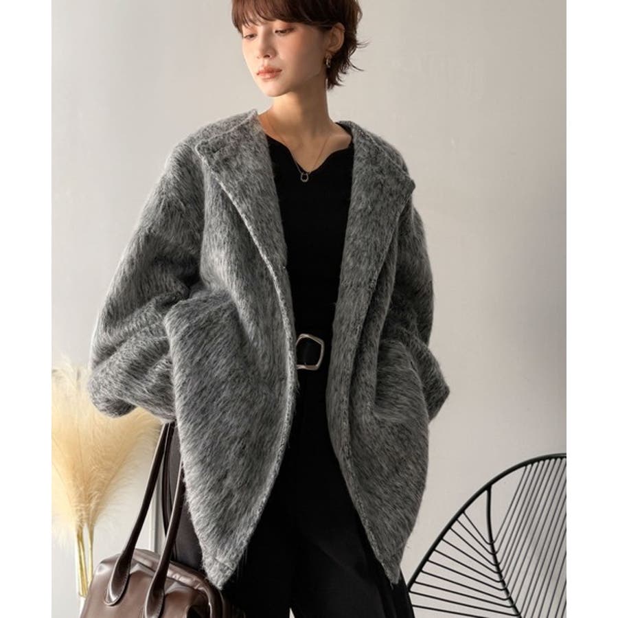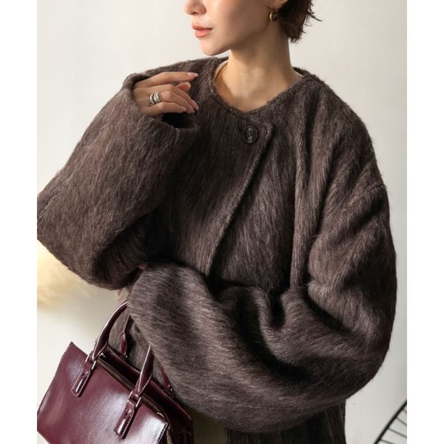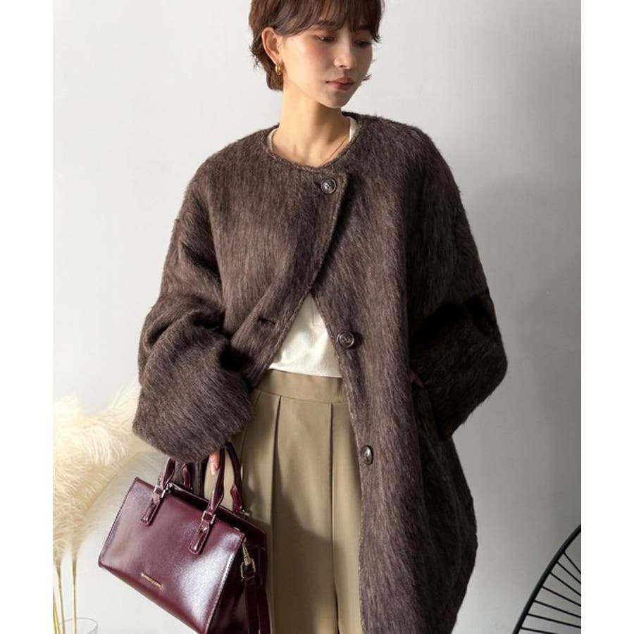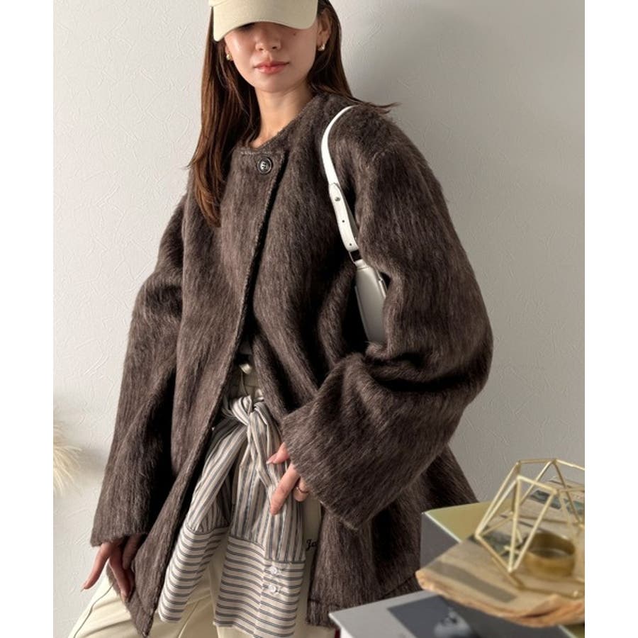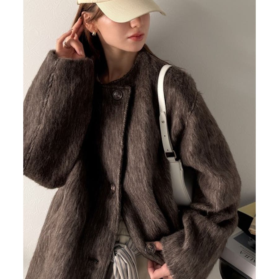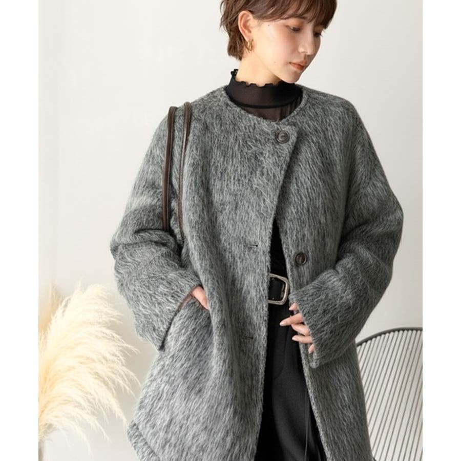 ふんわりとした印象と毛足の流れが美しい、ミックスシャギー素材のノーカラーコート。