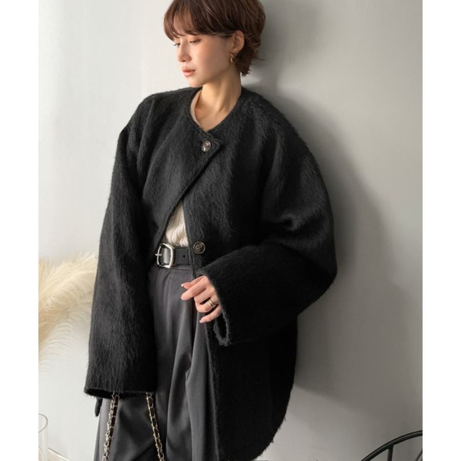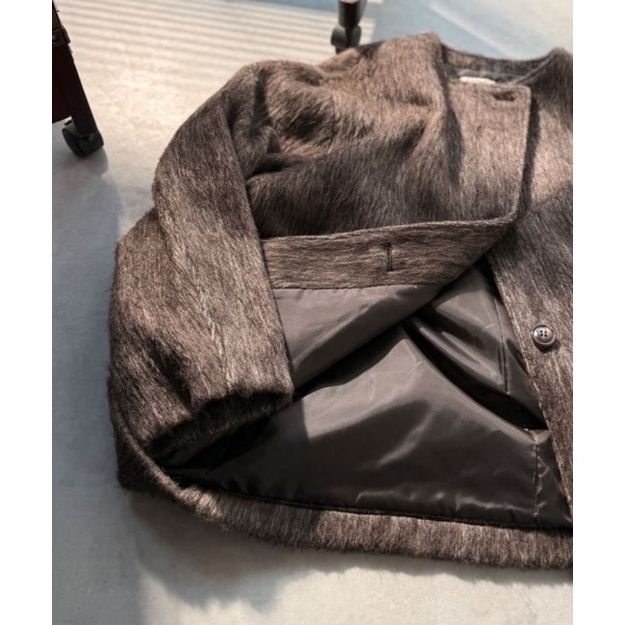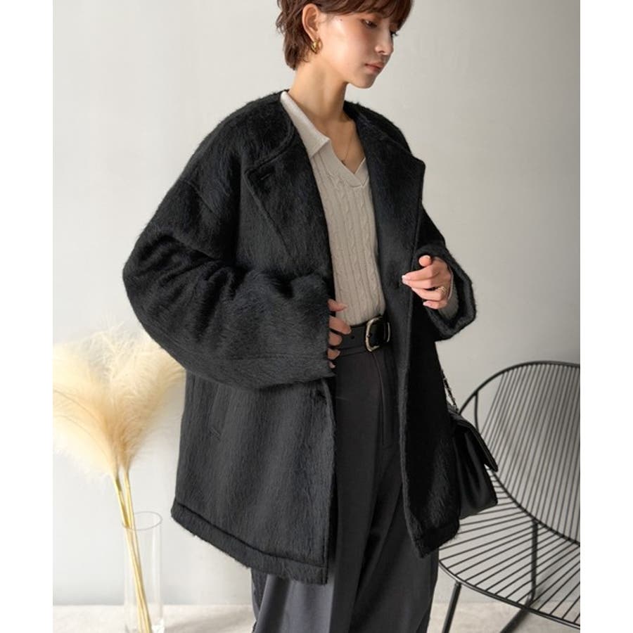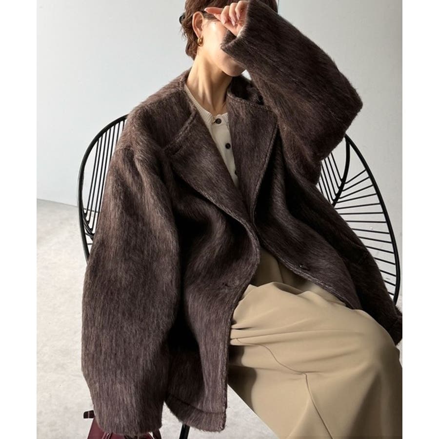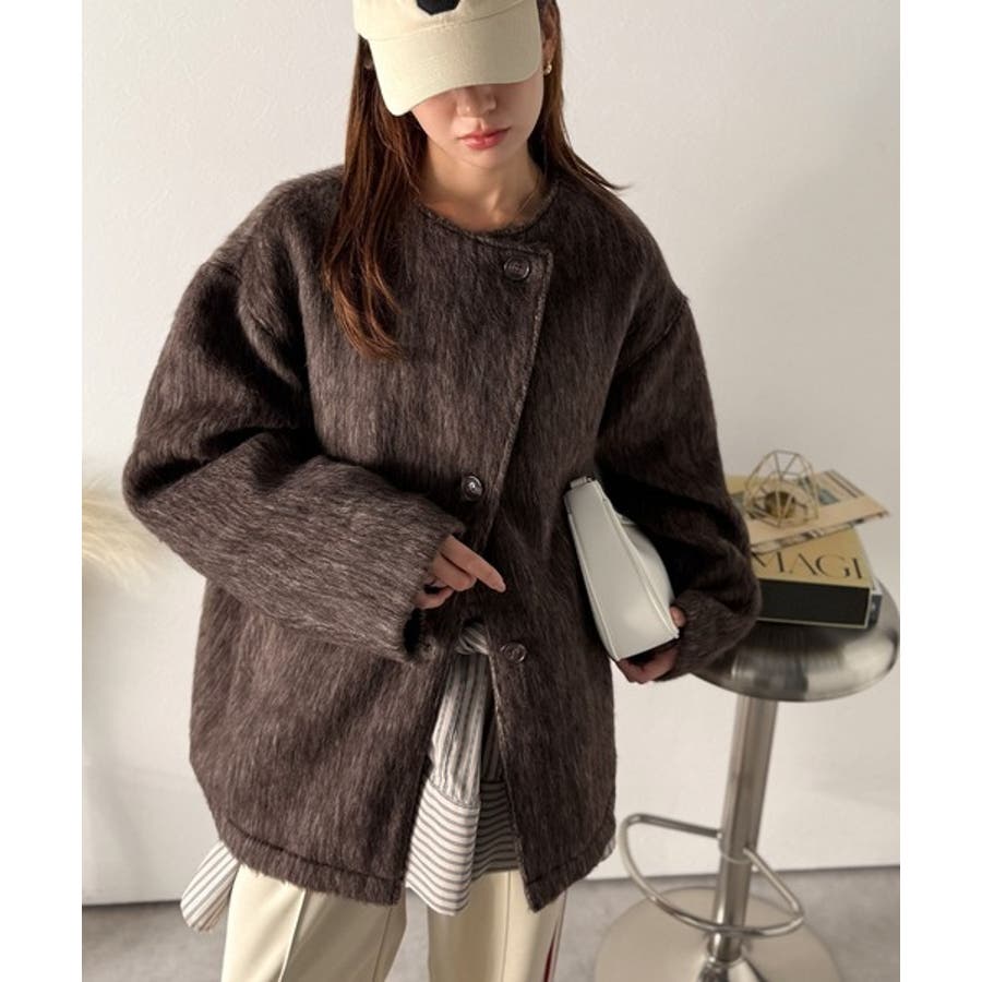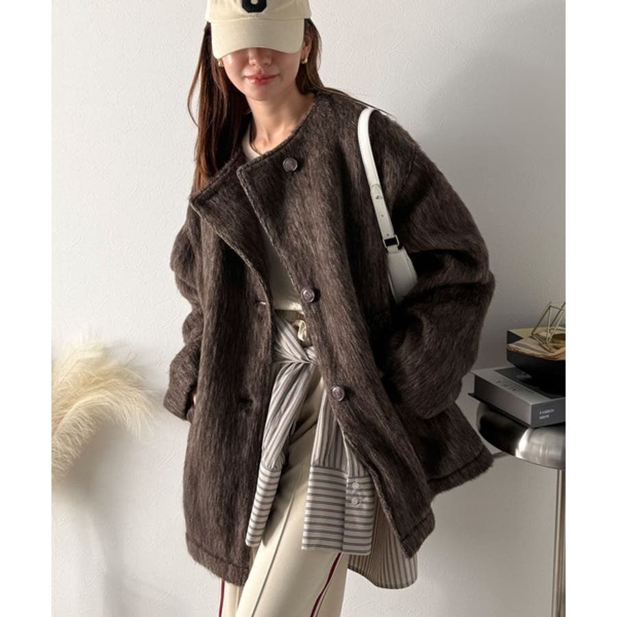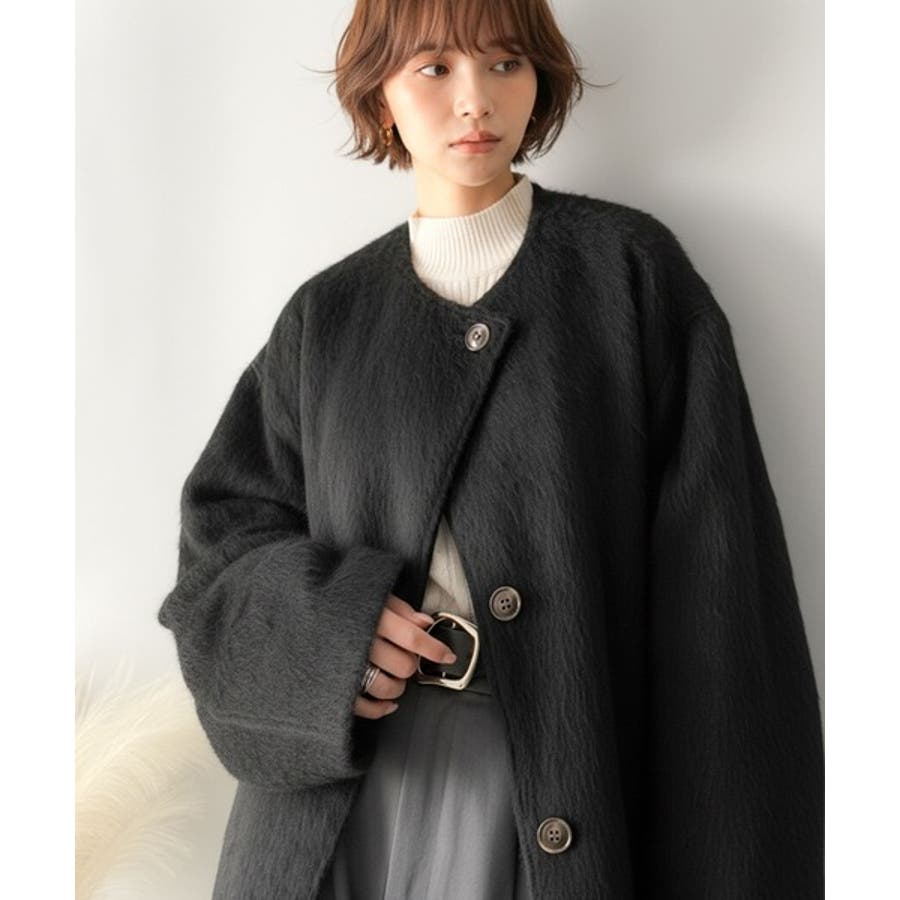 ふんわりとした印象と毛足の流れが美しい、ミックスシャギー素材のノーカラーコート。