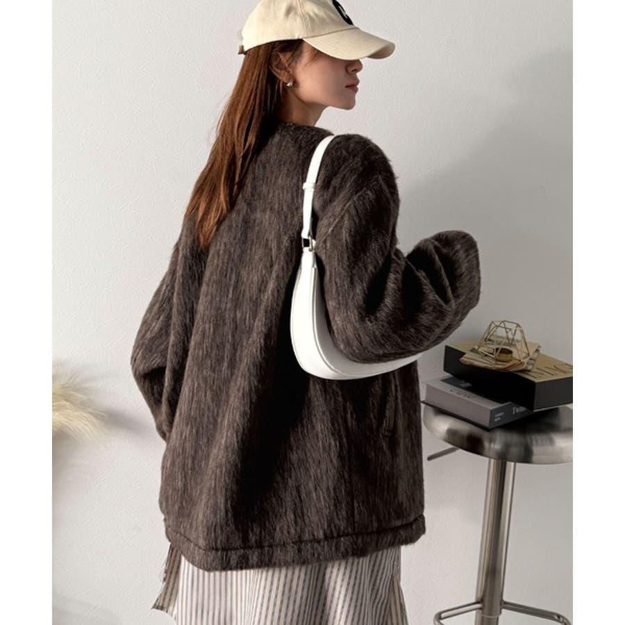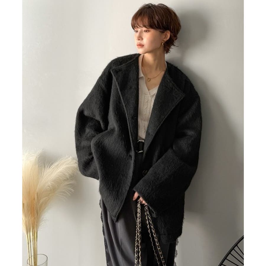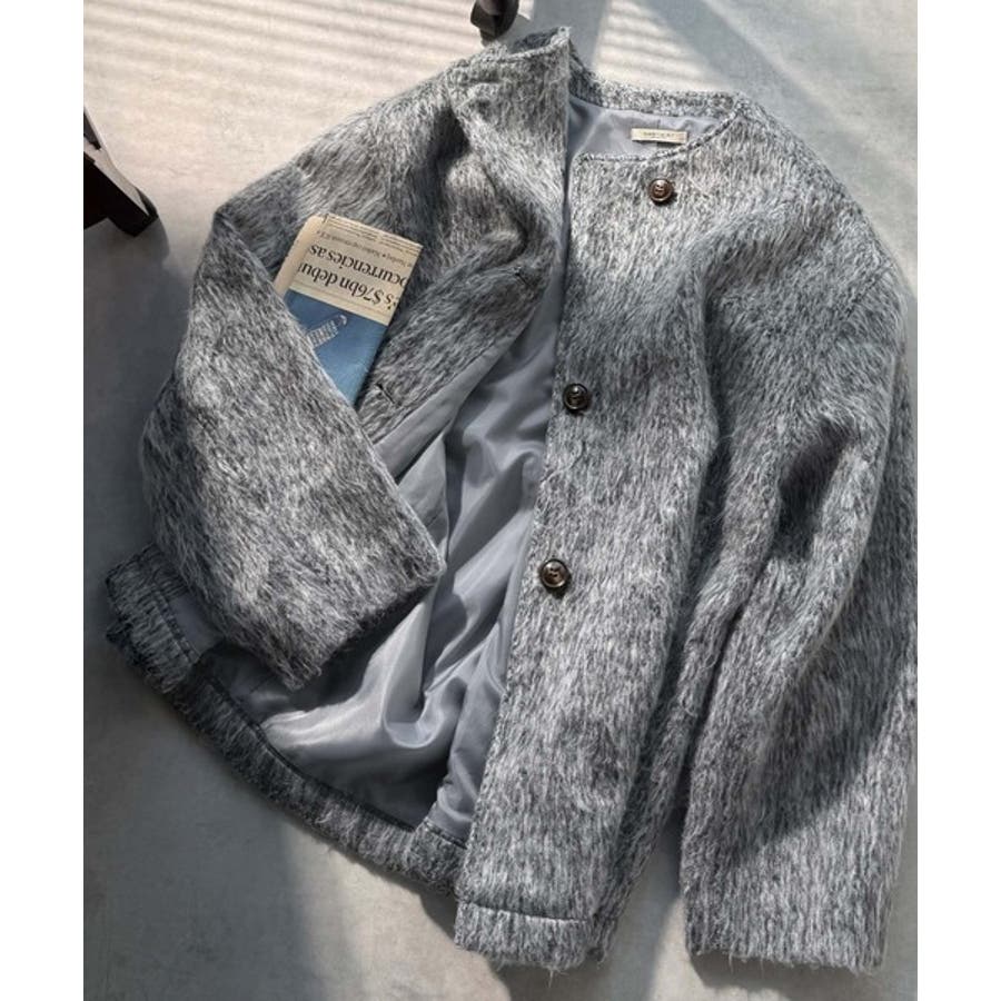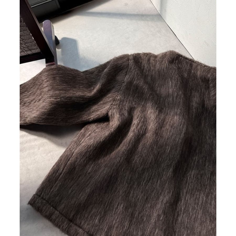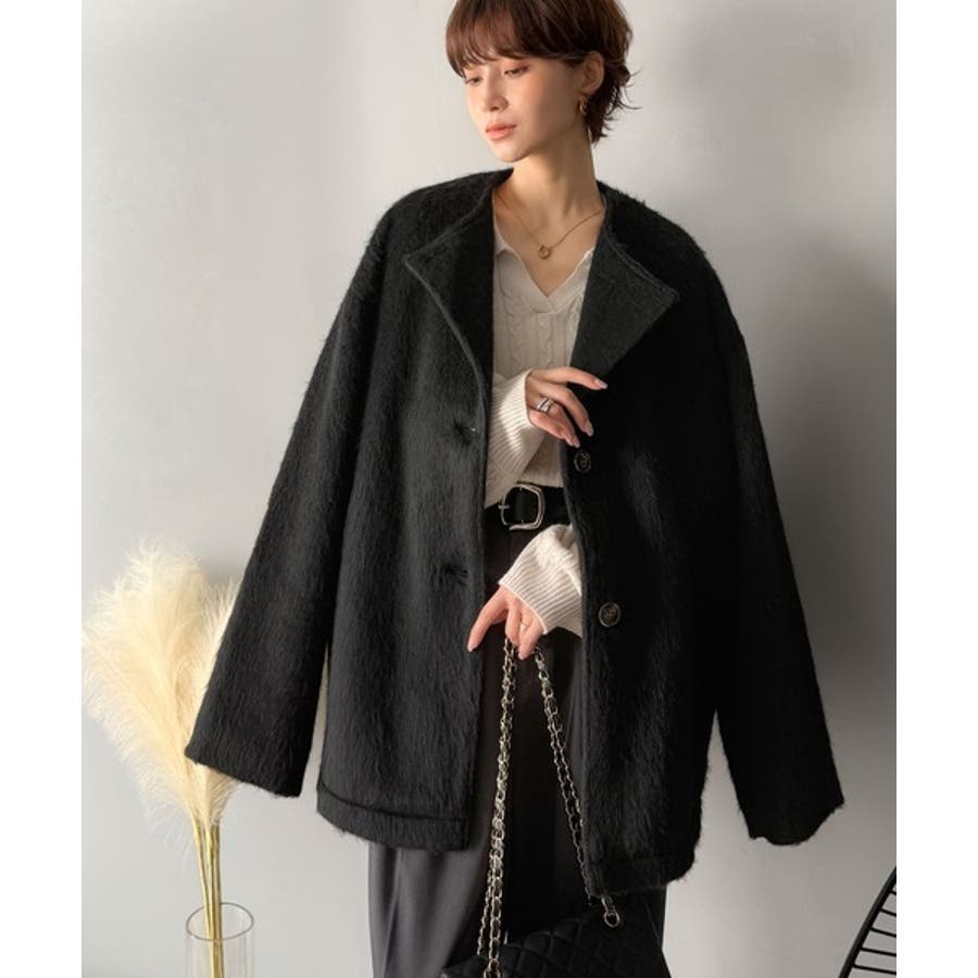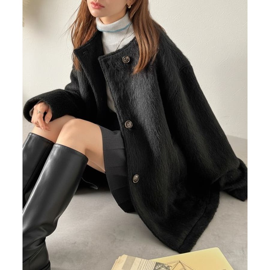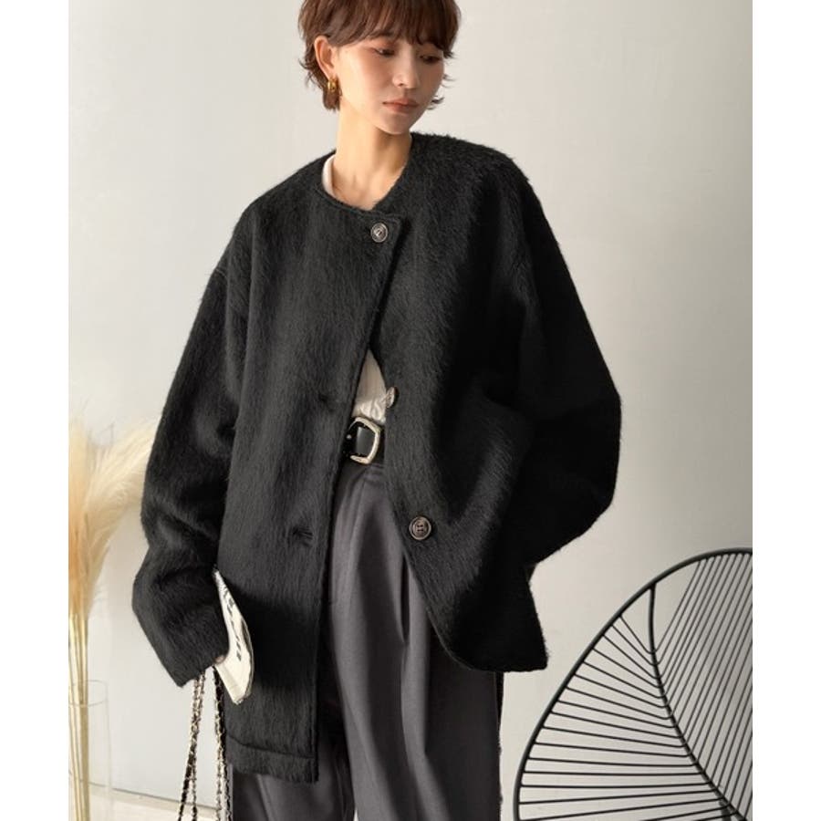 ふんわりとした印象と毛足の流れが美しい、ミックスシャギー素材のノーカラーコート。