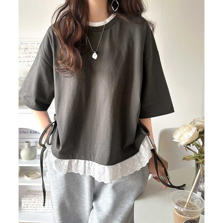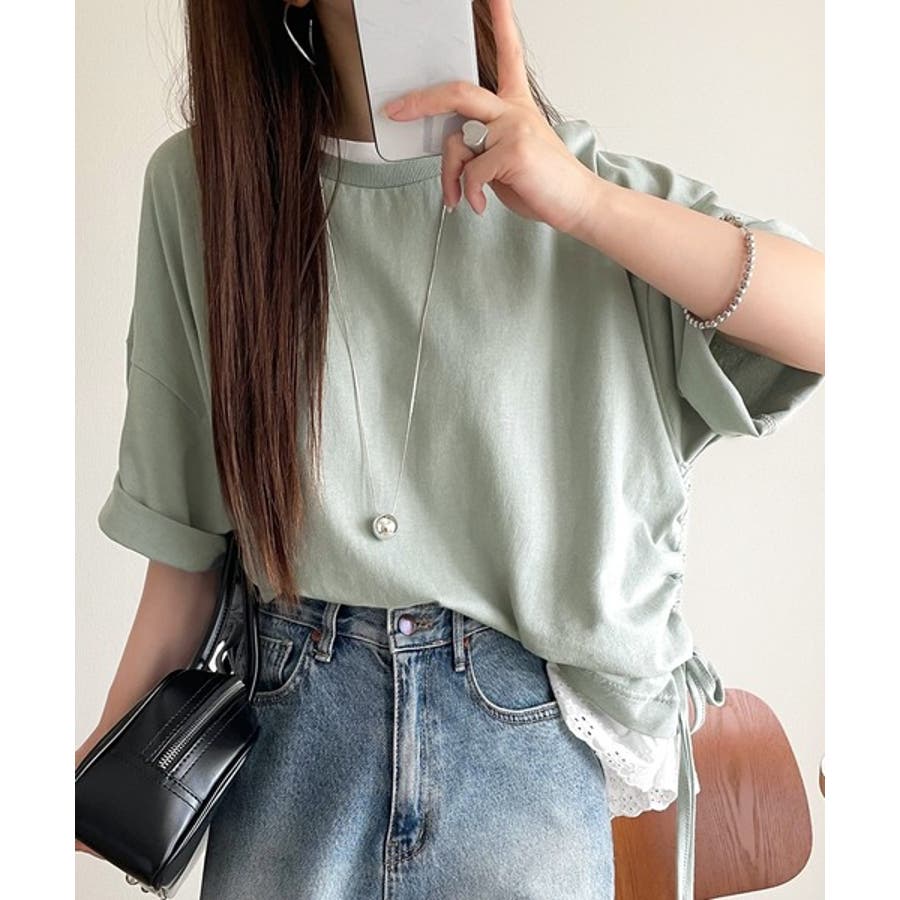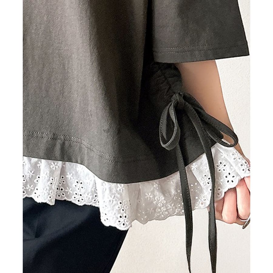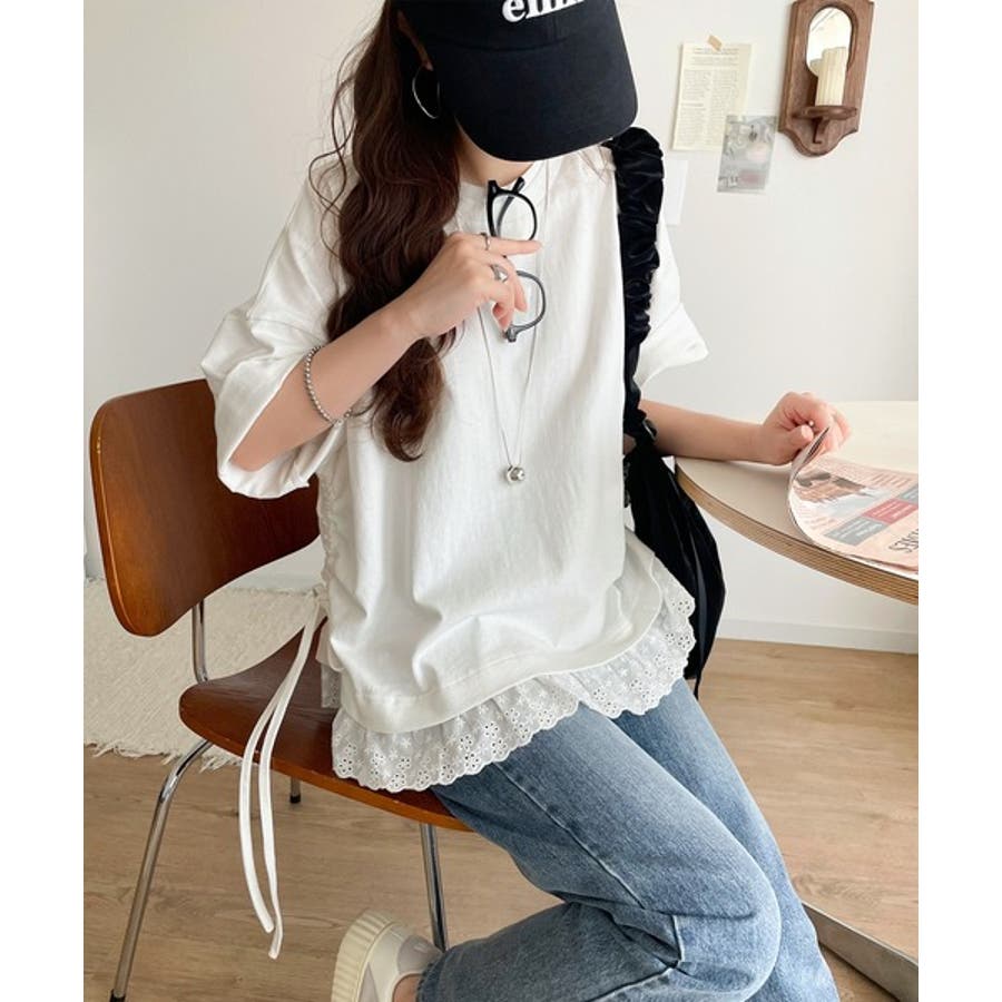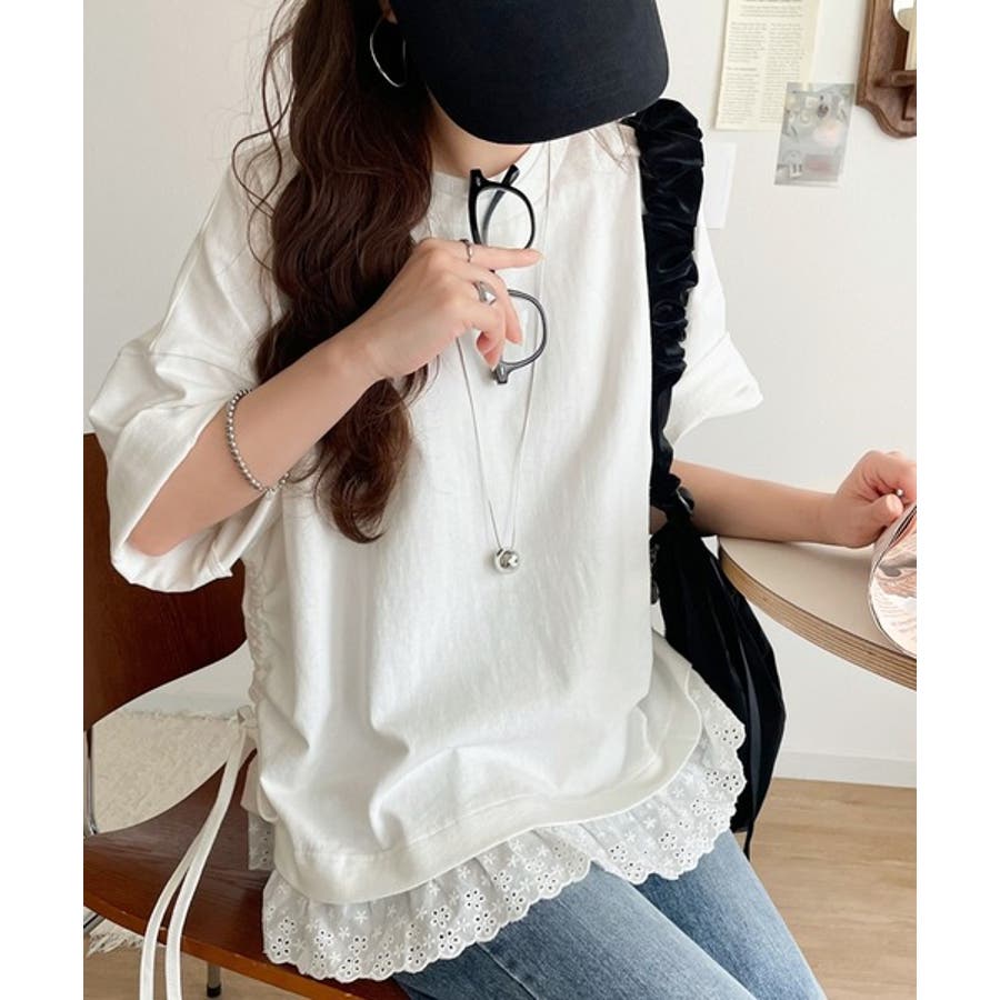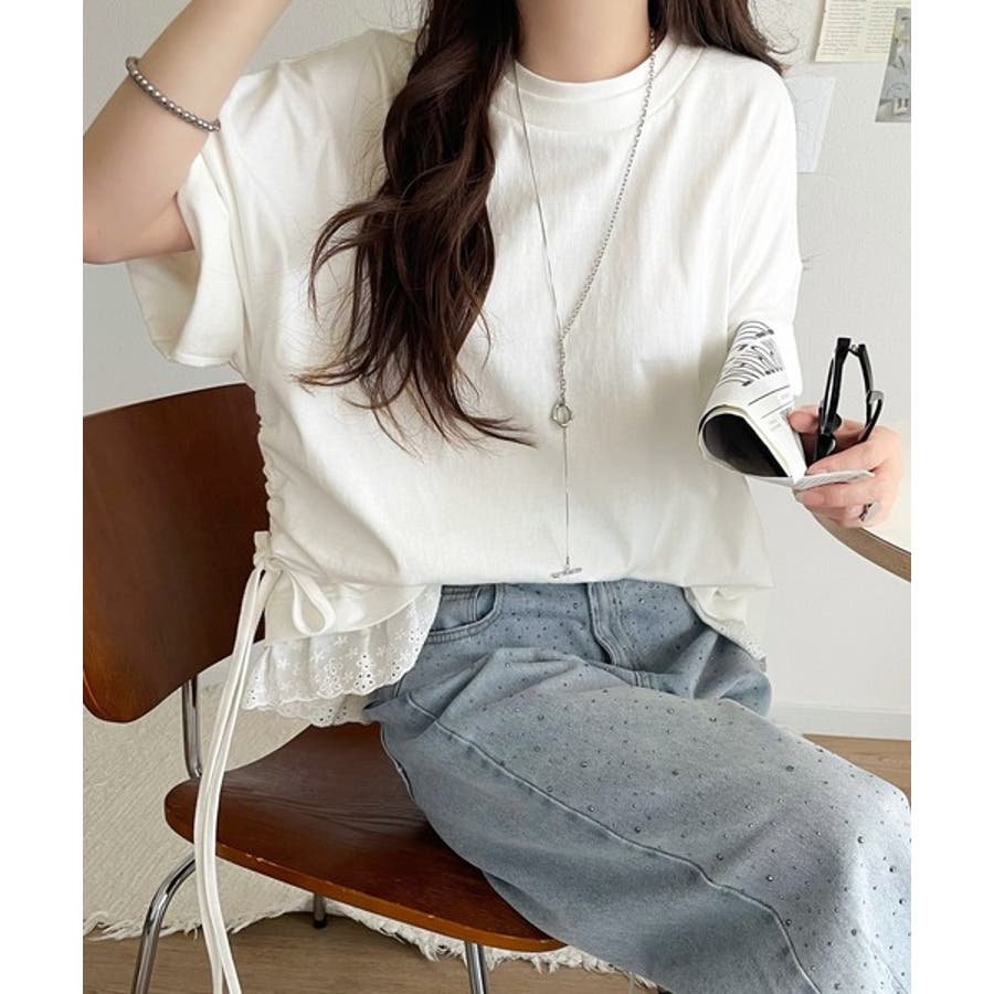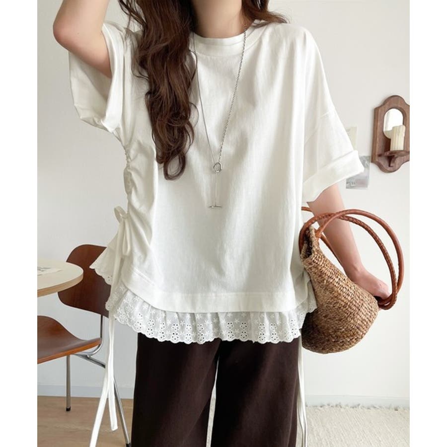 ティシャツ生地でレースがついてる。ワンポイントみたいに裾を絞れるようになっていて可愛いし着やすいしどんなボトムスにも合うのでオフィカジでもいける。