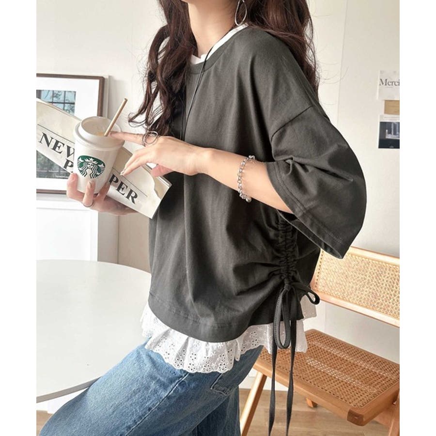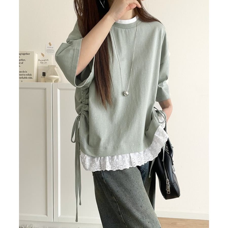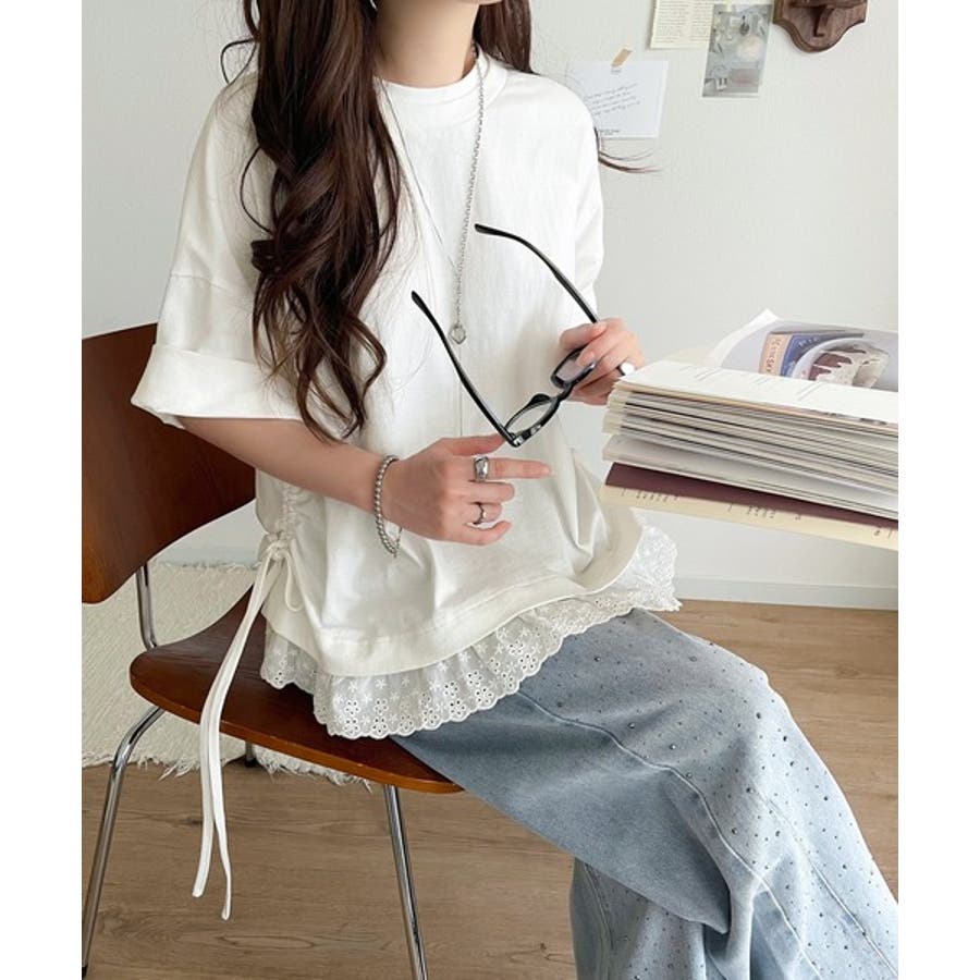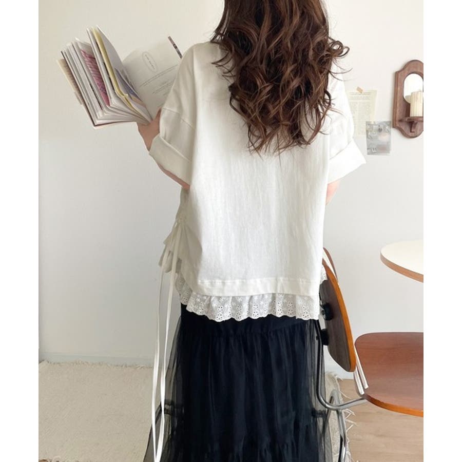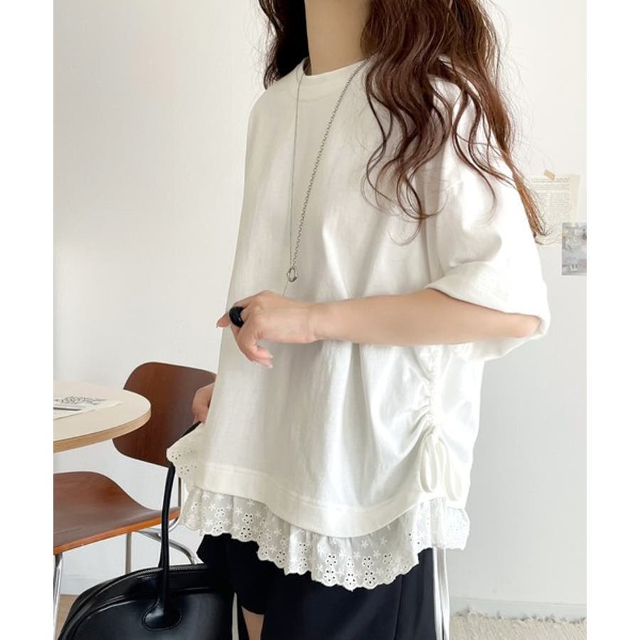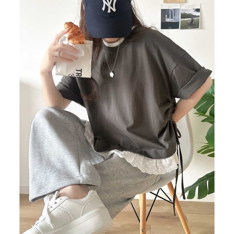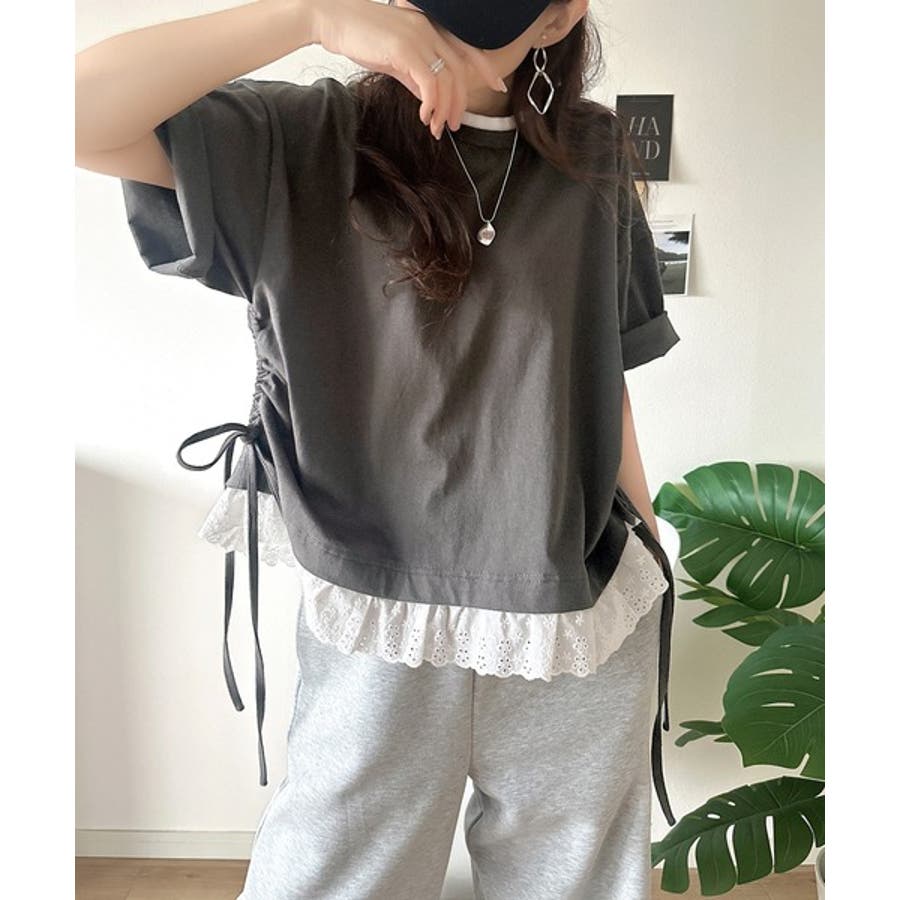 ティシャツ生地でレースがついてる。ワンポイントみたいに裾を絞れるようになっていて可愛いし着やすいしどんなボトムスにも合うのでオフィカジでもいける。