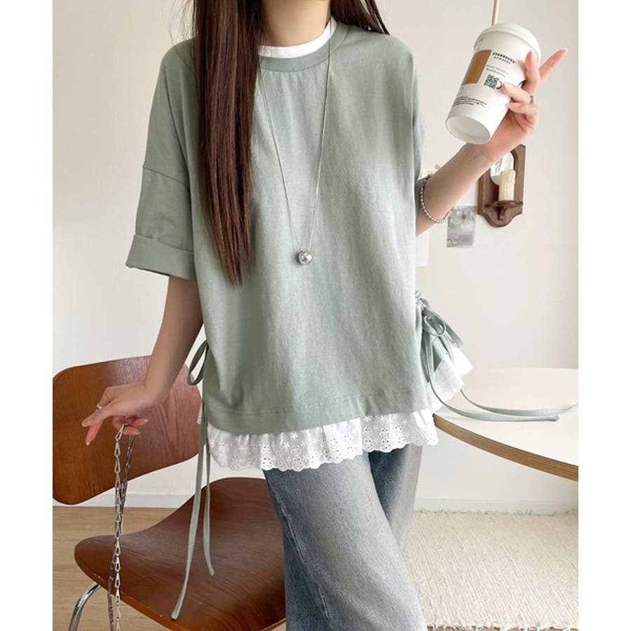 投稿日:2025.08.09デザインに一目惚れして購入しました。重ね着風プラス裾がレースになっていて横も紐で調整出来る可愛いデザインです。淡いグリーンなので色々合わせられそうです。